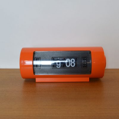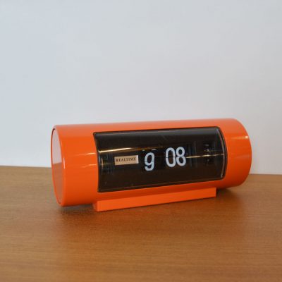 Space Age flip clock Realtime Mod.313, Hongkong 1970’s. Electric Flip clock in orange. Professionally serviced, cleaned and oiled. This vintage item is not functional. Perfect decoration choice.