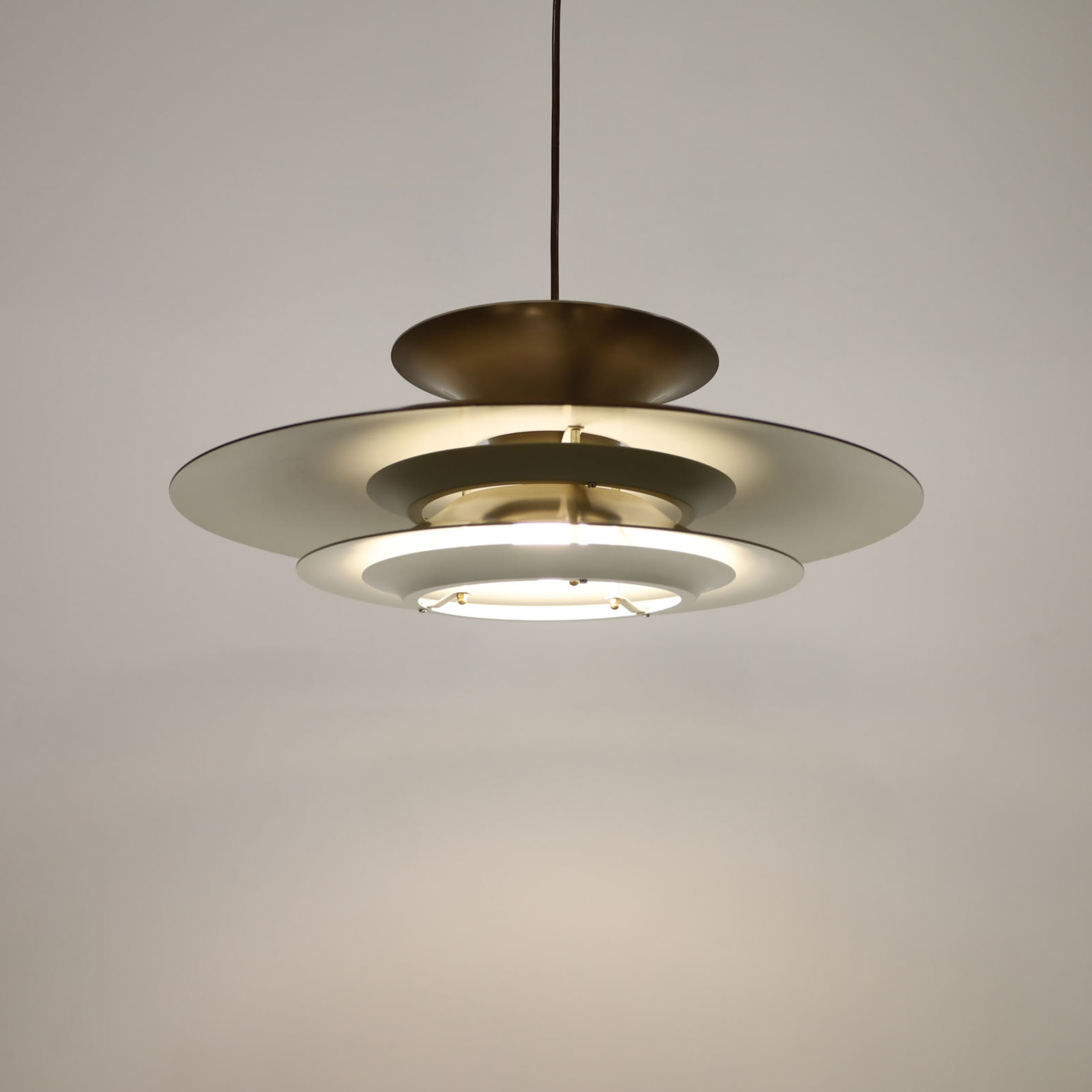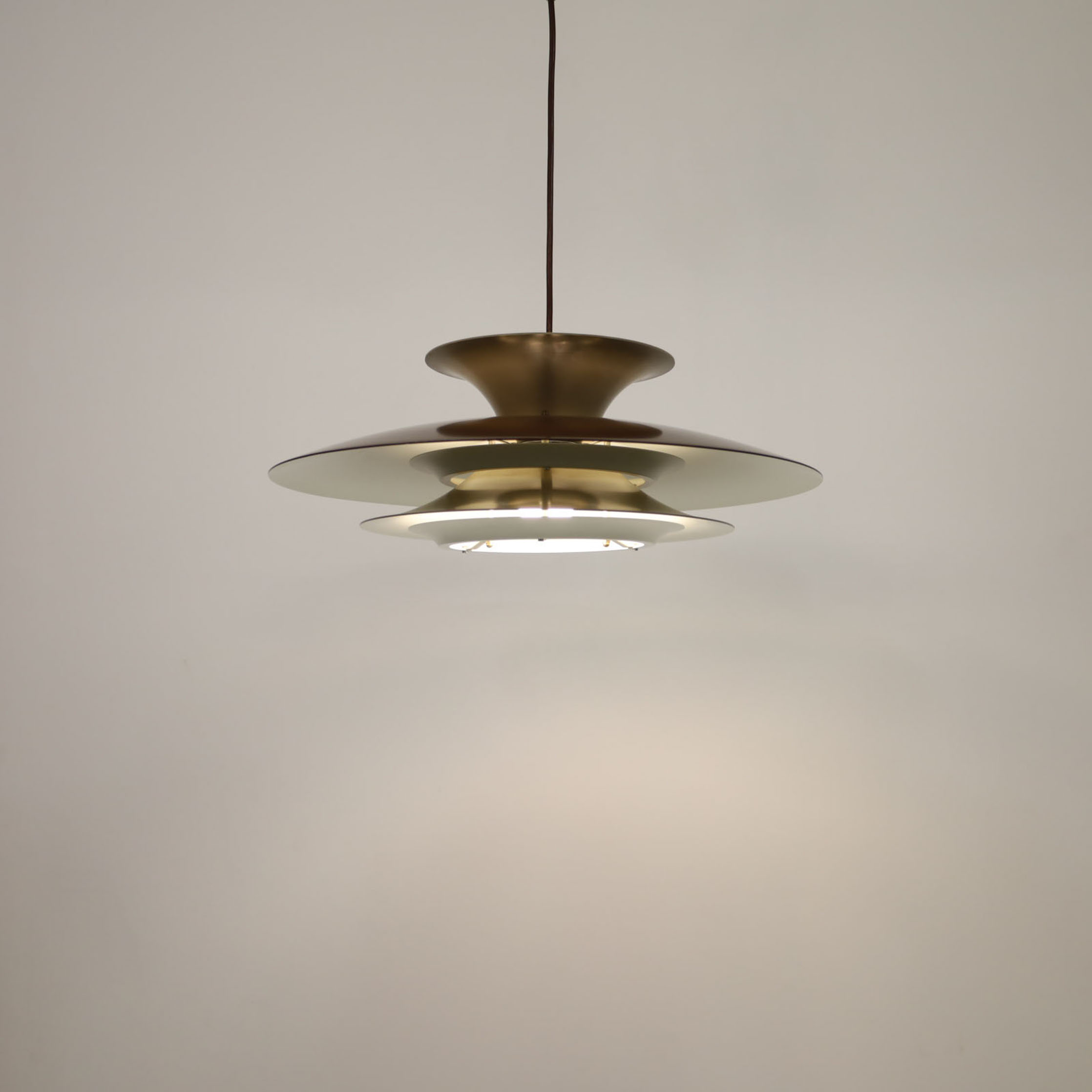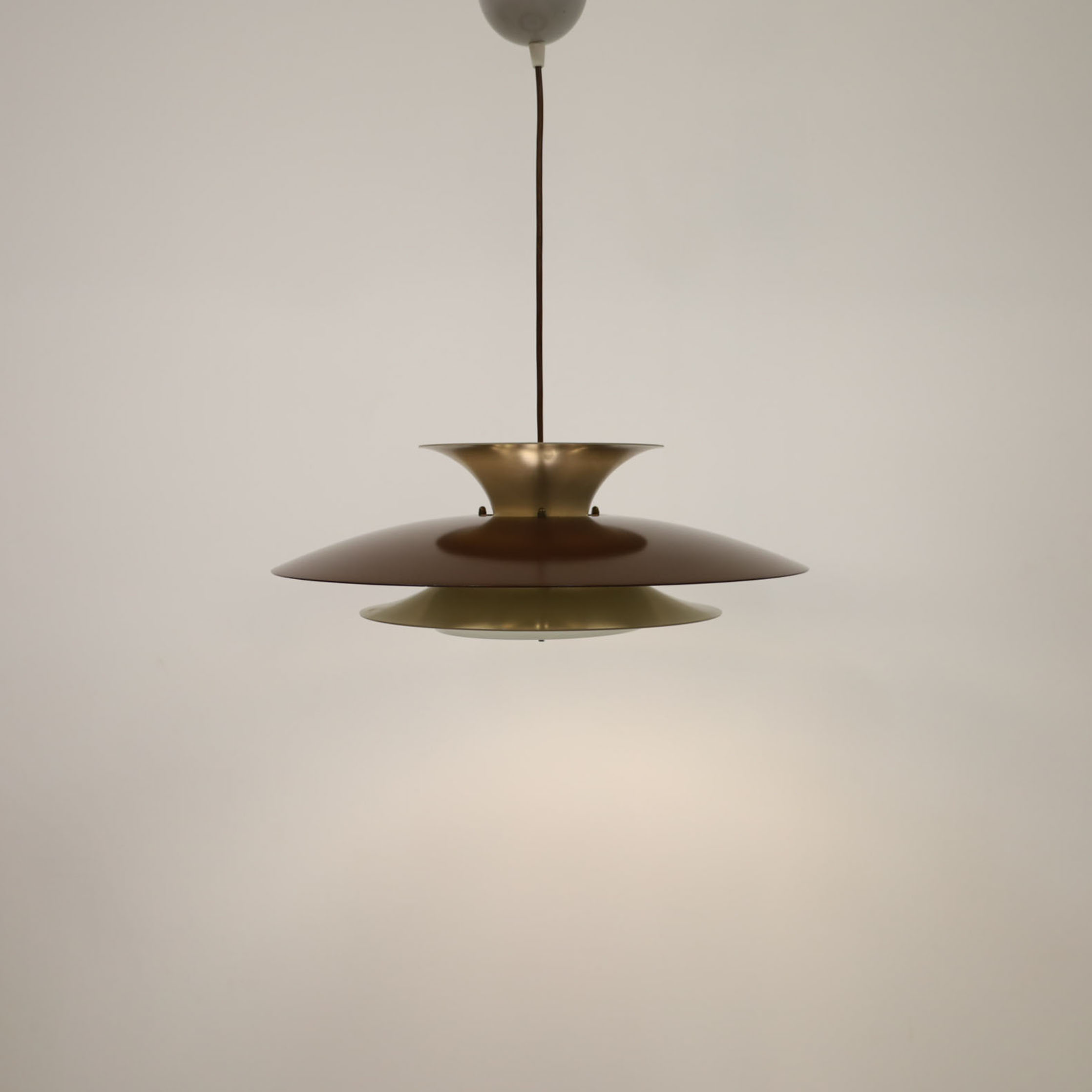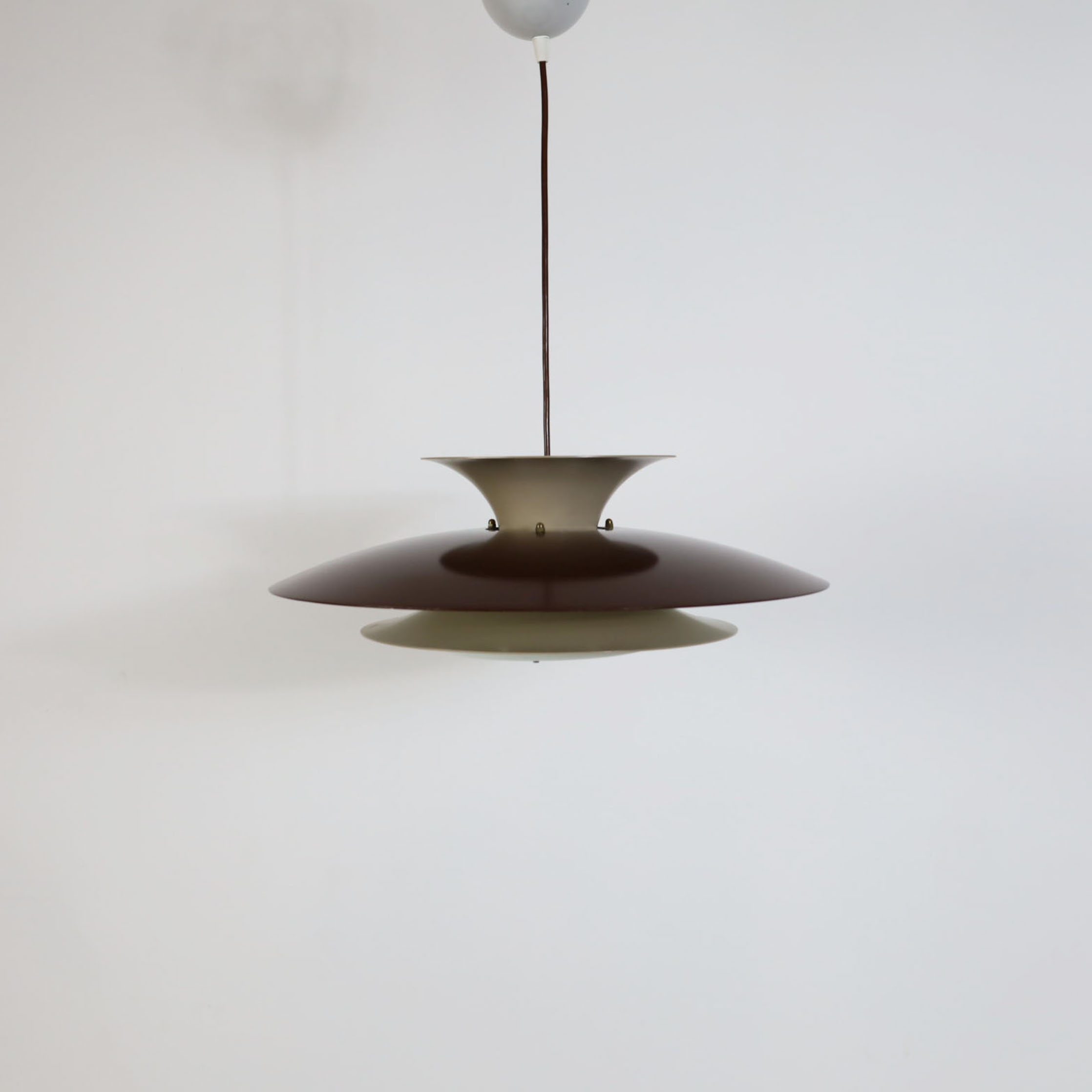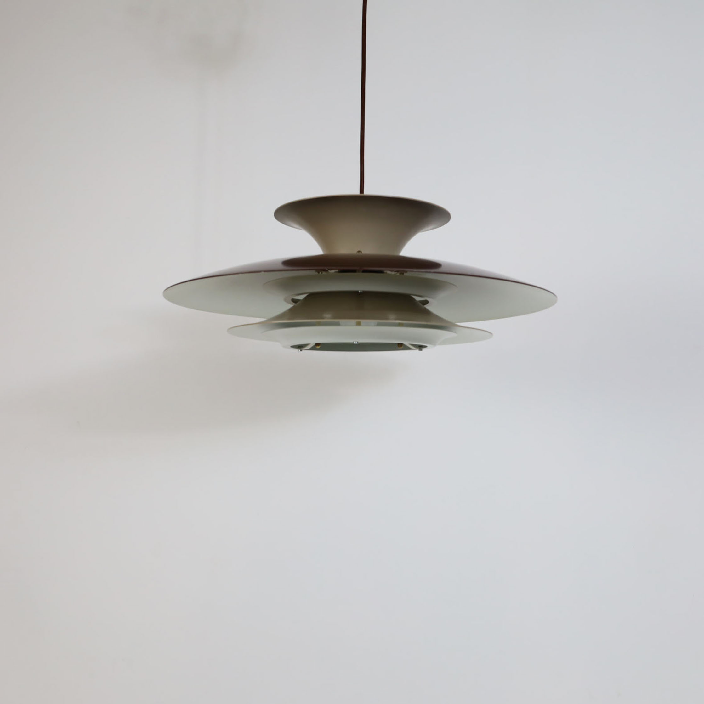 Elegant Danish pendant lamp, meticulously crafted in Denmark, boasts a sophisticated multi-shade design with four distinct layers. This innovative construction features a reflective surface on each layer, enhancing the lamp’s aesthetic appeal. The white scales on the underside of the shades have been thoughtfully incorporated to ensure a gentle and uniform distribution of light. This vintage masterpiece has been fully refurbished, now equipped with energy-efficient LED technology, and comes with a European plug for your convenience. It is in impeccable vintage condition, ready to adorn your space with its timeless charm.