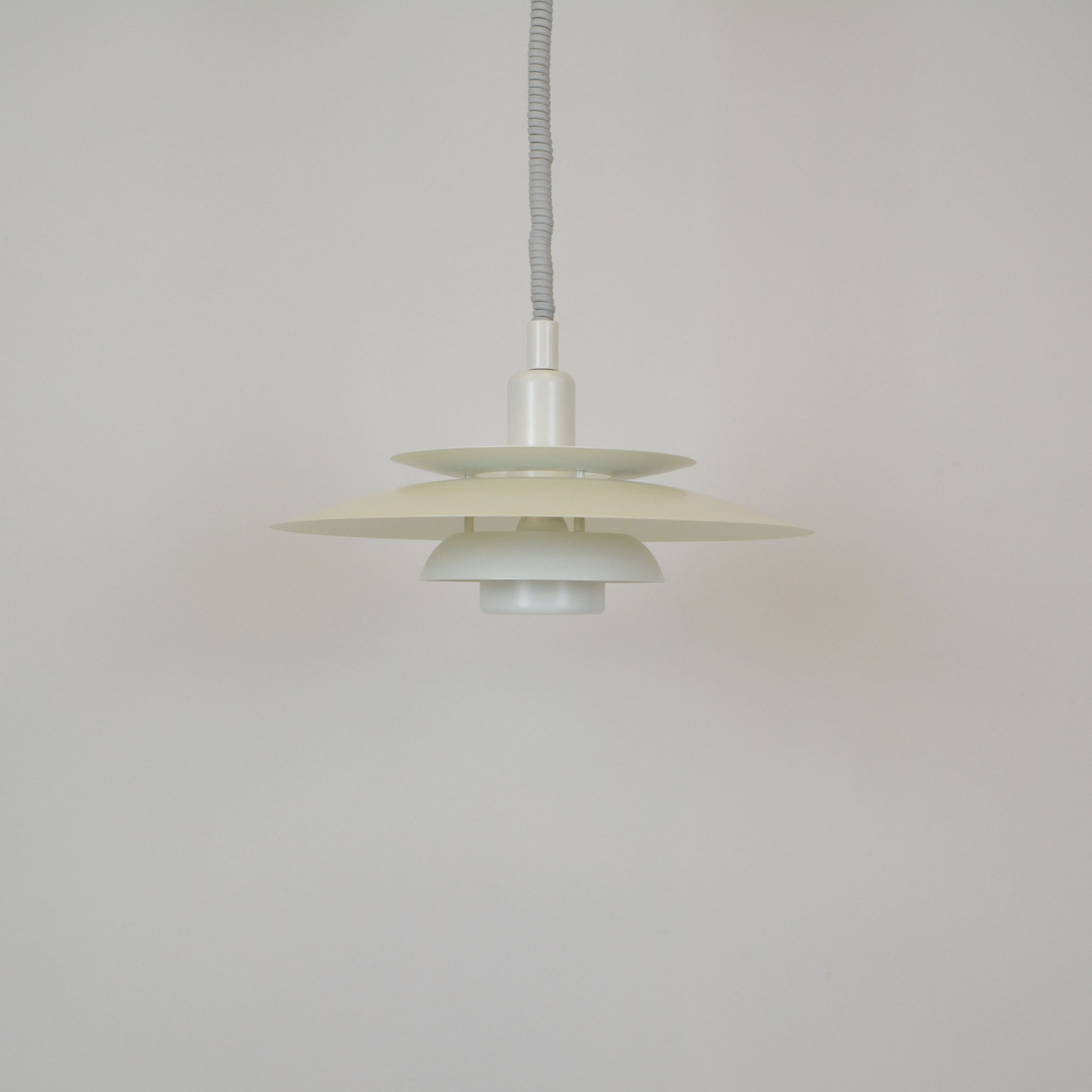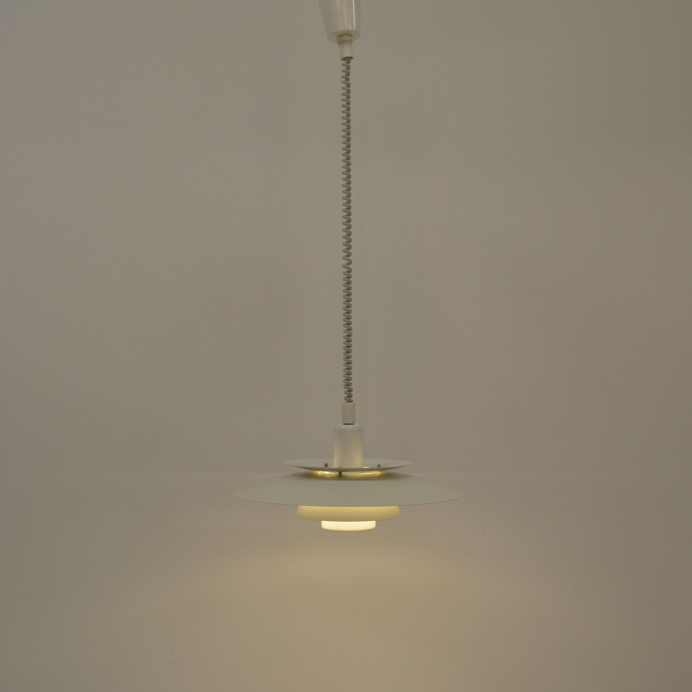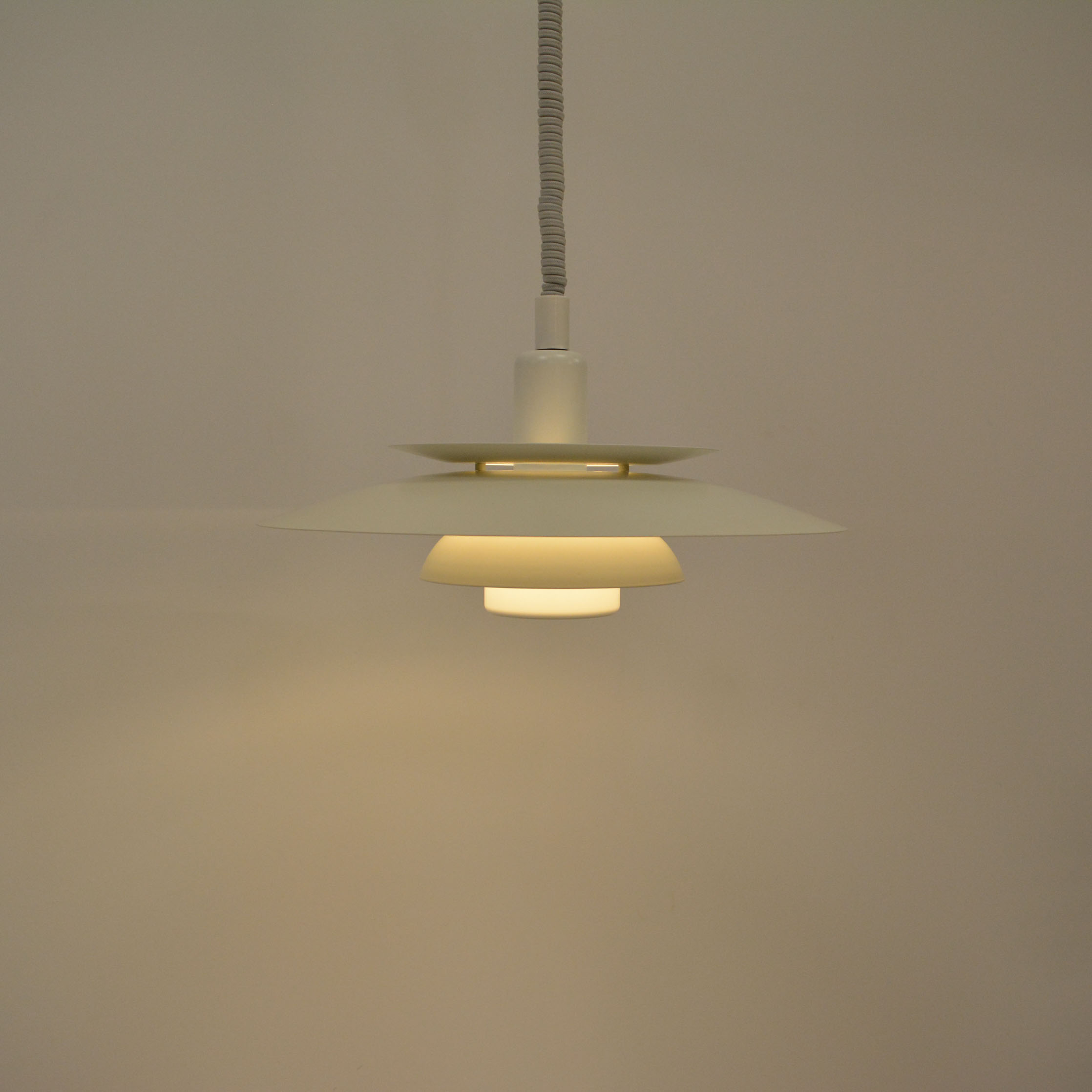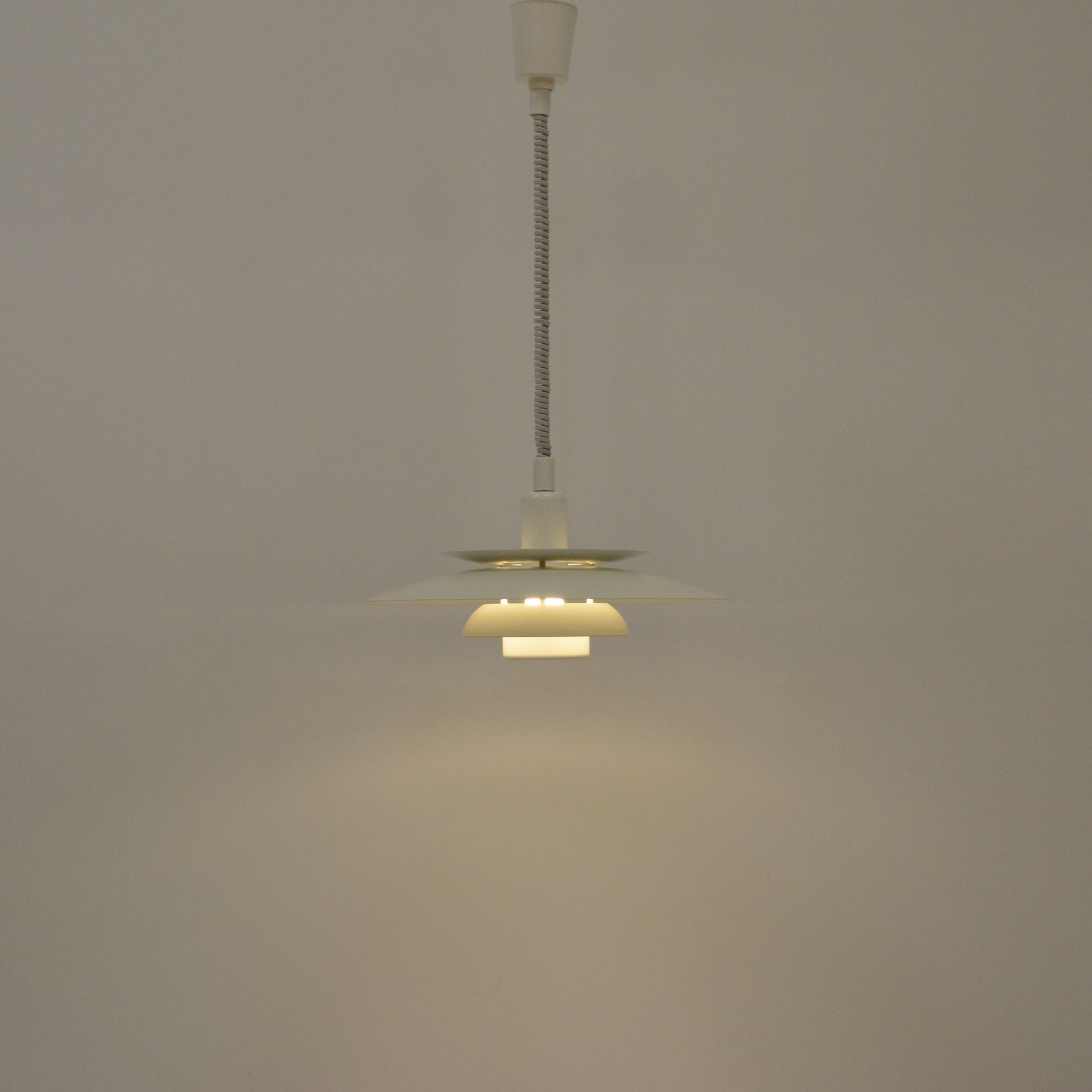 Danish pendant lamp, manufactured in Denmark by Simon P. Henningsen for Lyskær Belysning on four separate layers on a reflective multi-shade system with white scales on the underside so that the light distribution is soft and even. Features an easy-to-pull down and backward spiral cable which allows you to vary the intensity of the light at any time with simplicity. Fully remanufactured with LED technology, European Plug —In excellent vintage condition.