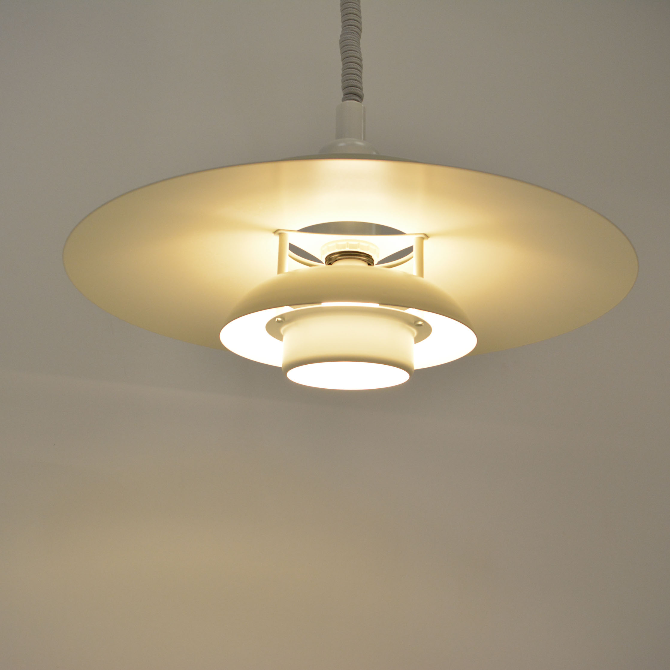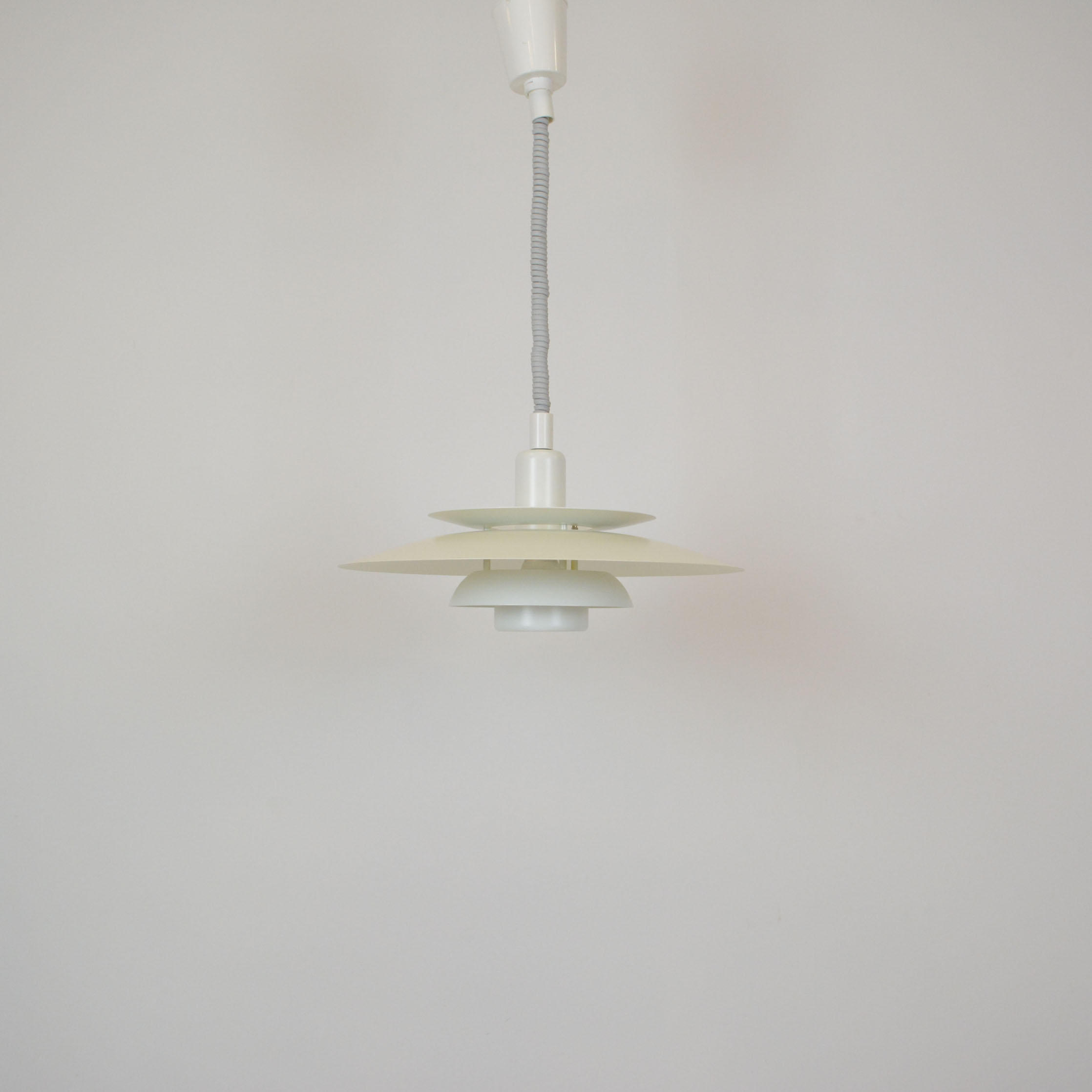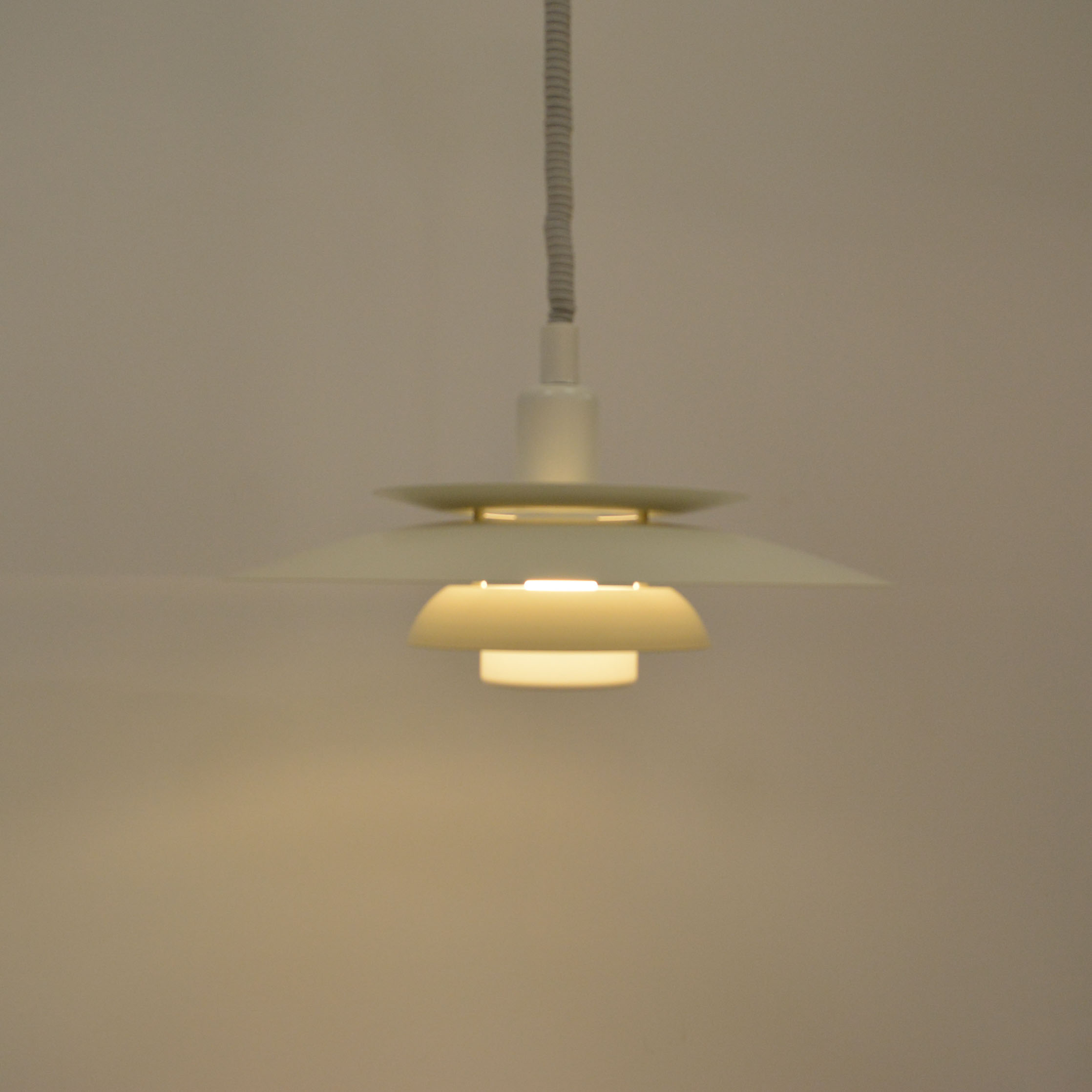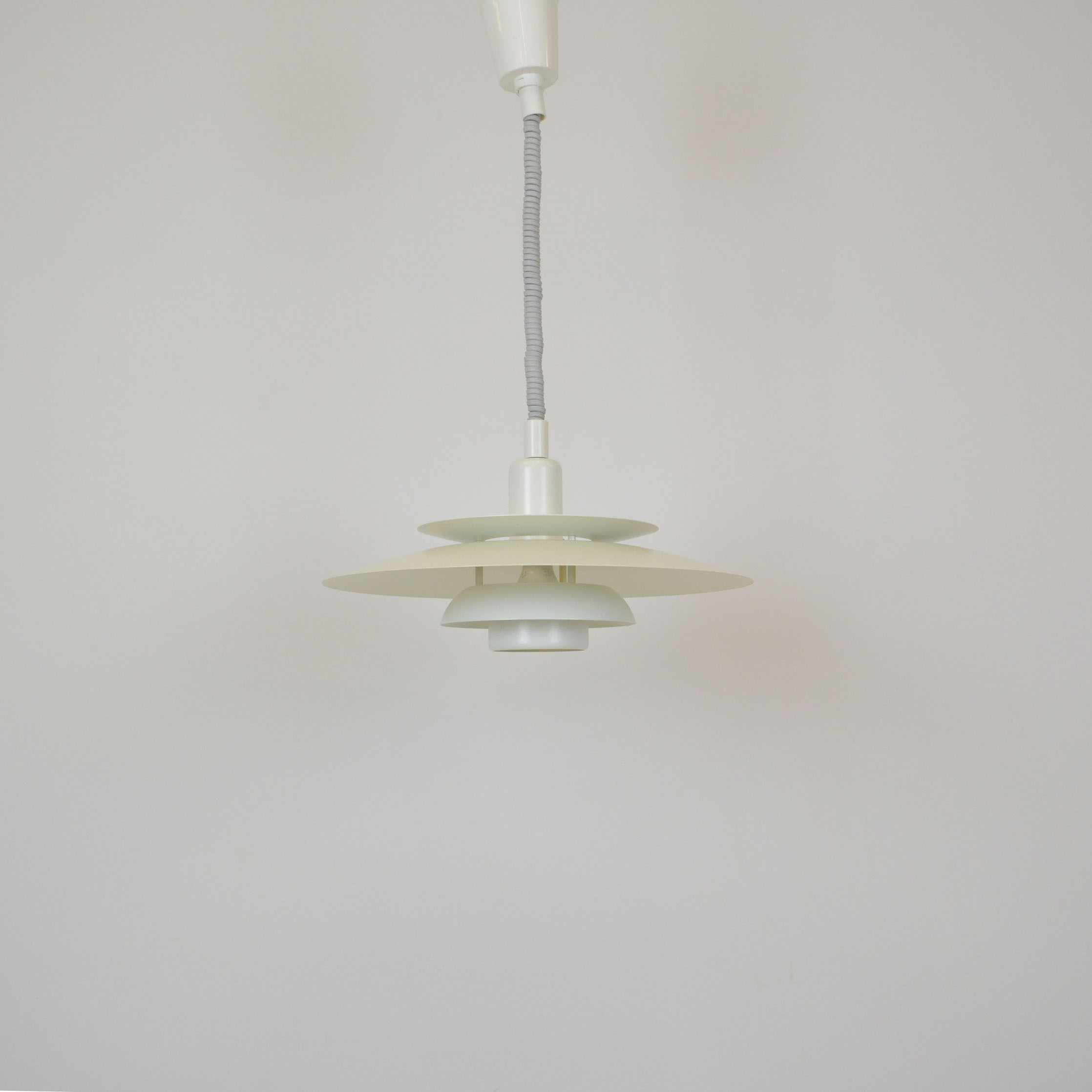 Danish pendant lamp, manufactured in Denmark by Simon P. Henningsen for Lyskær Belysning on four separate layers on a reflective multi-shade system with white scales on the underside so that the light distribution is soft and even. Features an easy-to-pull down and backward spiral cable which allows you to vary the intensity of the light at any time with simplicity. Fully remanufactured with LED technology, European Plug —In excellent vintage condition.