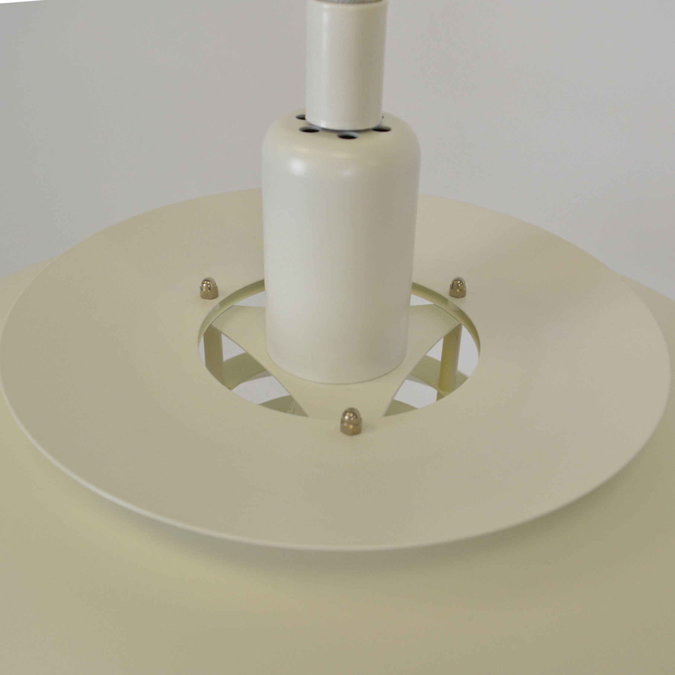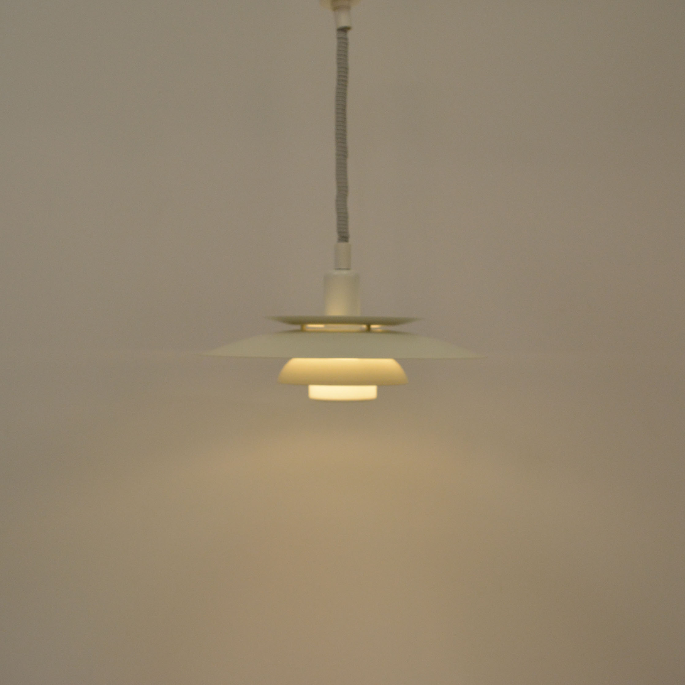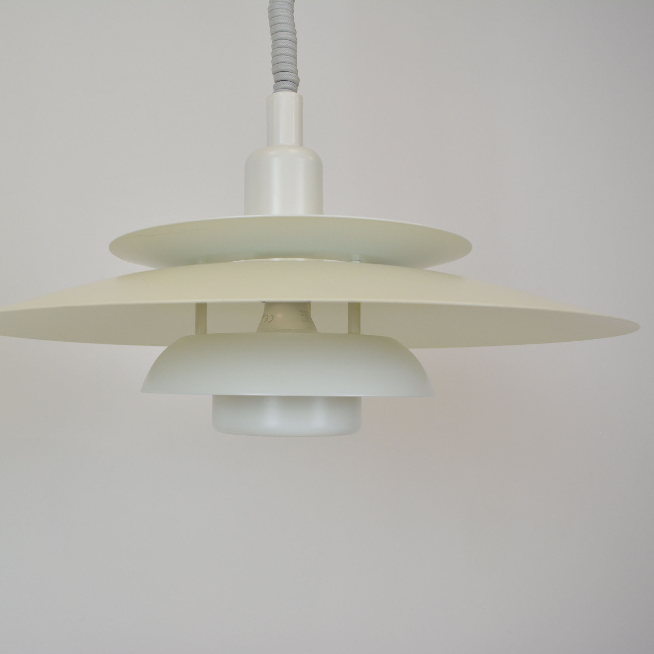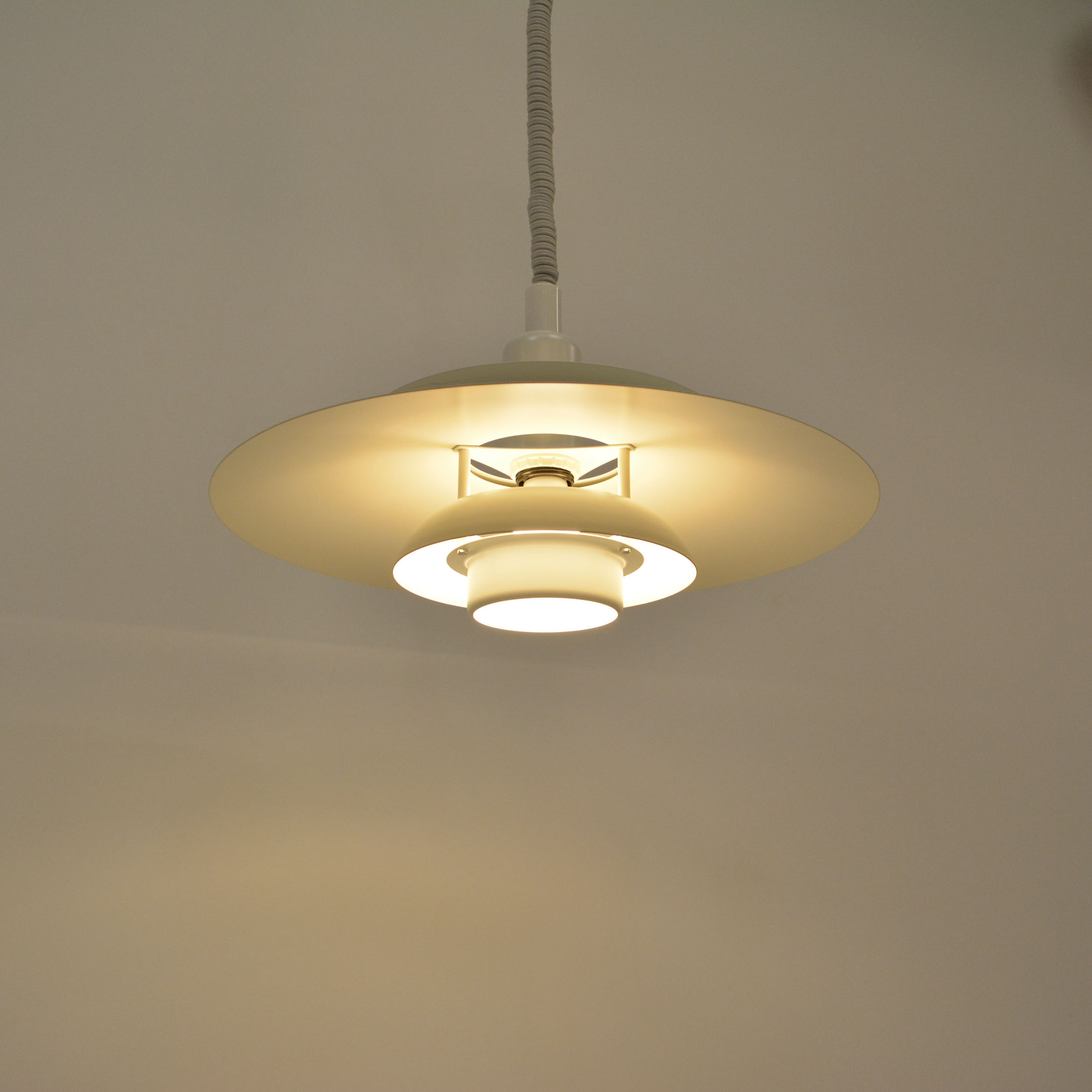 Danish pendant lamp, manufactured in Denmark by Simon P. Henningsen for Lyskær Belysning on four separate layers on a reflective multi-shade system with white scales on the underside so that the light distribution is soft and even. Features an easy-to-pull down and backward spiral cable which allows you to vary the intensity of the light at any time with simplicity. Fully remanufactured with LED technology, European Plug —In excellent vintage condition.