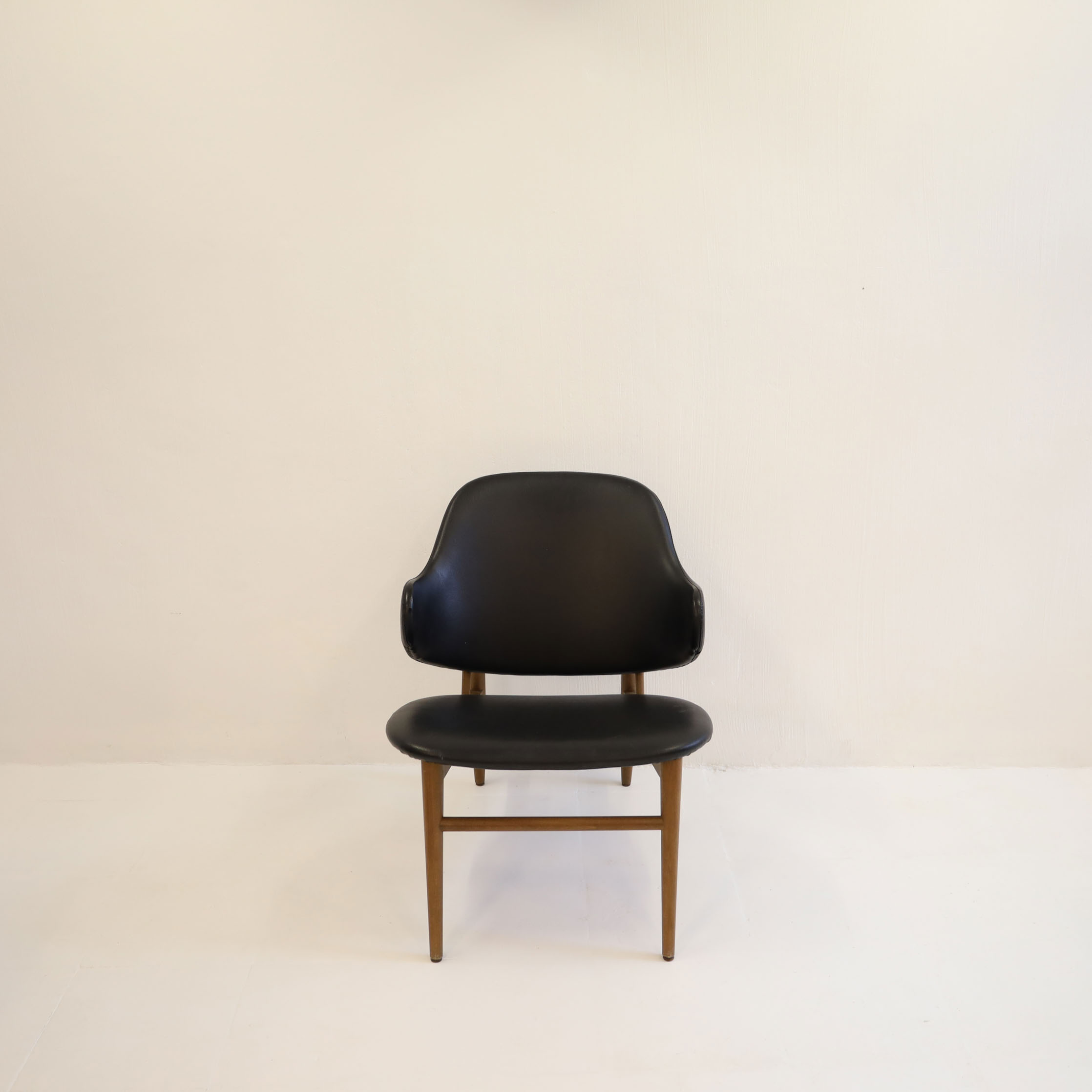 This lounge chair combines modern design with classic comfort, featuring a sleek leatherette finish. The chair’s frame is constructed from wood, with slightly angled legs that provide stability and a touch of mid-century modern flair. The seat and backrest are generously padded and upholstered in black leatherette, offering a luxurious look and feel while being easy to maintain. The backrest is curved to support the natural shape of your back, and it extends into armrests that curve upwards for added comfort. The overall design is both elegant and functional, making it an excellent choice for various settings, such as living rooms, lounges, or home offices.