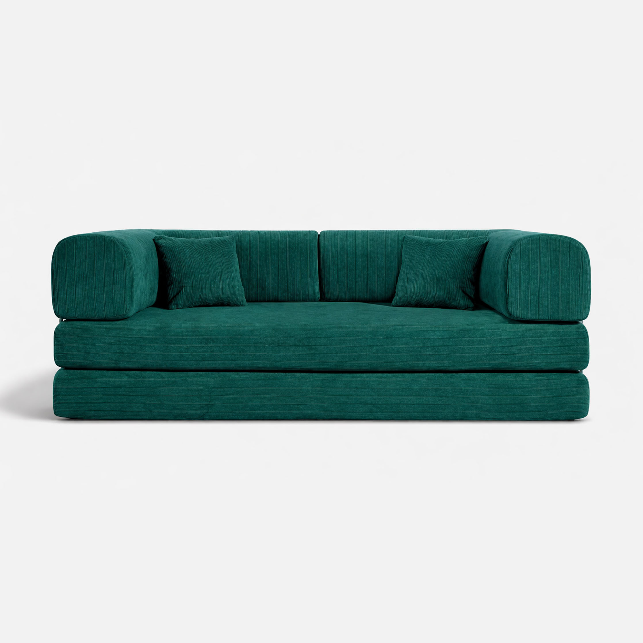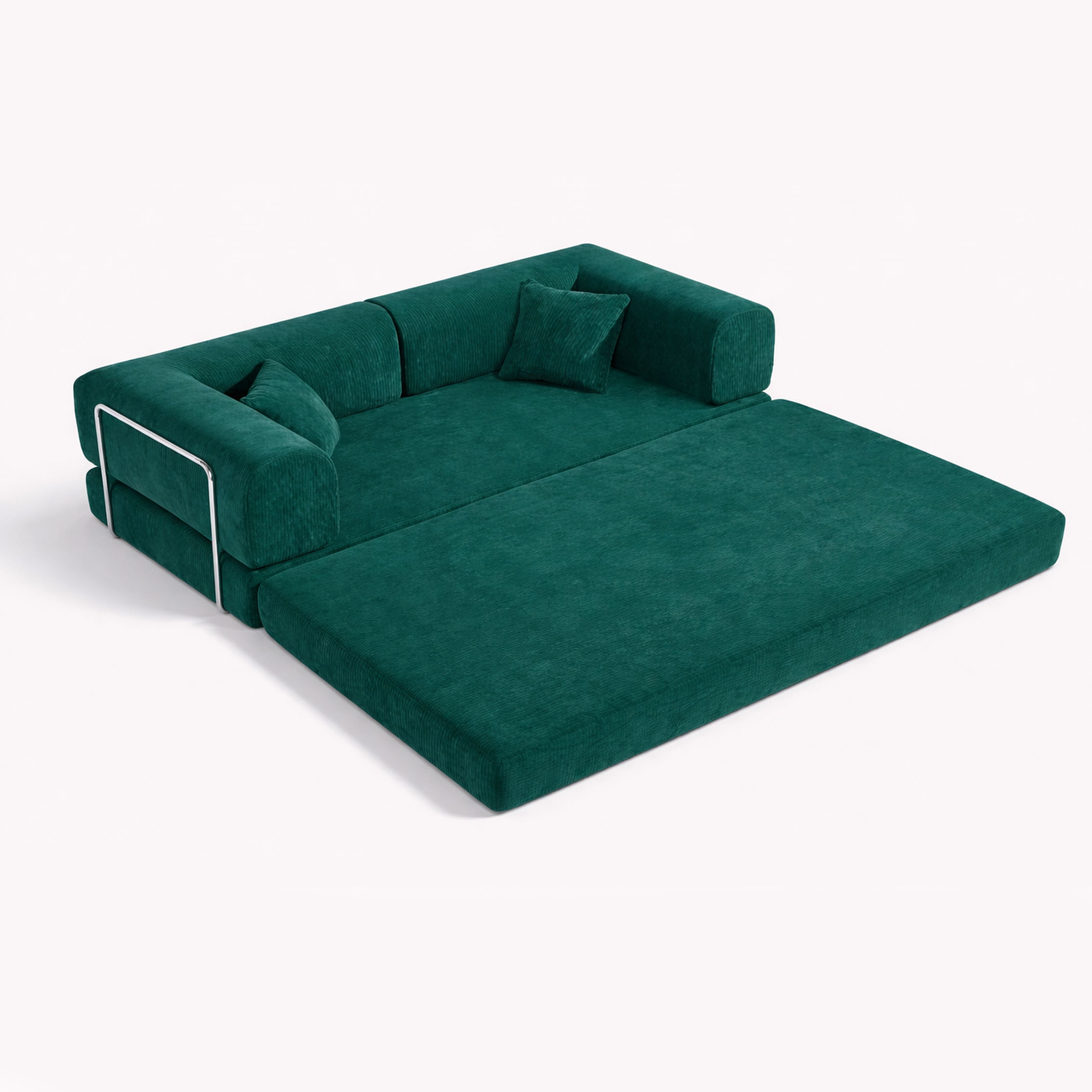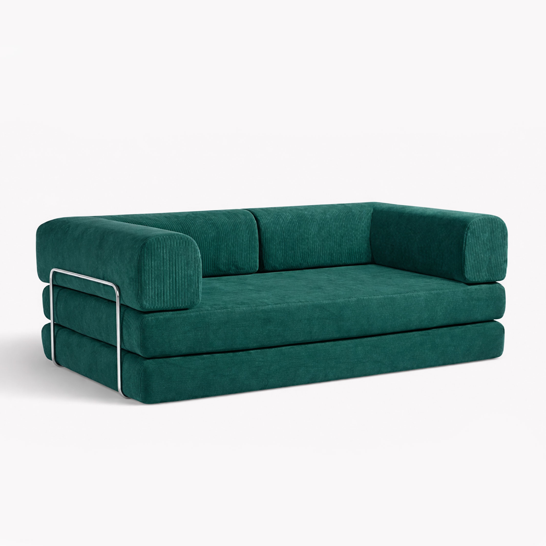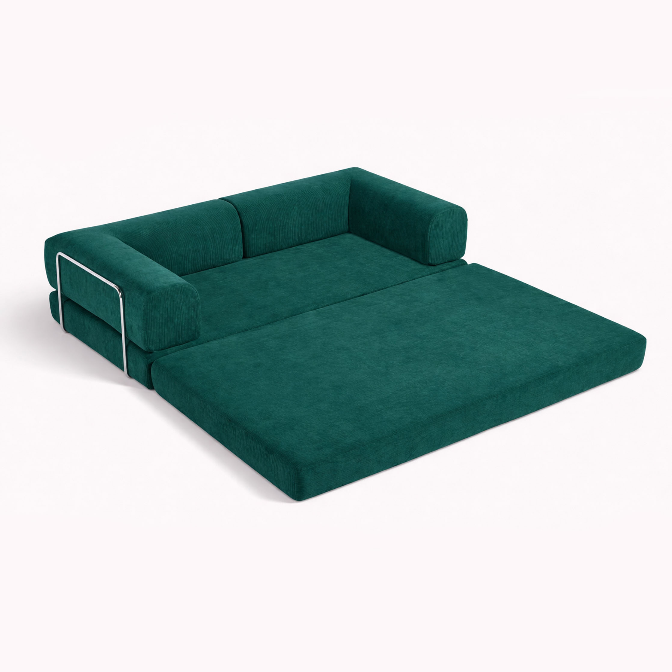 Modern convertible sofa bed upholstered in durable corduroy fabric in a deep emerald green tone. The design combines soft rounded arms with a minimalist metal side frame, creating a contemporary statement piece suitable for modern interiors. Easily transforms from a comfortable sofa into a spacious bed surface, making it ideal for living rooms, studios, and guest spaces. The corduroy texture adds warmth and depth while maintaining a clean architectural look.