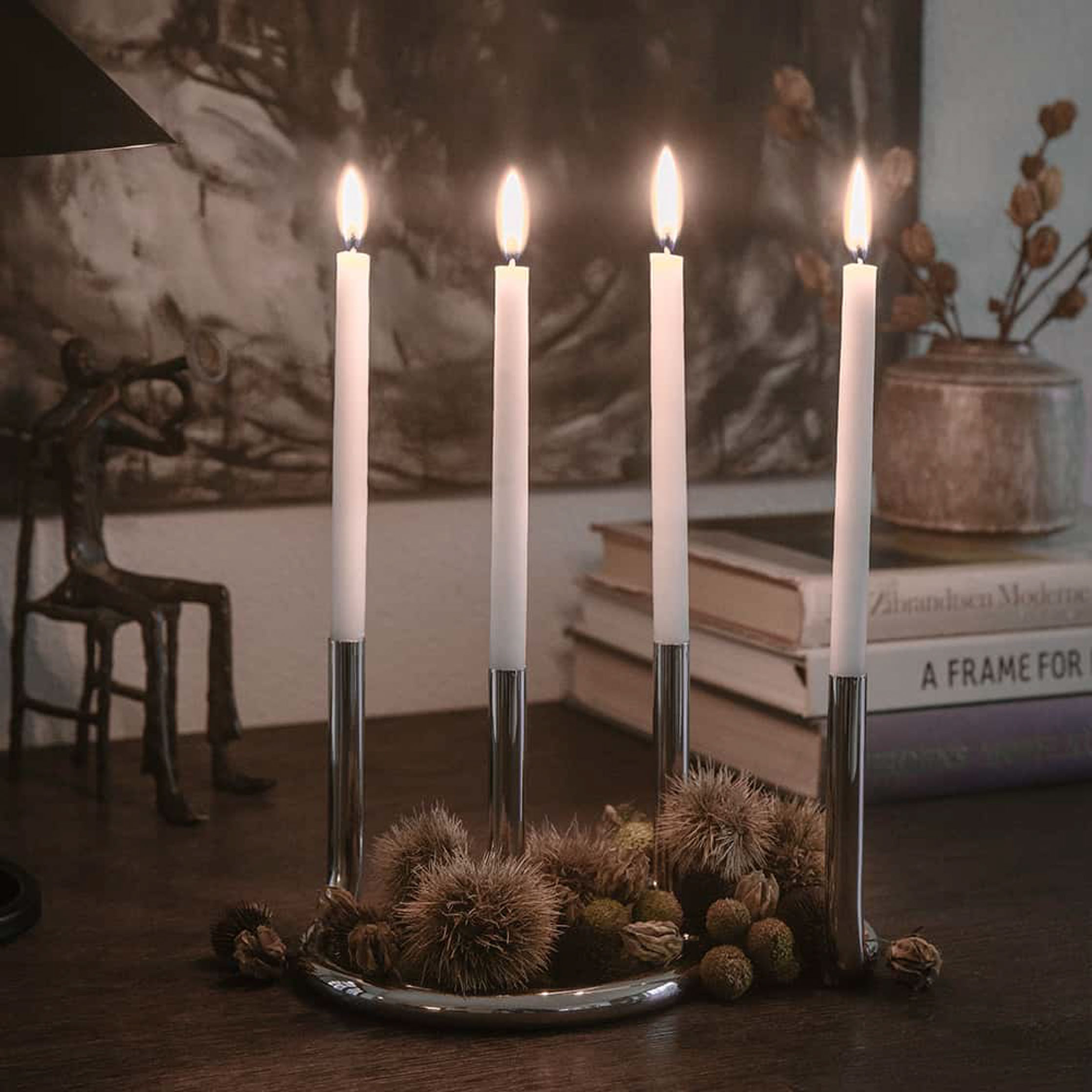 Inspired by the beauty of possibility, Gemini candle holder by Peter Karpf is a perfect marriage of form and function. It was designed precisely to allow for the candles to be the smallest distance apart without falling. Made of solid stainless steel. It can hold two handmade candles with the optimal burning time of 4 hours. (candles are not including)