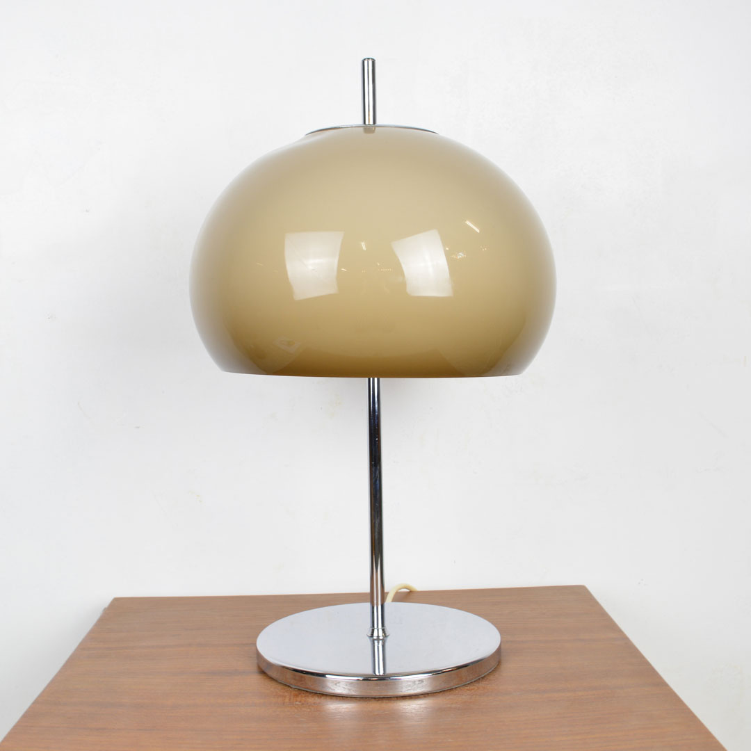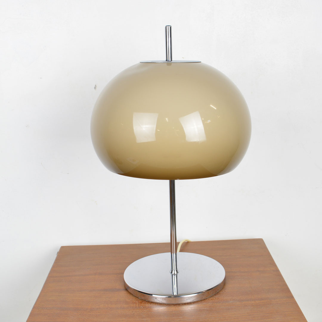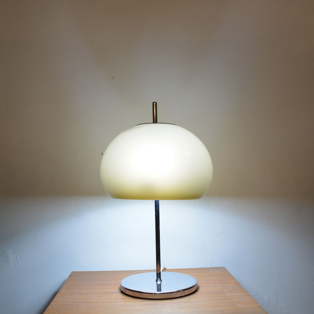 Vintage 1970s iconic Guzzini Mushroom table lamp. Chrome stand and a beige shade. Fully remanufactured, with LED technology and European Plug. In excellent vintage condition