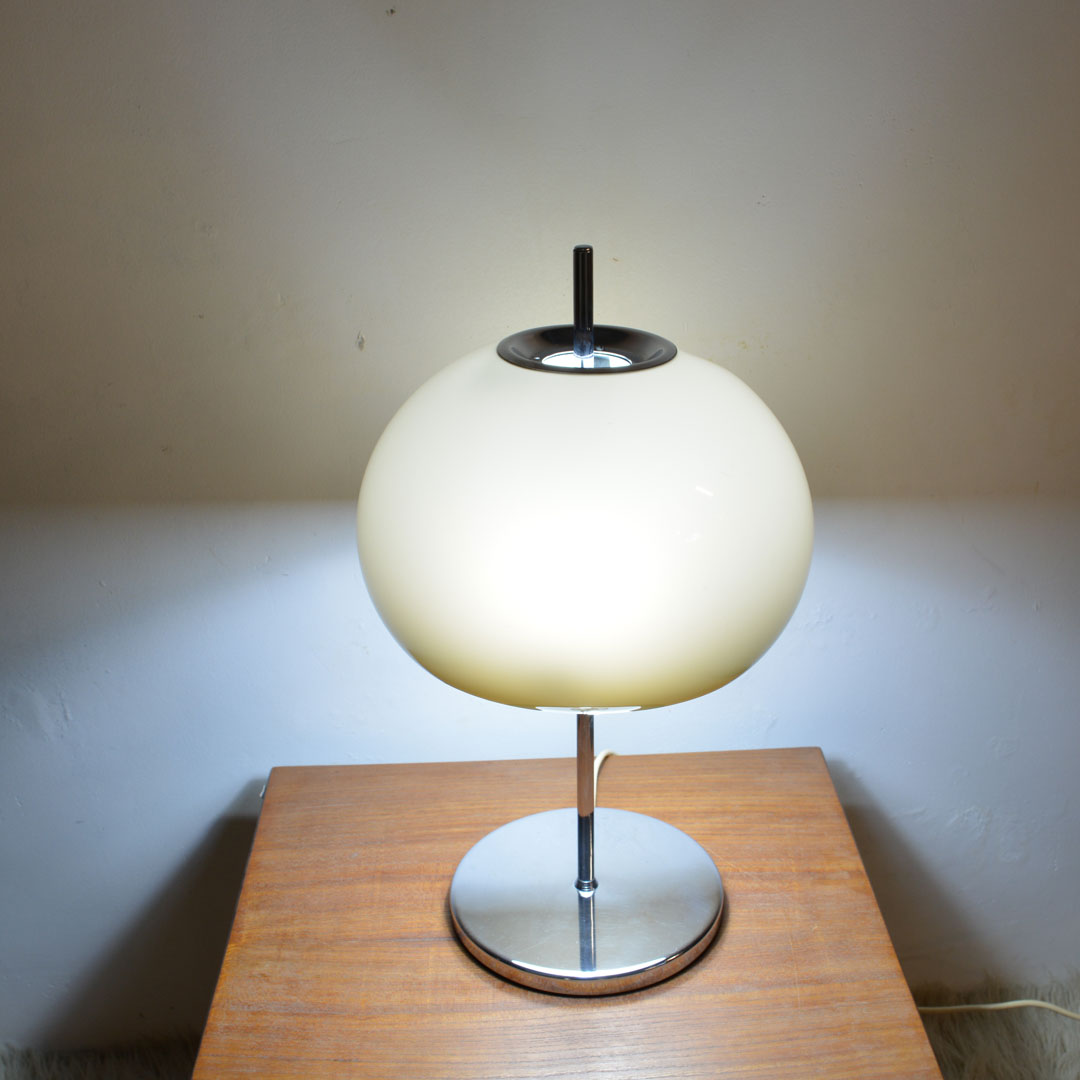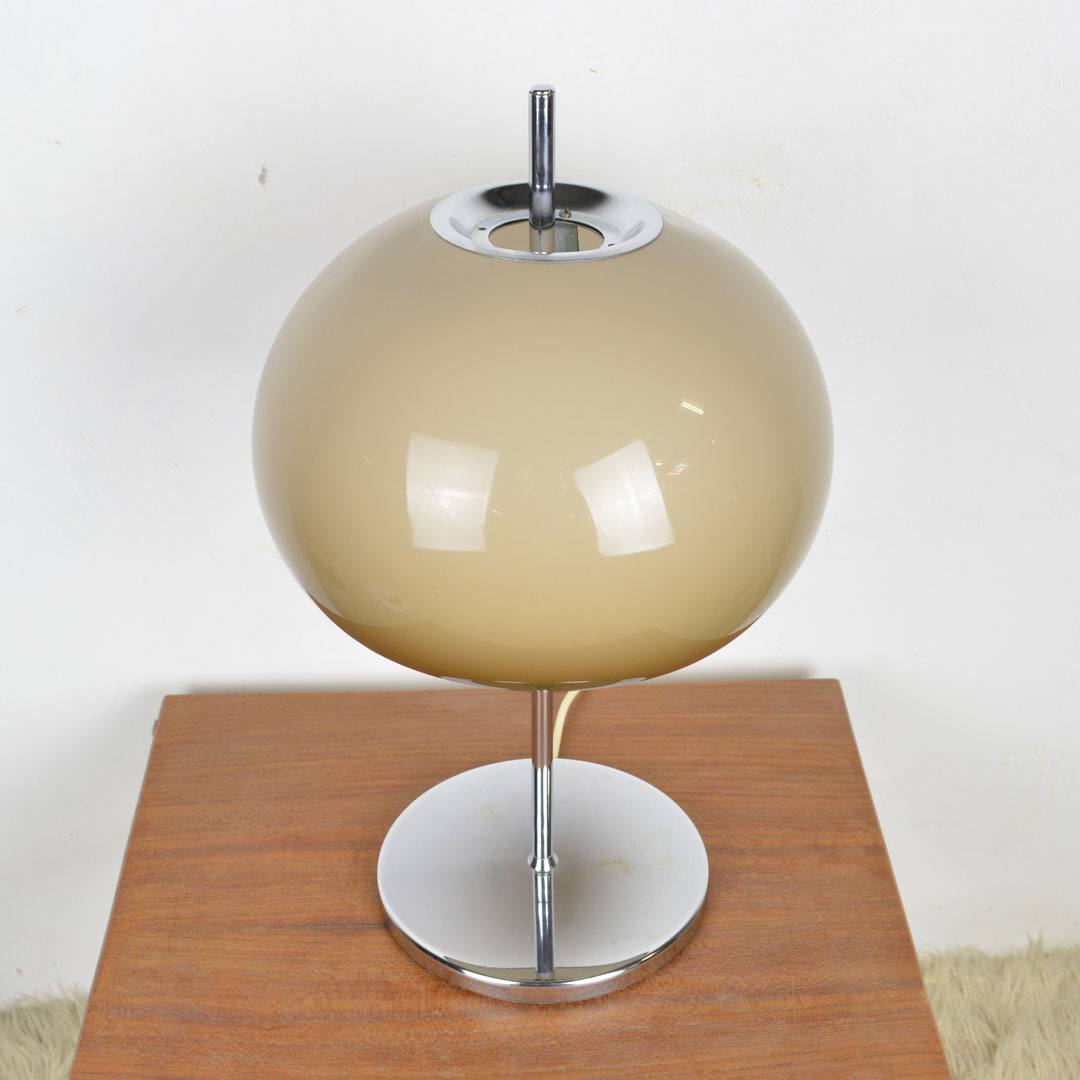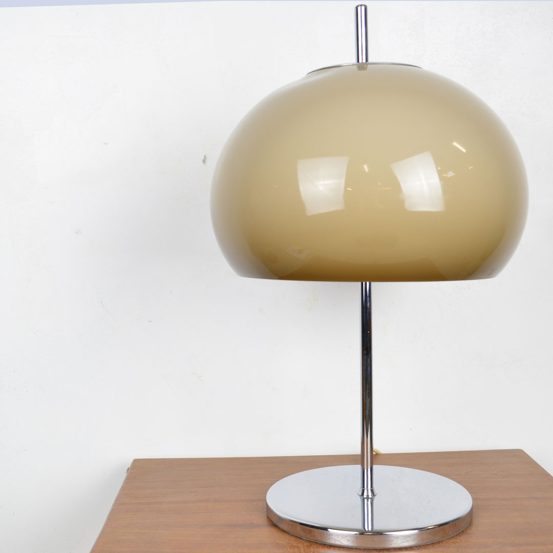Vintage 1970s iconic Guzzini Mushroom table lamp. Chrome stand and a beige shade. Fully remanufactured, with LED technology and European Plug. In excellent vintage condition