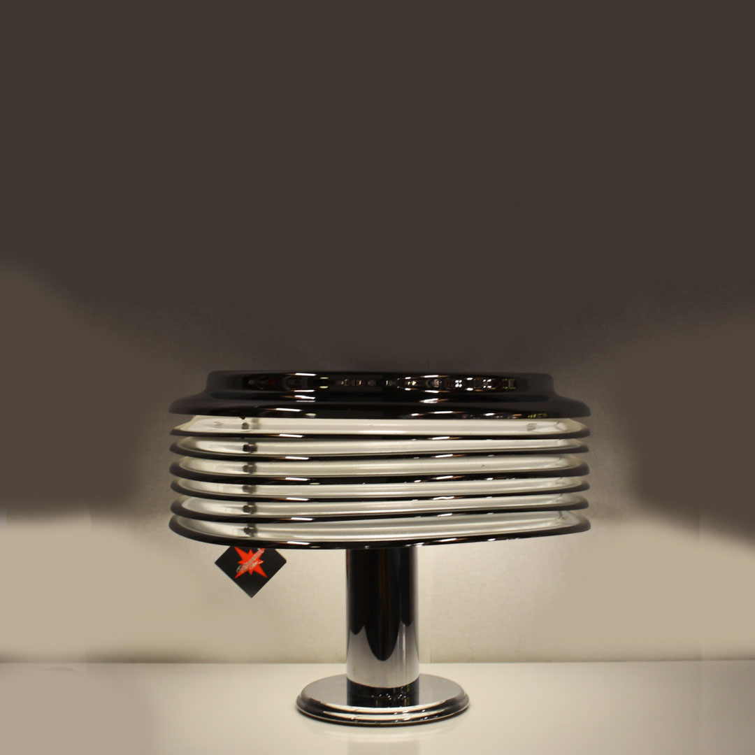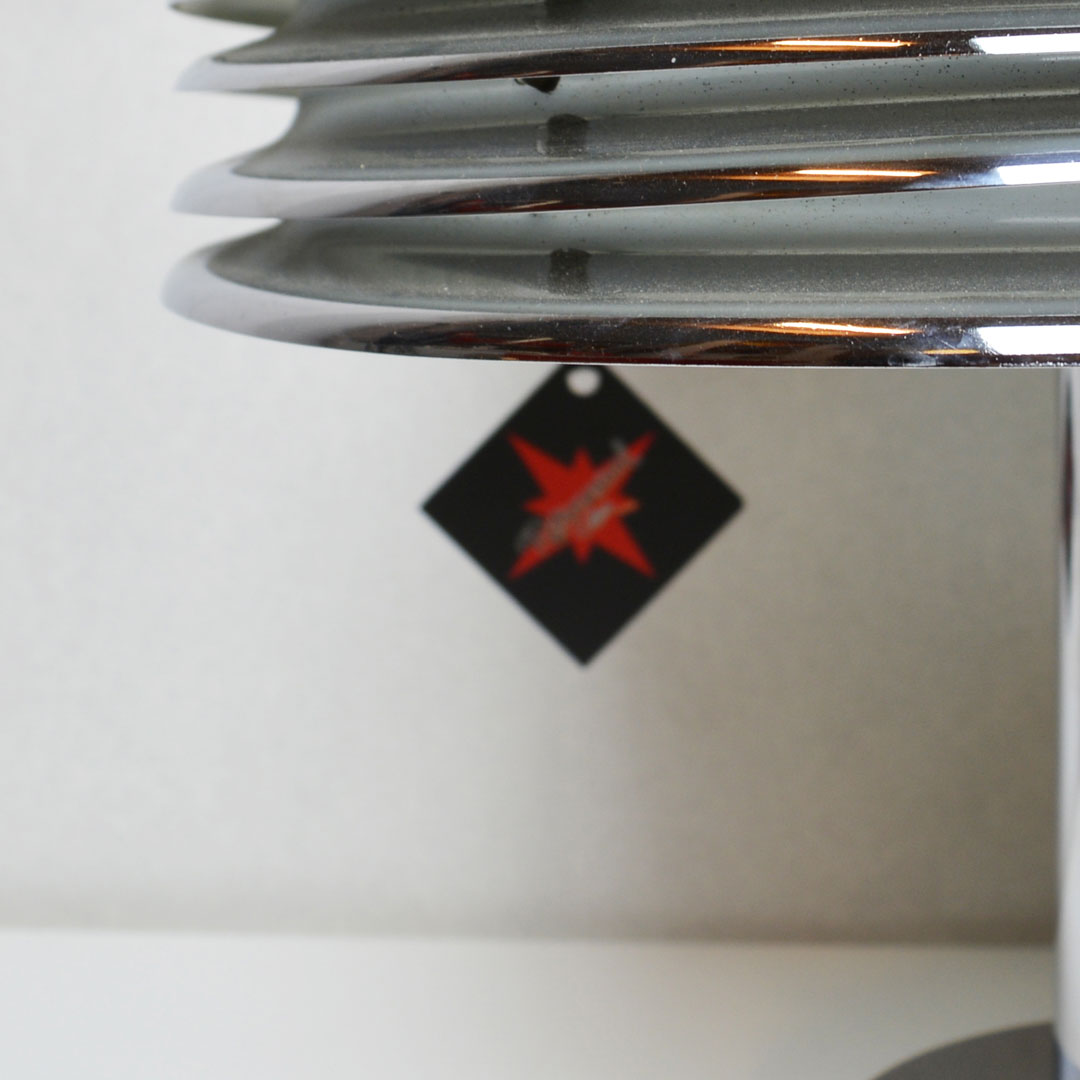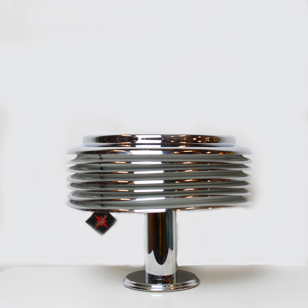 Kazuo Motozawa Saturno table in chromed metal white and lacquered inside, set upon a round base and features chromed metal slats. “Saturno” table lamp designed by the Japanese Kazuo Motozawa and imanufactured by Staff Leuchten in Germany. Fully remanufactured, with LED technology and European Plug. In excellent condition — This vintage item has no defects.