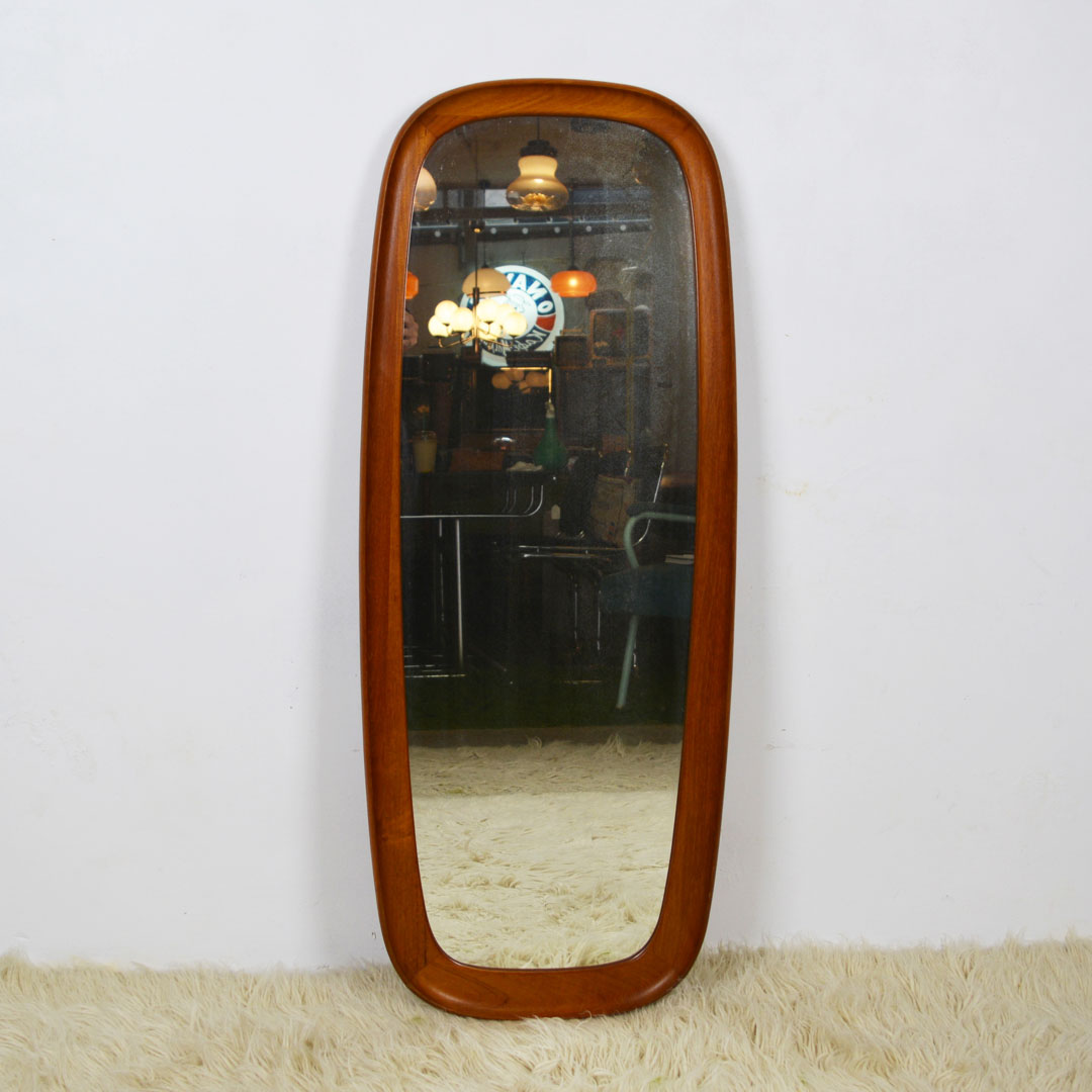 Large mid-century rounded rectangular wall mirror made with a beautiful heavy solid teak frame which is wider around the mirror at the top whilst thinning out towards the bottom. Unique and rare item. Made in Denmark, 1960. Labeled on the back. Excellent condition. Professionally cleaned and oiled.