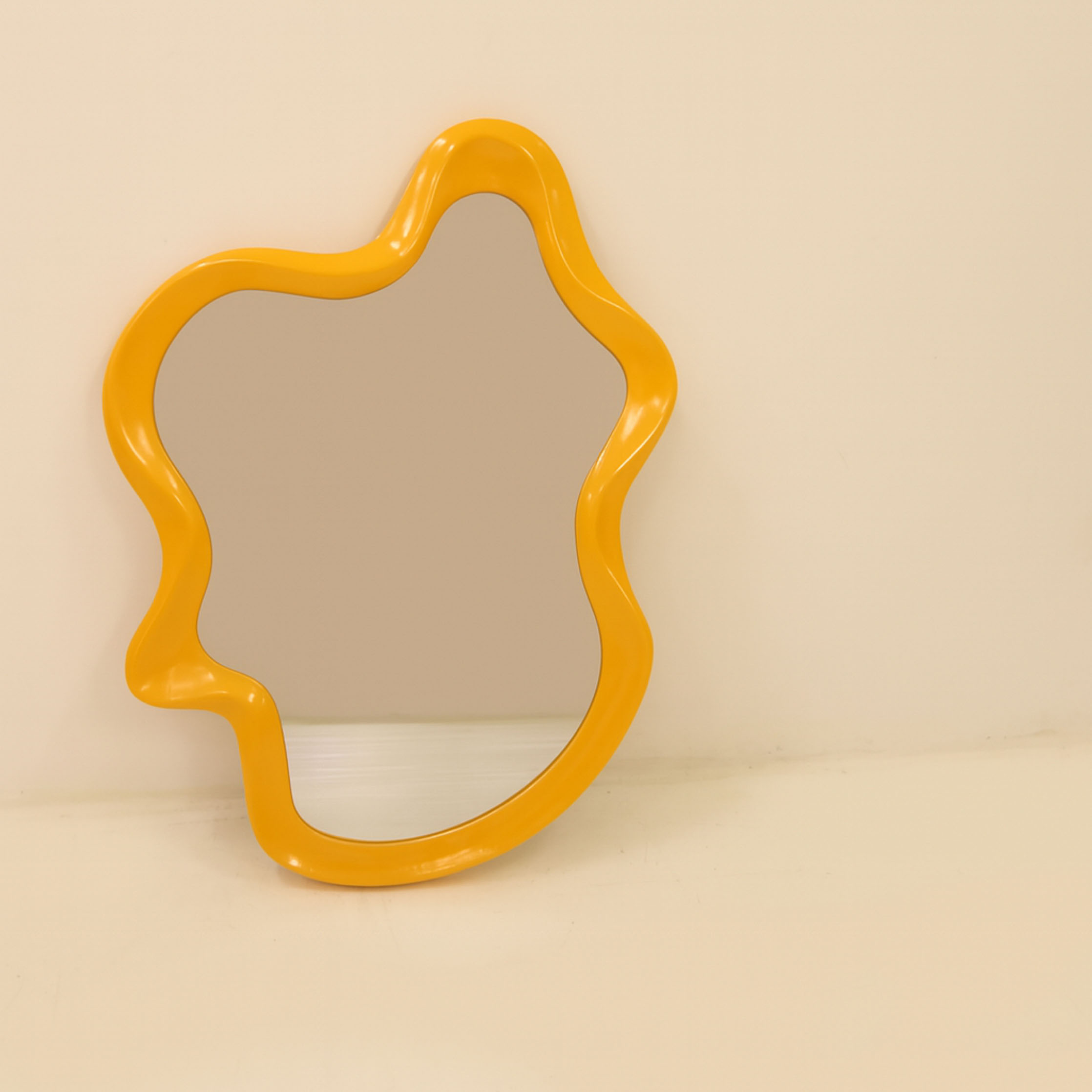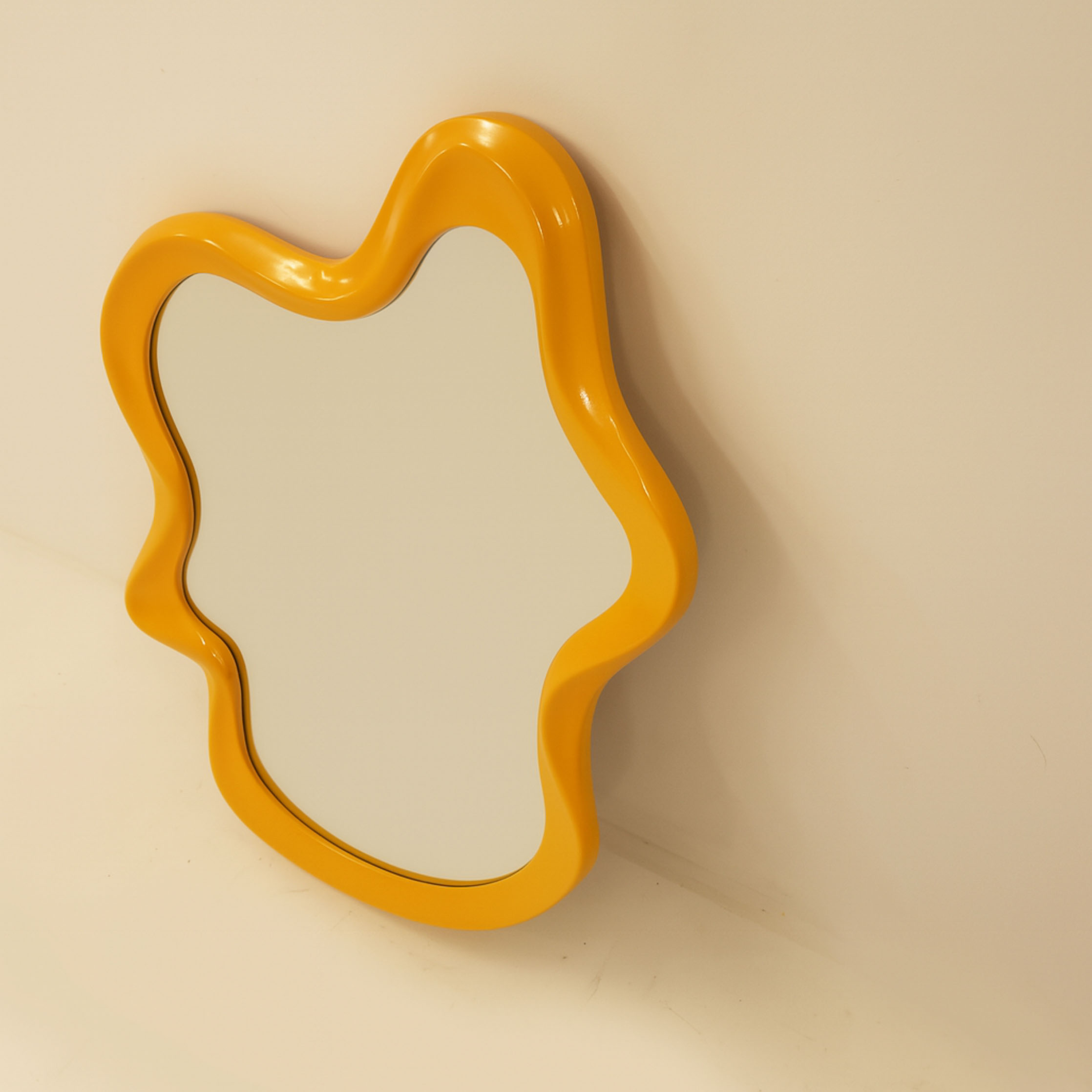 An eye-catching wall mirror with a sculptural, freeform silhouette and a vivid yellow hue. Crafted from solid wood, the frame evokes the fluidity of liquid in motion, bringing playful elegance to any space — from eclectic interiors to modern minimal settings.