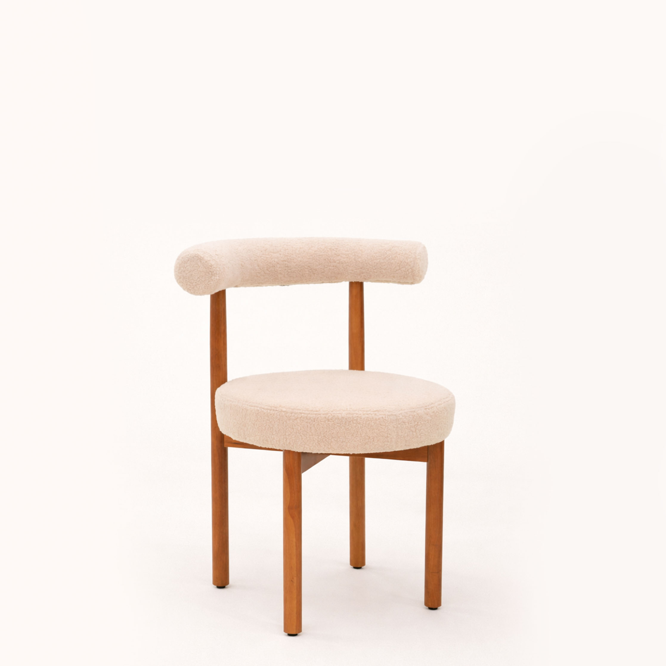 A contemporary accent chair featuring a cylindrical backrest upholstered in soft cream bouclé and paired with a warm solid wood frame. The piece balances softness and structure, offering an inviting seating solution with sculptural presence. Ideal for dining settings, reading corners, or statement interiors with a refined modernist sensibility.