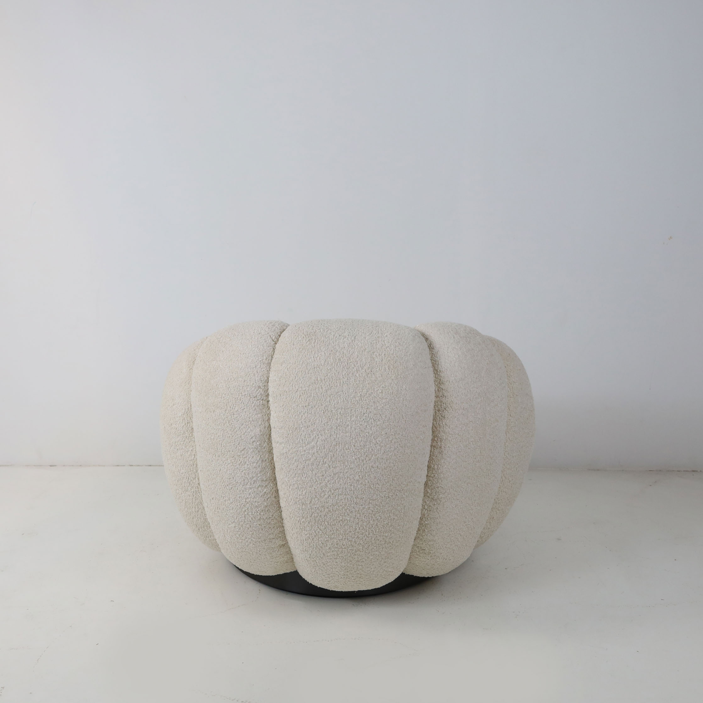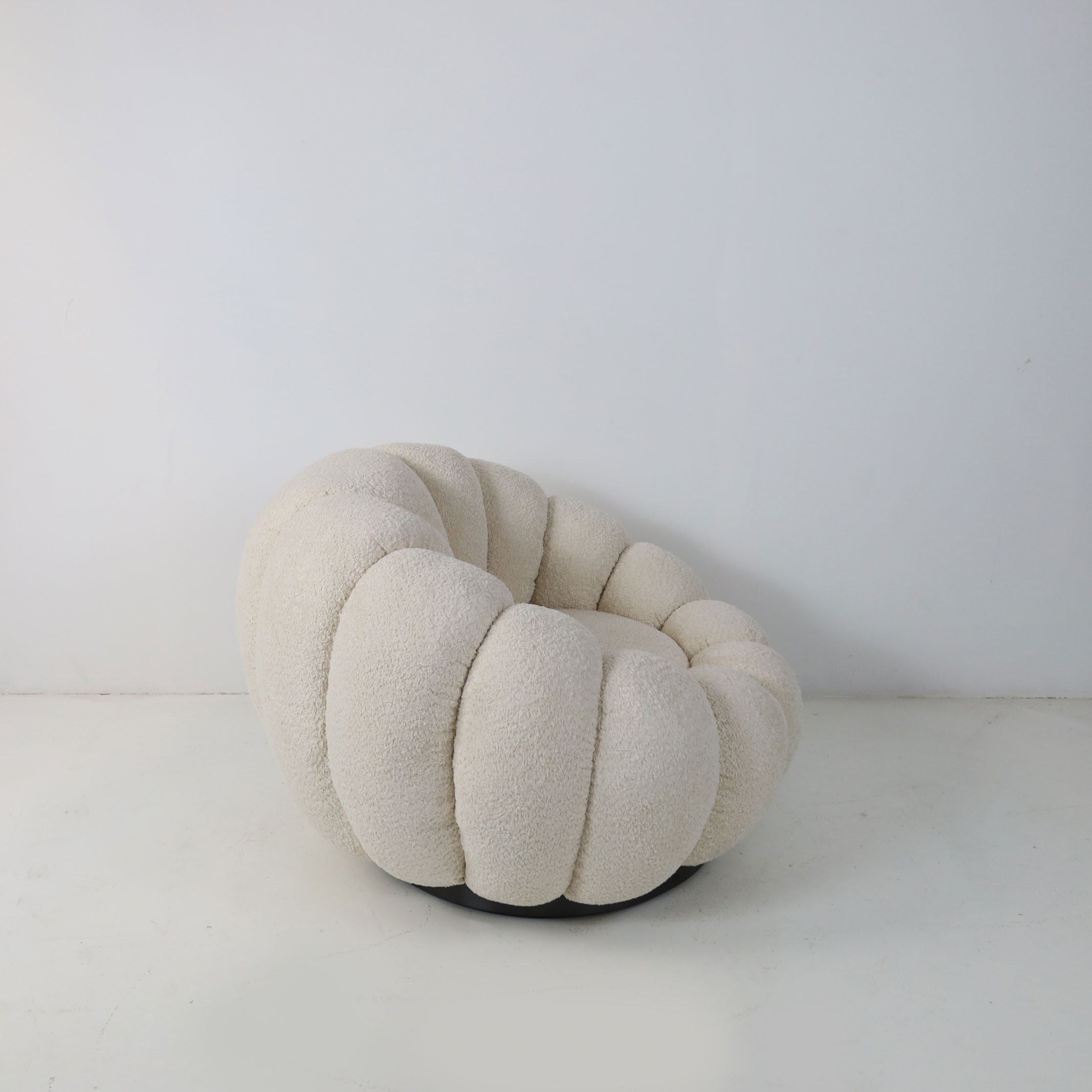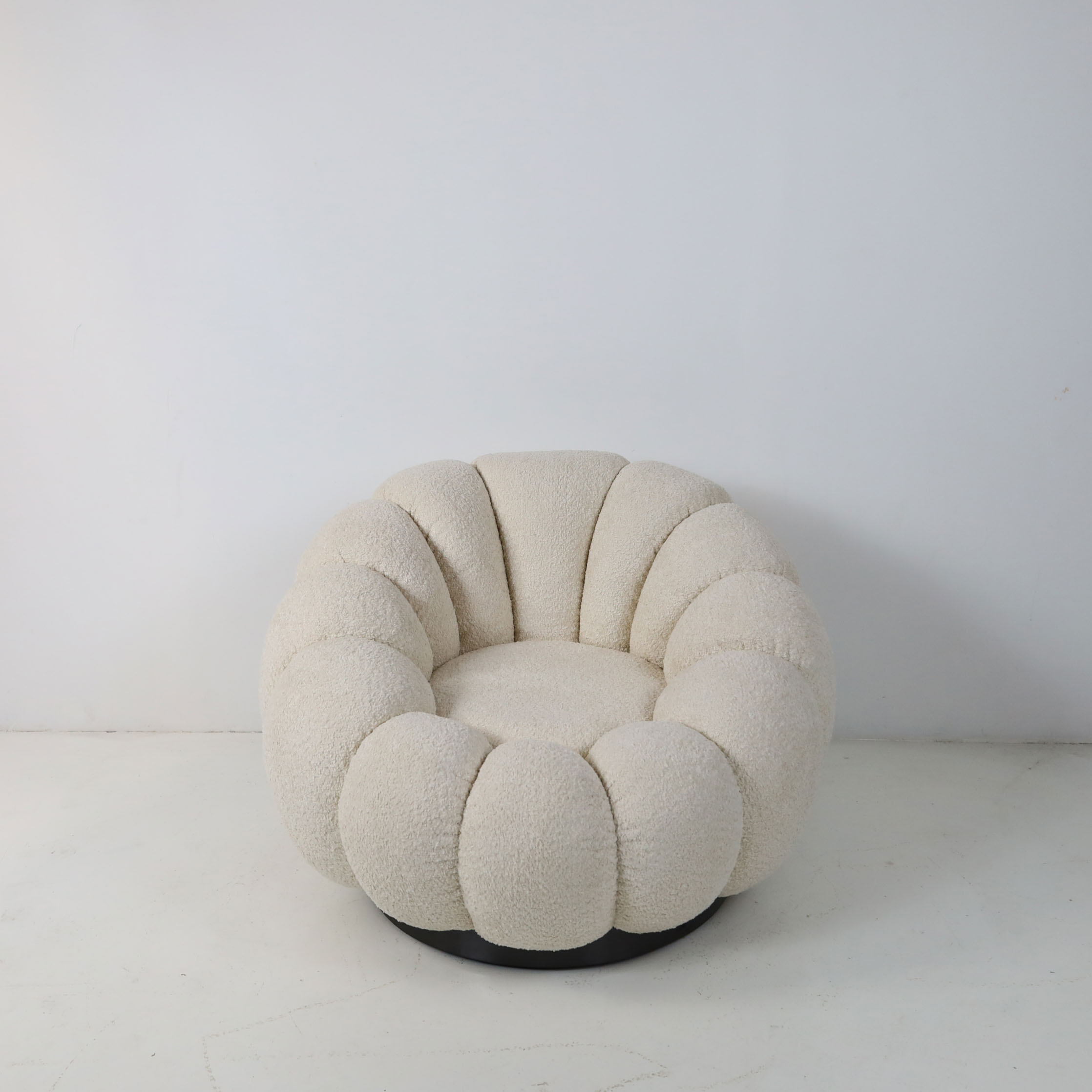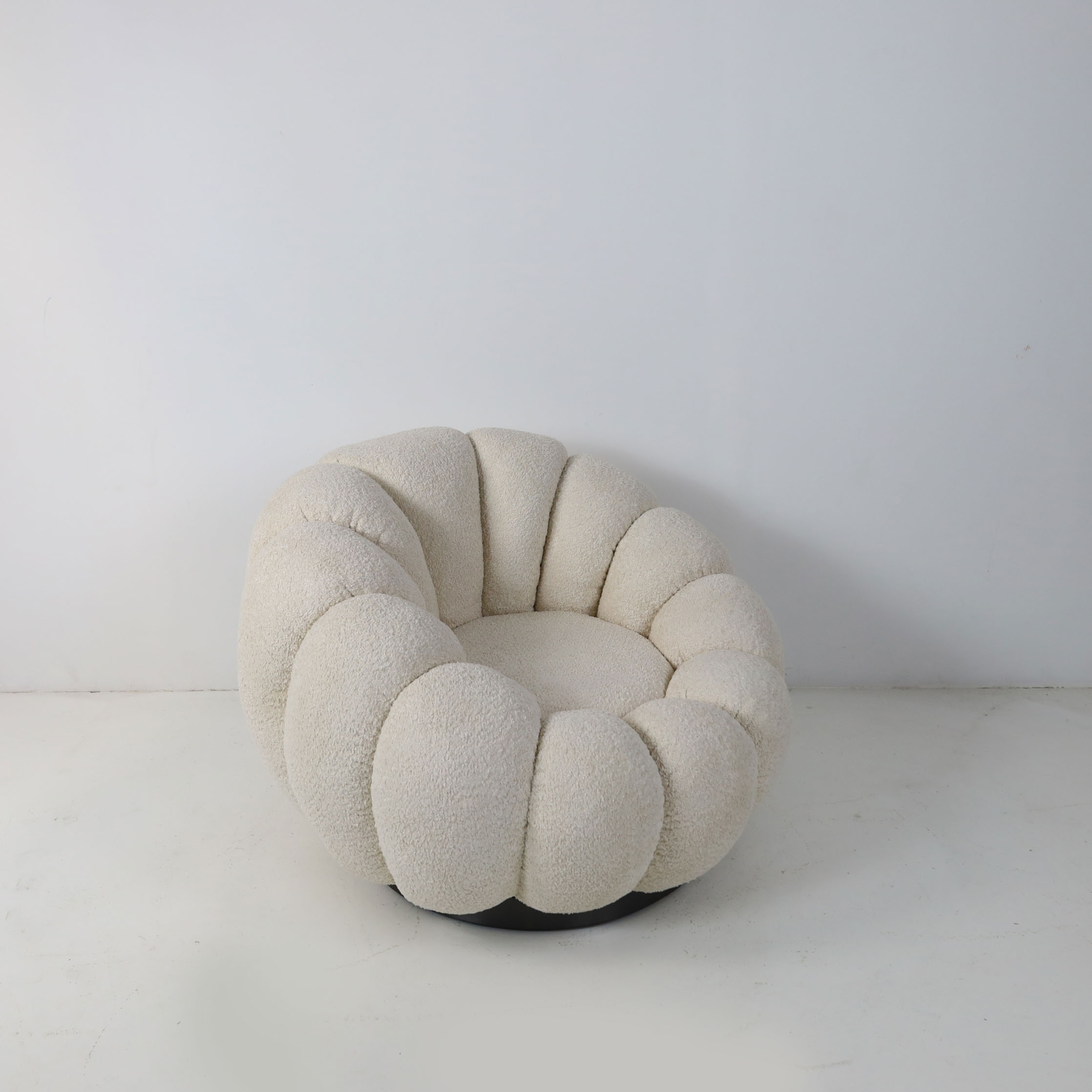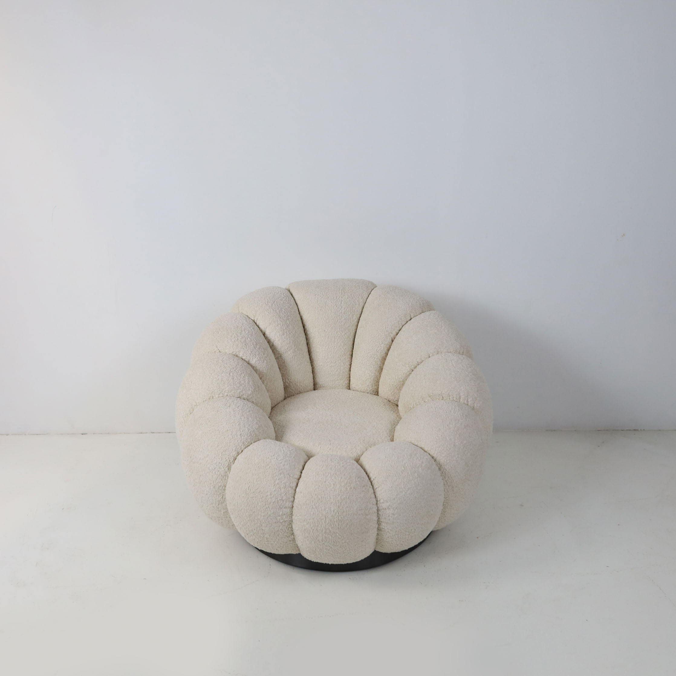 Stylish and innovative lounge chair in margarite shape. Draped in sumptuous teddy fleece upholstery, it exudes luxury and comfort. The swivel base adds a touch of versatility, making it an ideal accent for contemporary living rooms or bedrooms. With its sleek, low-slung silhouette, this chair beckons you to revel in its cozy embrace, offering a sensation akin to lounging amidst celestial clouds. Elevate your space with the perfect blend of comfort and chic style.