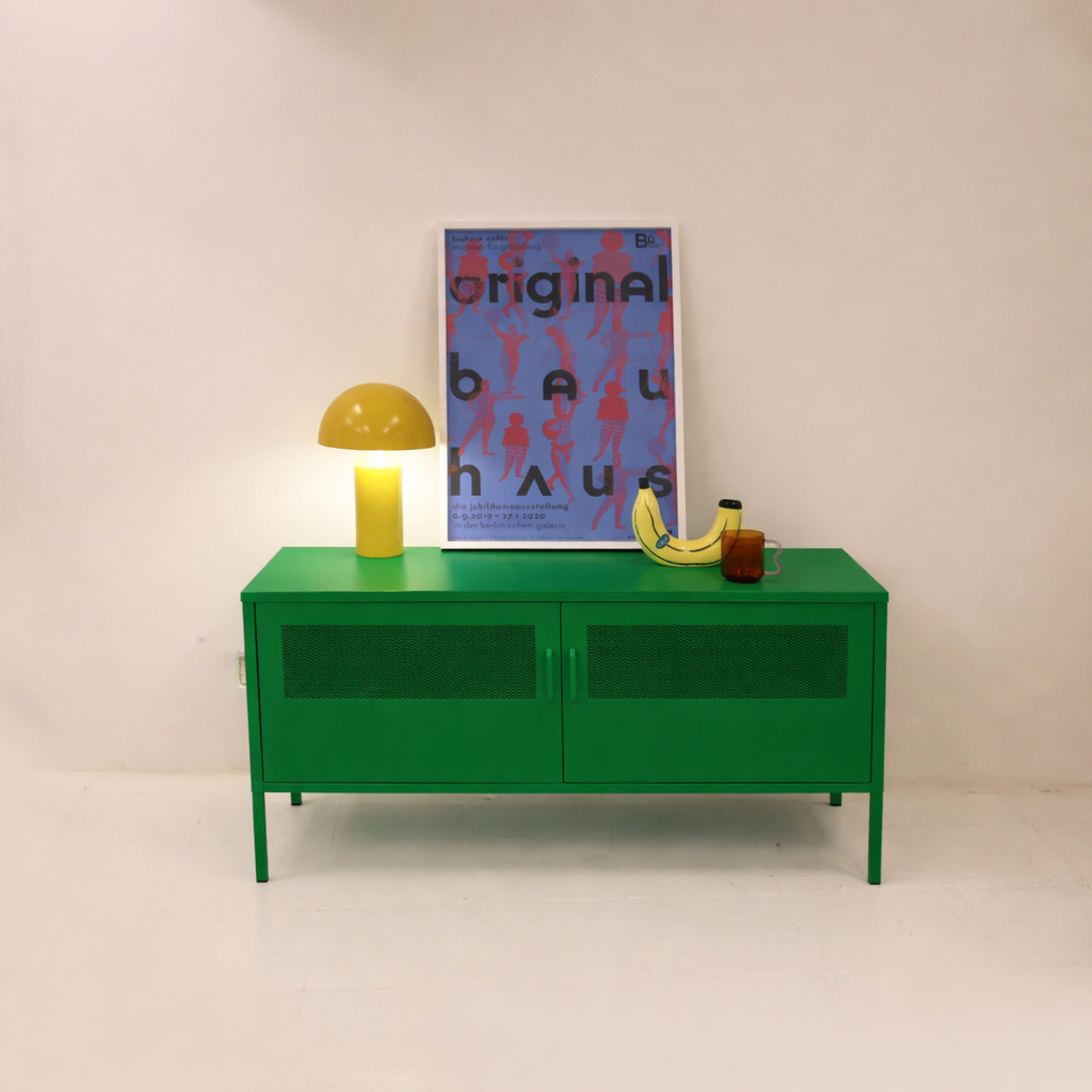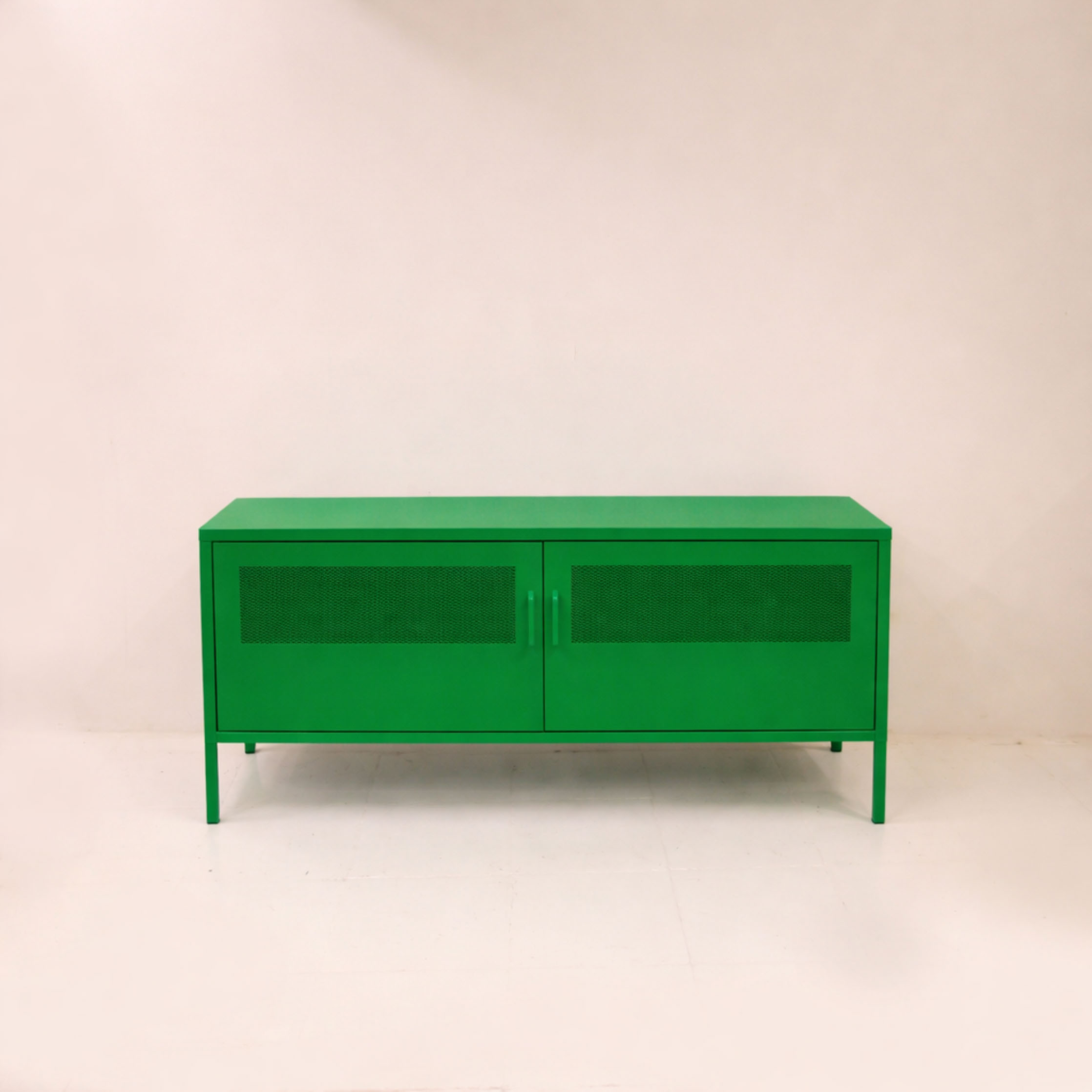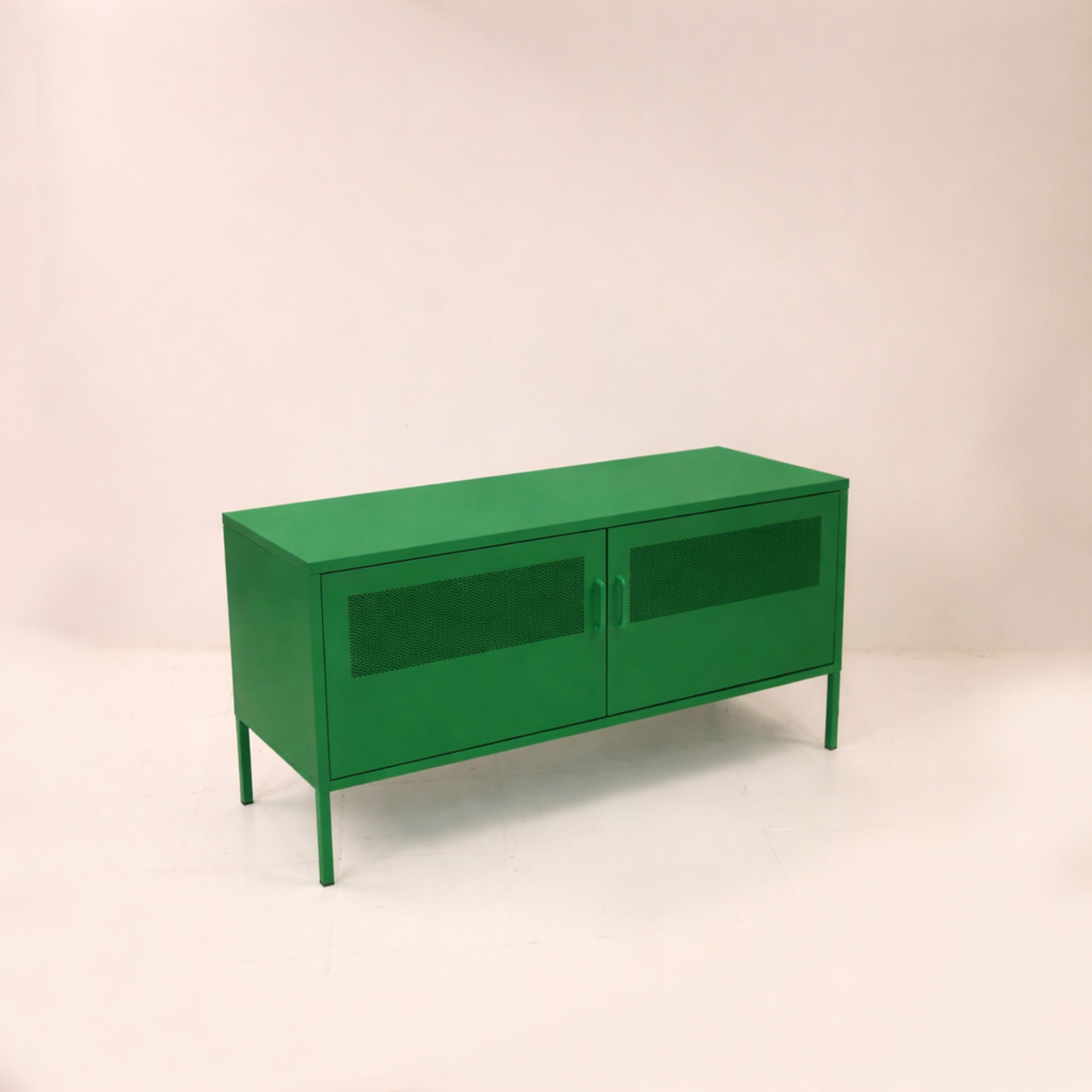 Minimal metal storage cabinet with clean industrial lines and perforated mesh doors. The Mesh Cabinet – Jade Edition features a vibrant powder-coated finish, slim metal legs, and integrated handles that emphasize its contemporary silhouette. A versatile piece designed for modern interiors, it works perfectly as a sideboard, media console, or storage unit. The perforated panels allow subtle ventilation while maintaining a sleek, architectural look. Ideal for colorful interiors, design studios, and contemporary living spaces.
