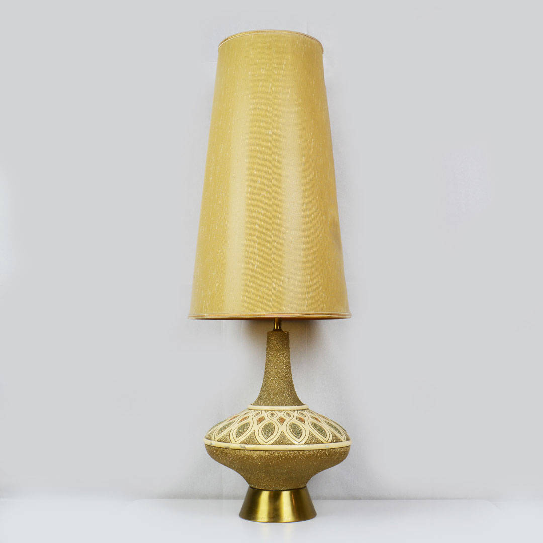 Mid century ceramic Aztek table lamp, in original lampshade. Fully remanufactured with LED technology and European Plug. In excellent condition — This vintage item has no defects.
