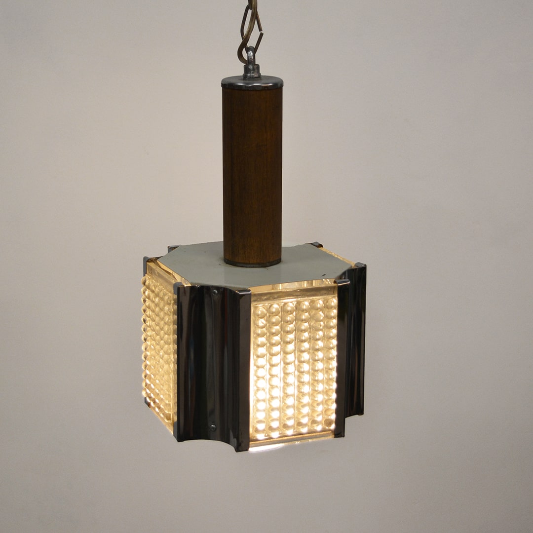 €420.00€280.00Mid century modern pedant light in glass, wood and metal. Fully remanufactured with LED technology, European Plug and adjustable height. —In excellent condition. This vintage item has no defects.