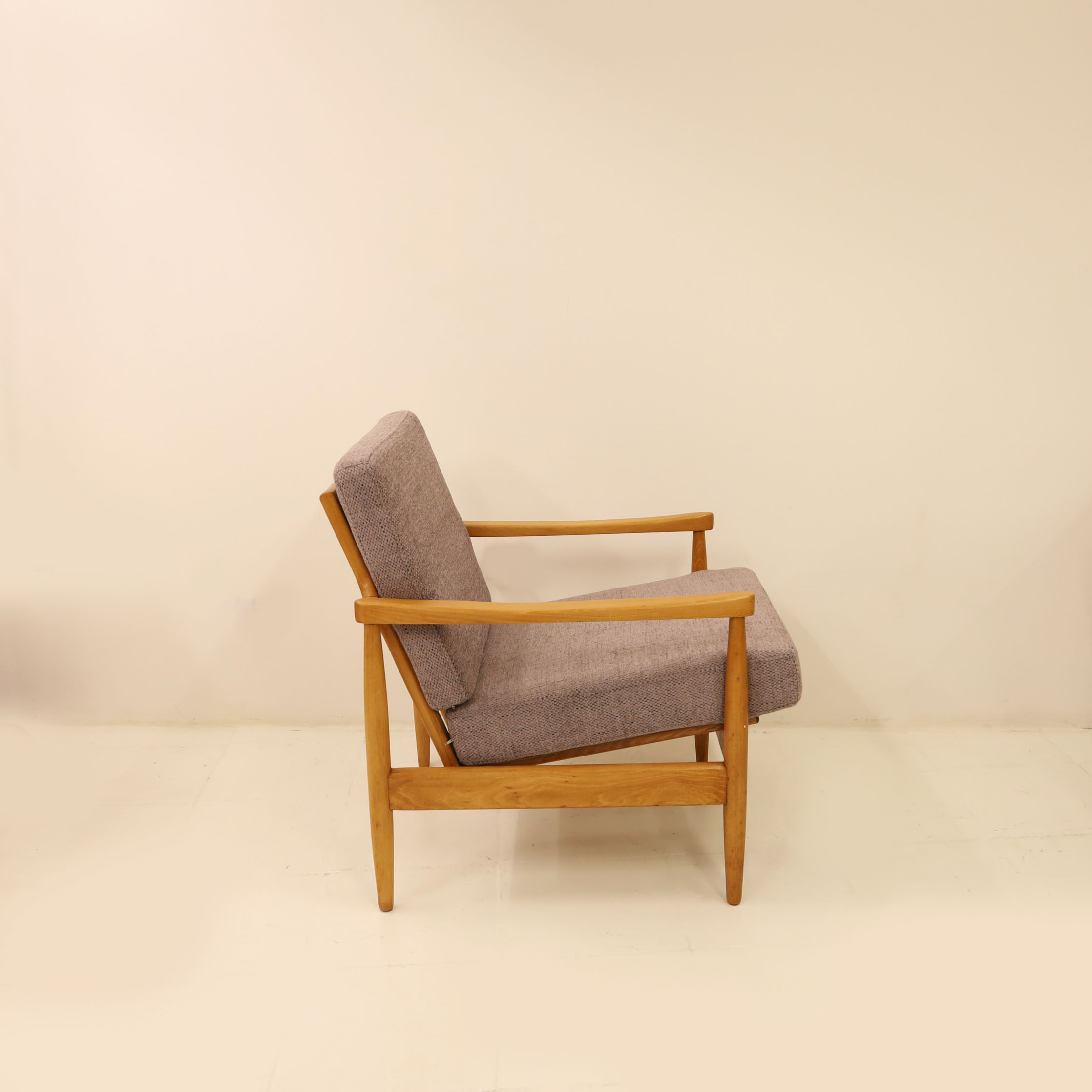 Scandinavian Mid-Century lounge armchair. Magnificent upholstery in purple hues color. It is fully restored. This vintage item is in excellent vintage condition and professionally restored by our expert team. Refreshed through new upholstery and brand-new cushions in more unique high-density foam. The cushions are removable, providing zippers.