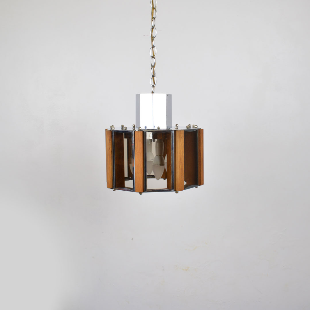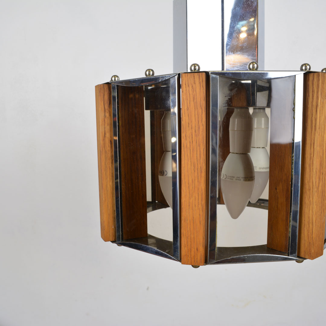 Mid century modern pedant light in glass, wood and metal. Fully remanufactured with LED technology, European Plug and adjustable height. —In excellent condition. This vintage item has no defects.