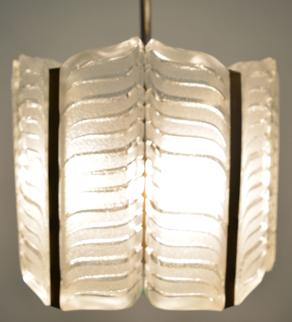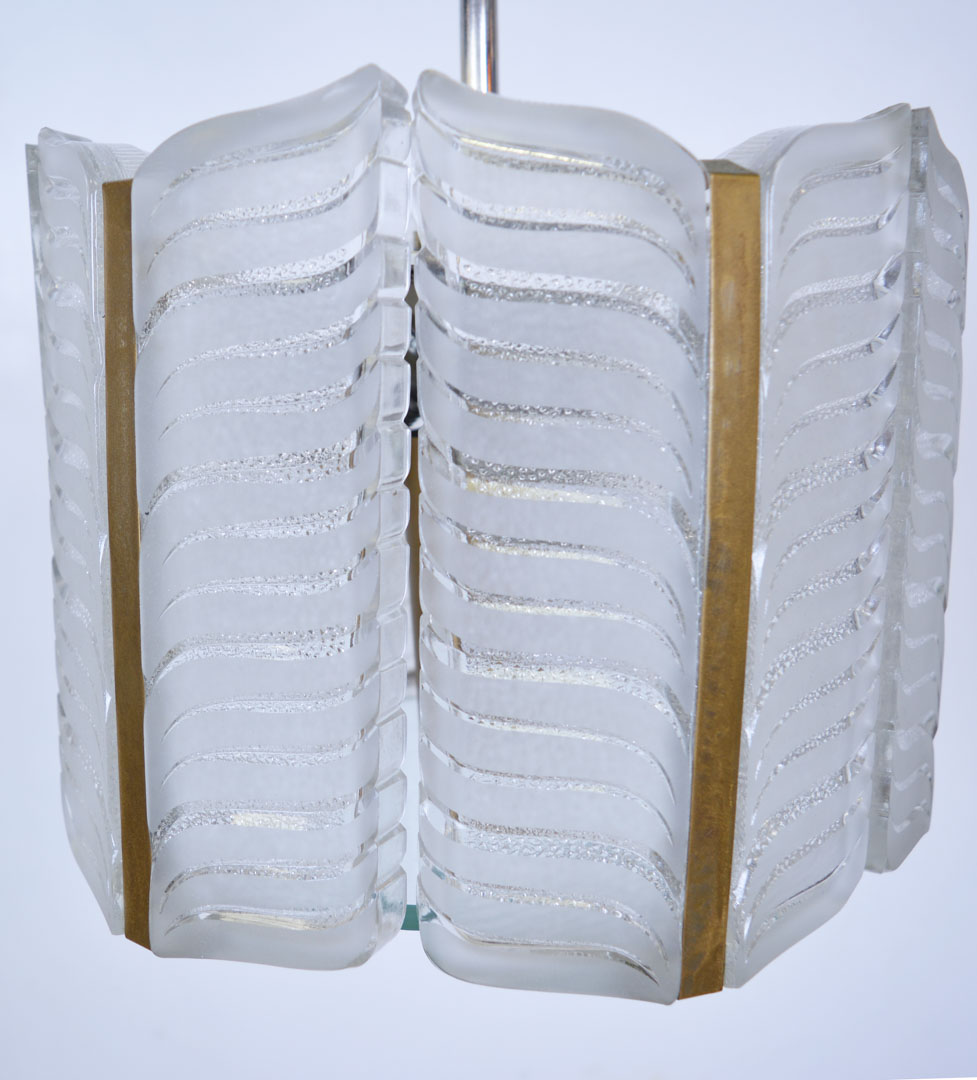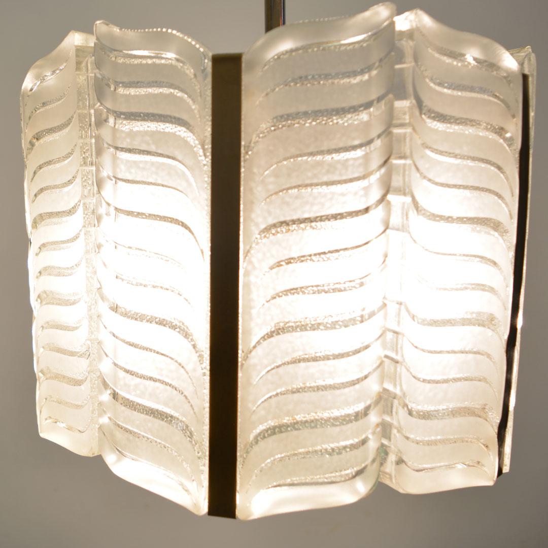 Mid century modern Italian pendant composed of 6 hand blown frosted glass panels with leaf like design and textured pebbled glass base, mounted on brass frame. Hexagonal. Designed by Kalmar circa 1960’s, made in Austria. Fully remanufactured with LED technology and European Plug .—In very good vintage condition. This vintage item has no defects!
