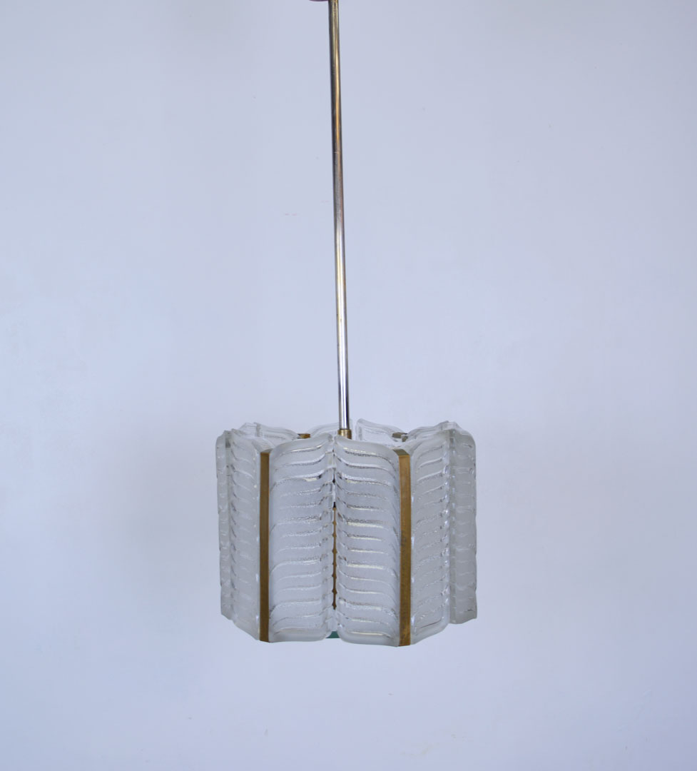 €360.00€280.00Mid century modern Italian pendant composed of 3 hand blown frosted glass panels mounted on brass frame. Fully remanufactured with LED technology and European Plug .—In excellent vintage condition. This vintage item has no defects.