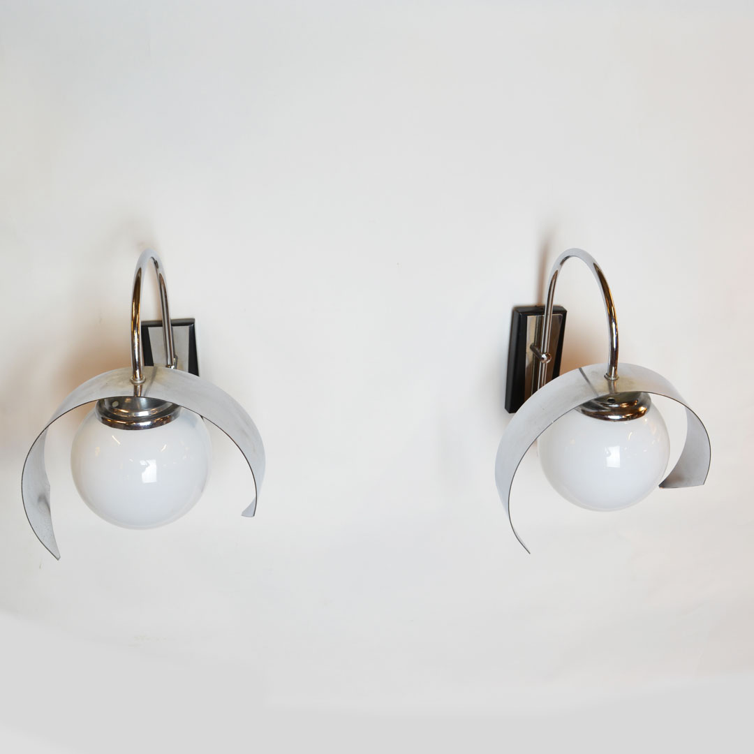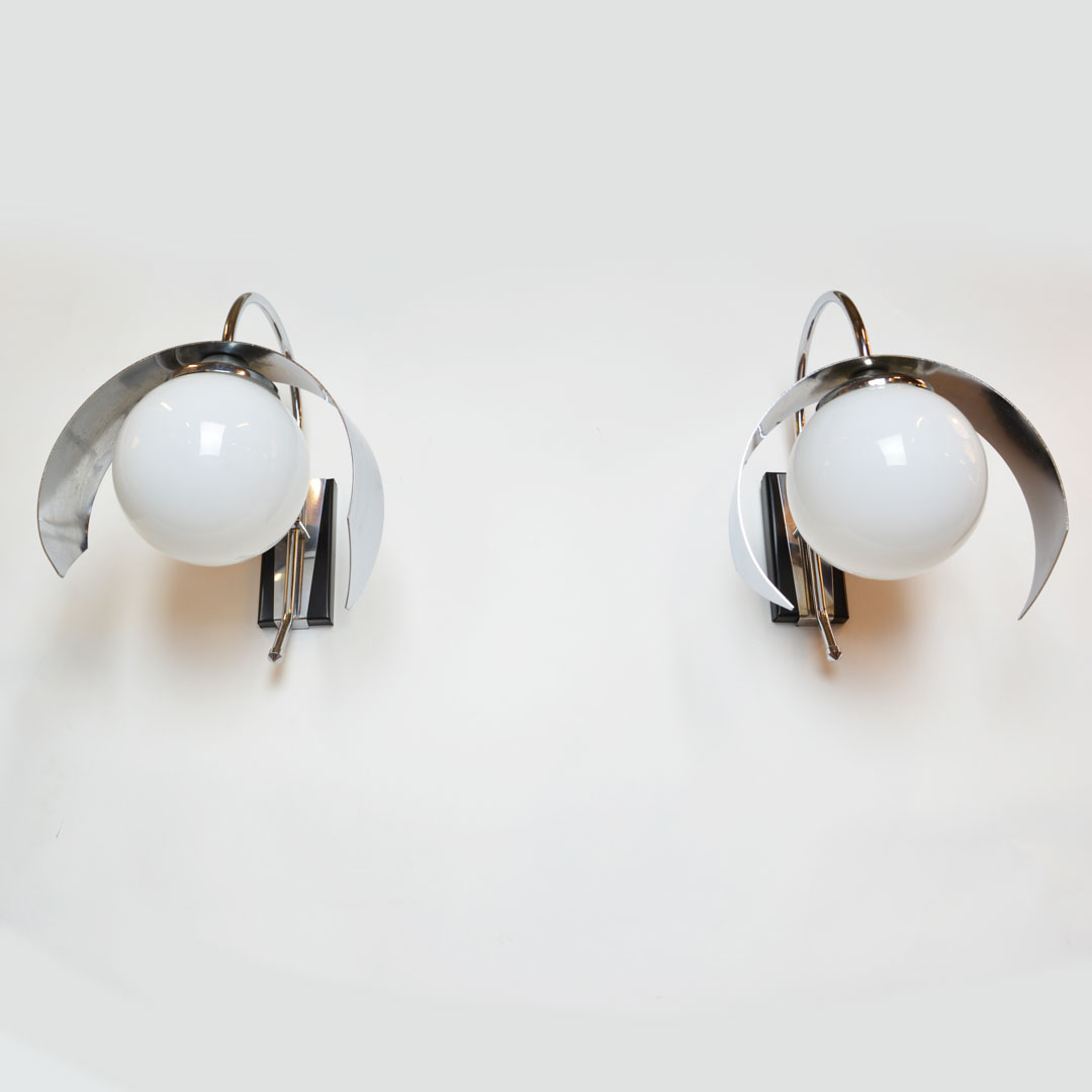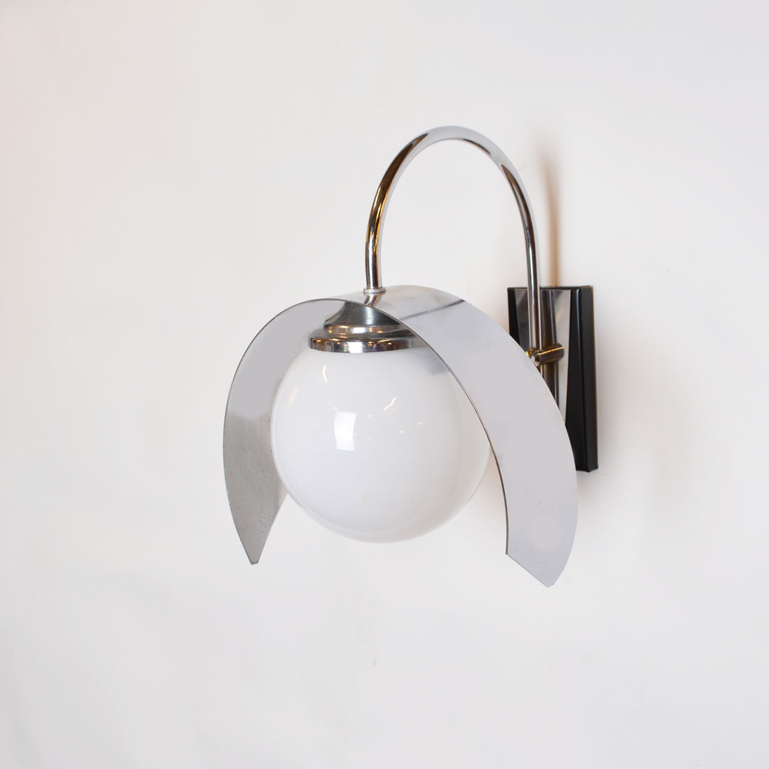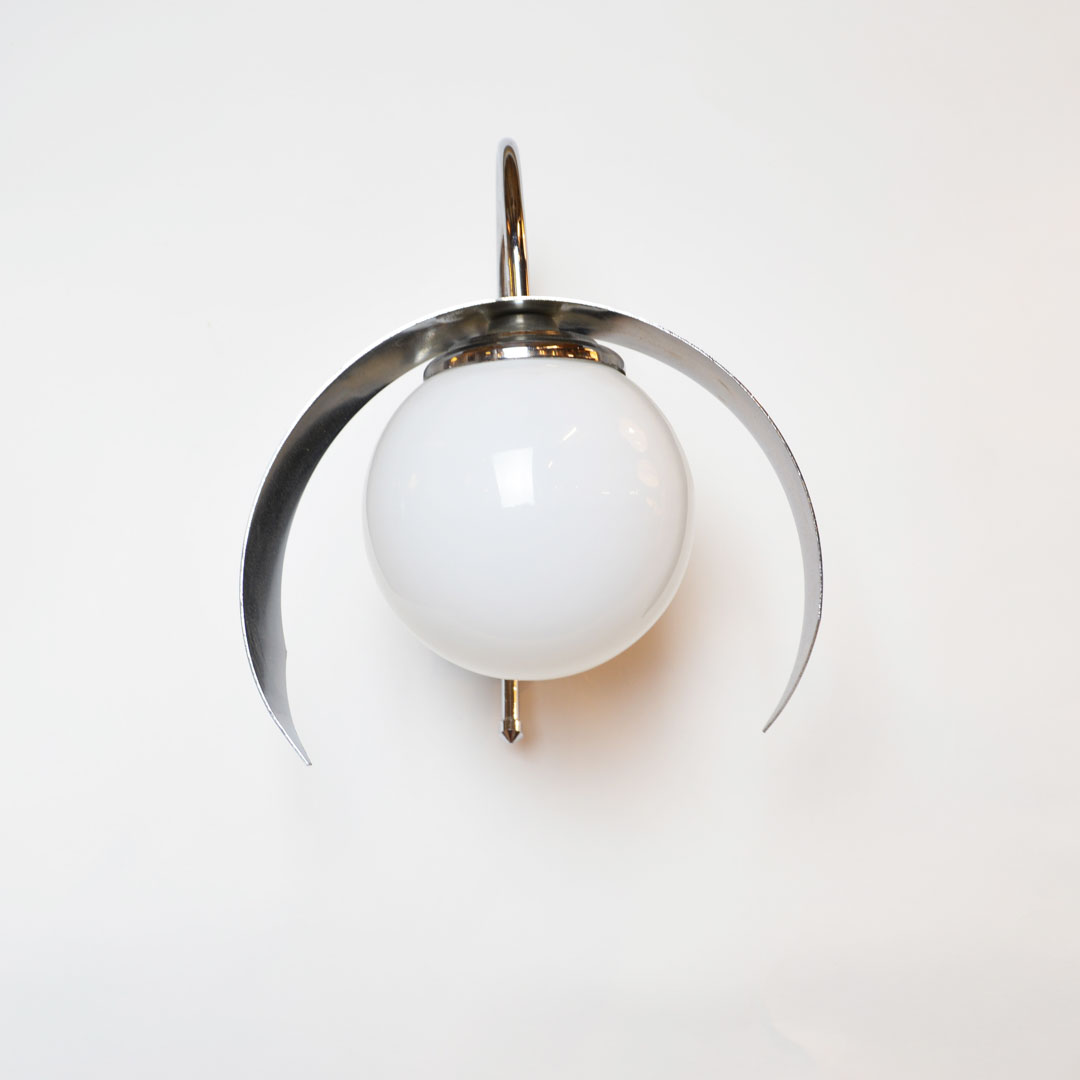 Mid century modern wall light. Featuring a chromed metal base with unique edges and a globe lampshade. Fully remanufactured, with LED technology and European Plug. In excellent condition.