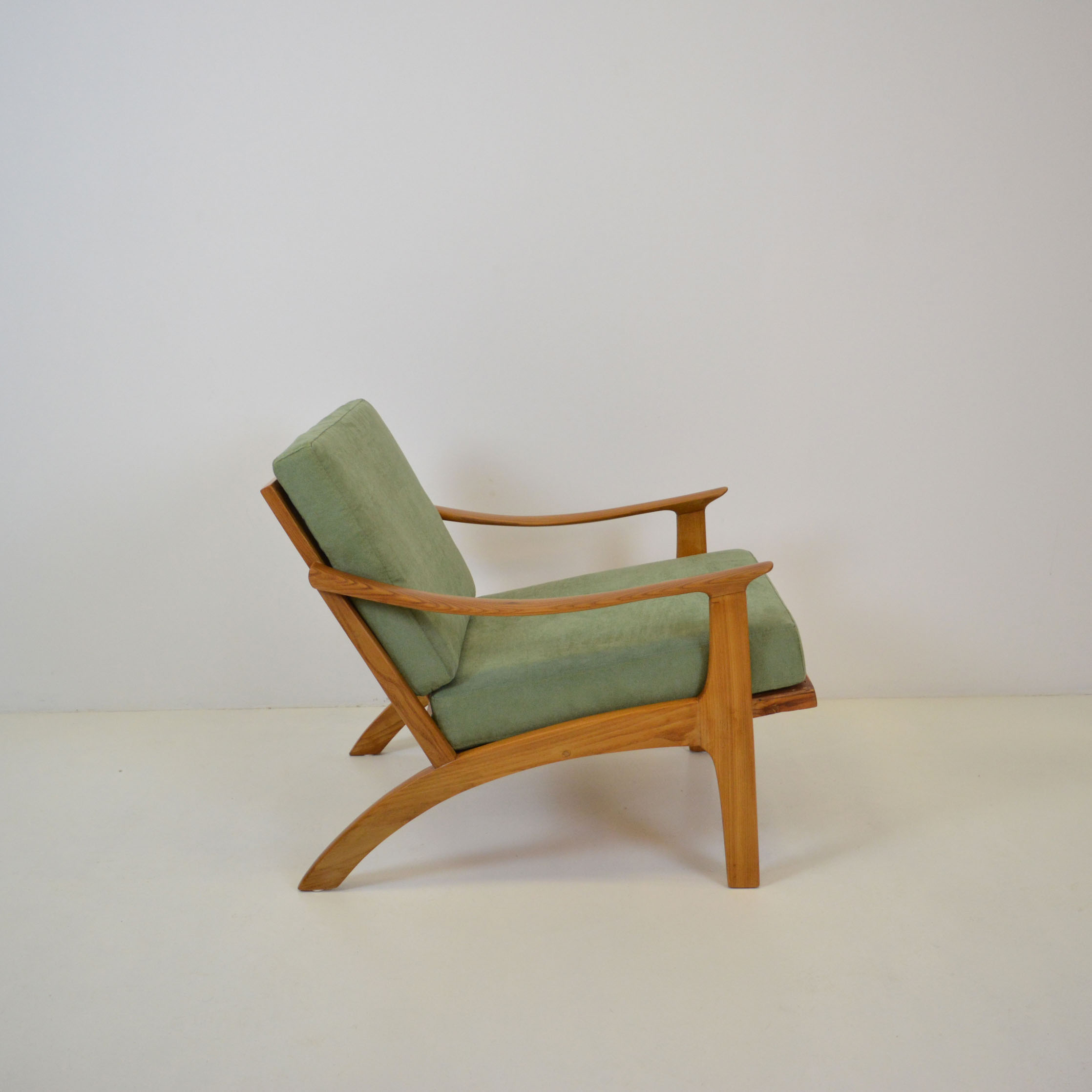 Mid Century modern lounge chair. Magnificent upholstery in green-blue hues nature inspired. Fully remanufactured. This item is in excellent vintage condition because it has been refreshed through new upholstery brand new foam and cushions with zippers also refinished. You can find this item exclusively at MODERNON.