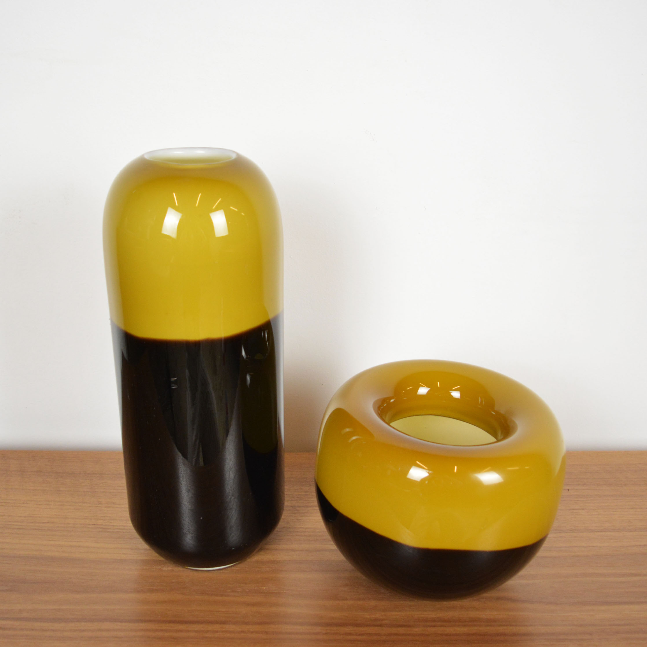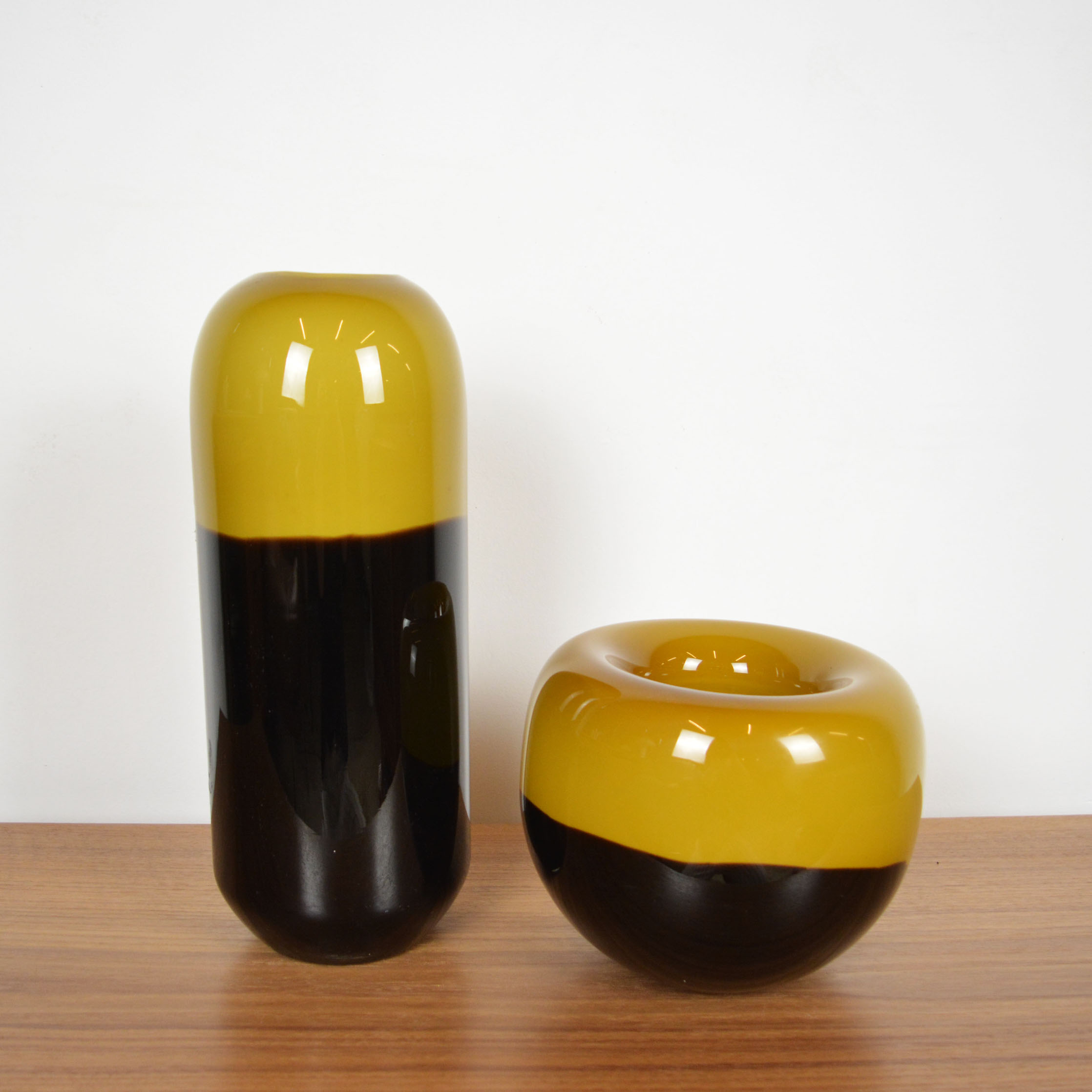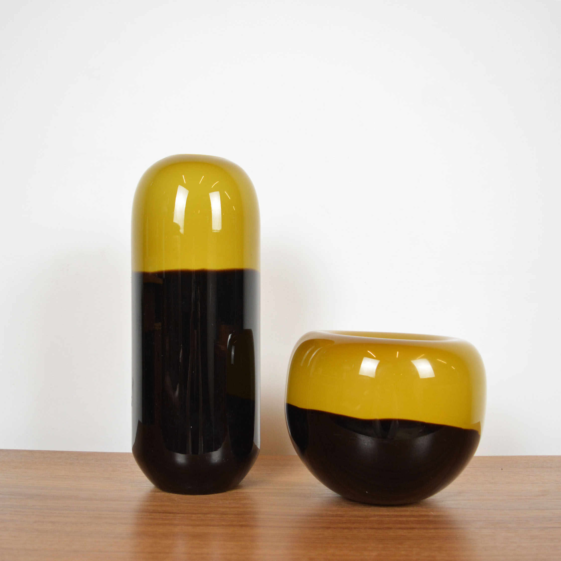 Mid century modern vases, murano glass in two colors. In excellent vintage condition. Has been refreshed and revived by our professional restorers.