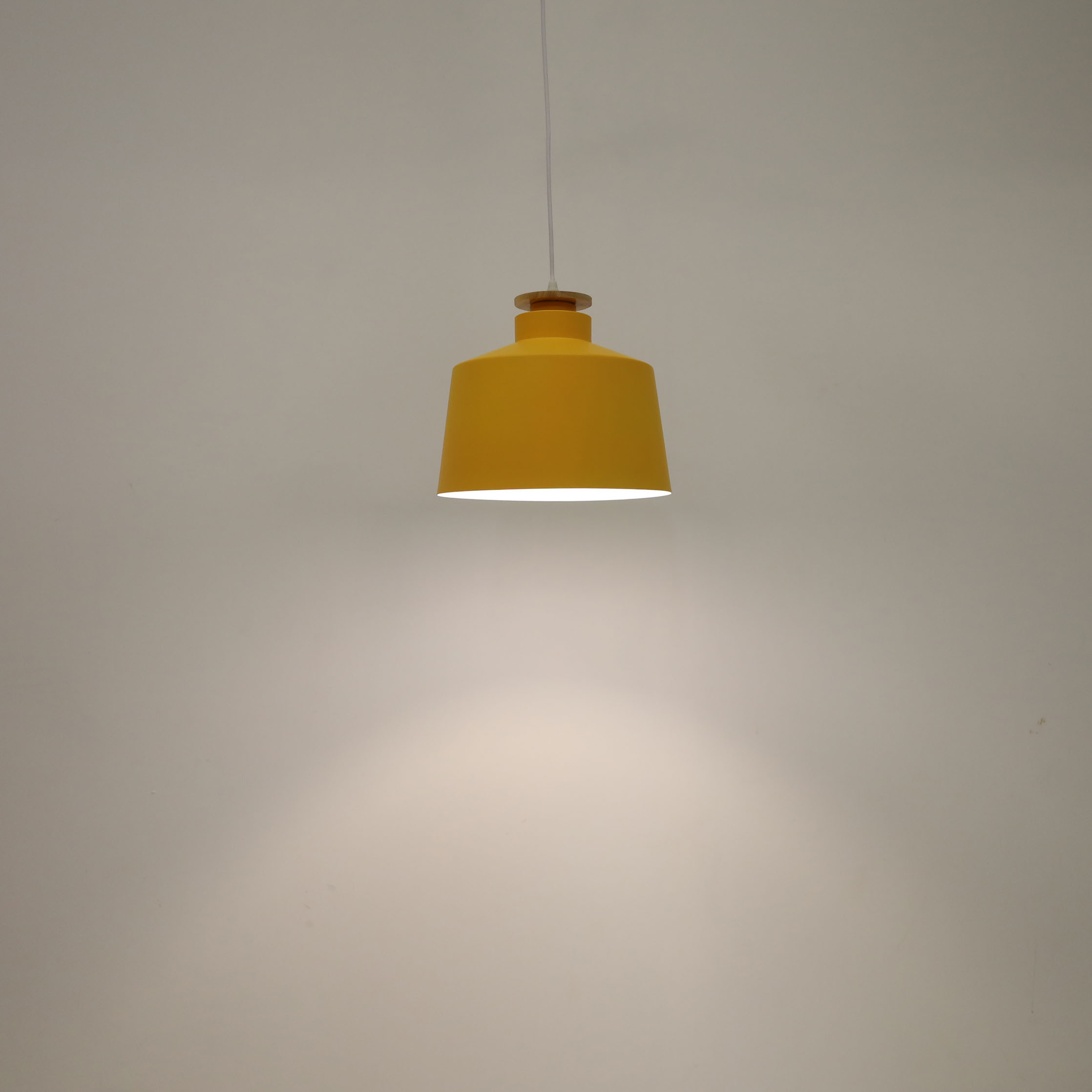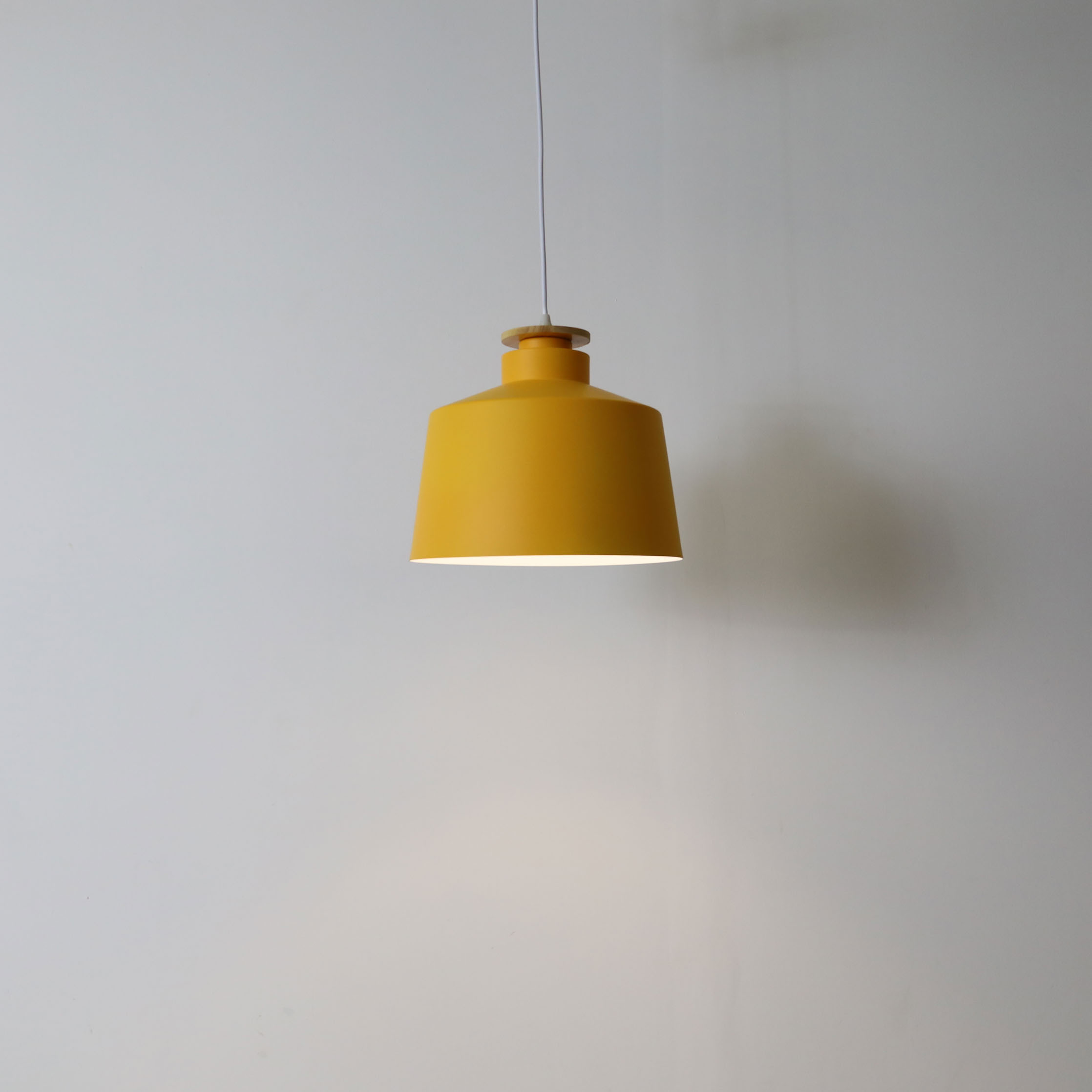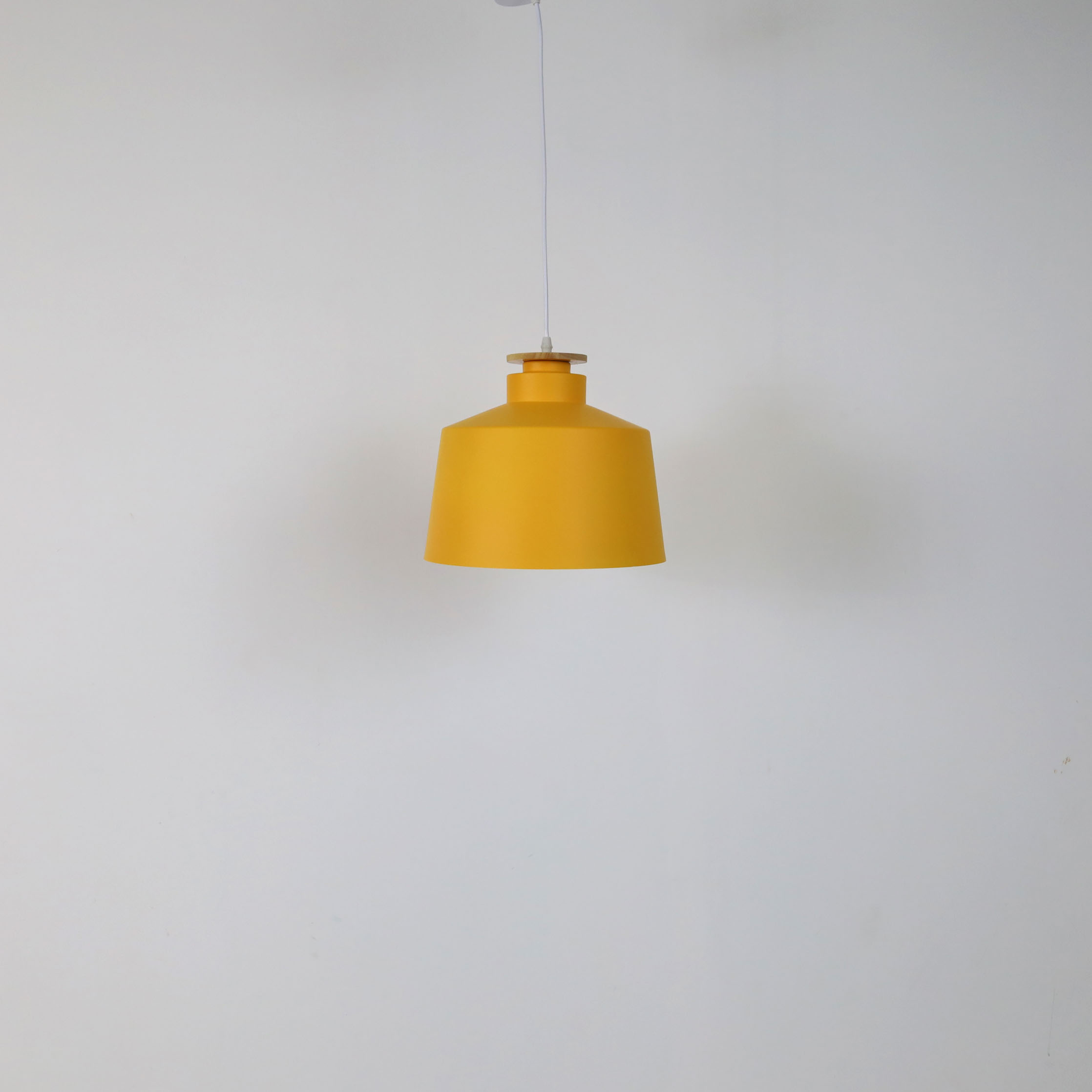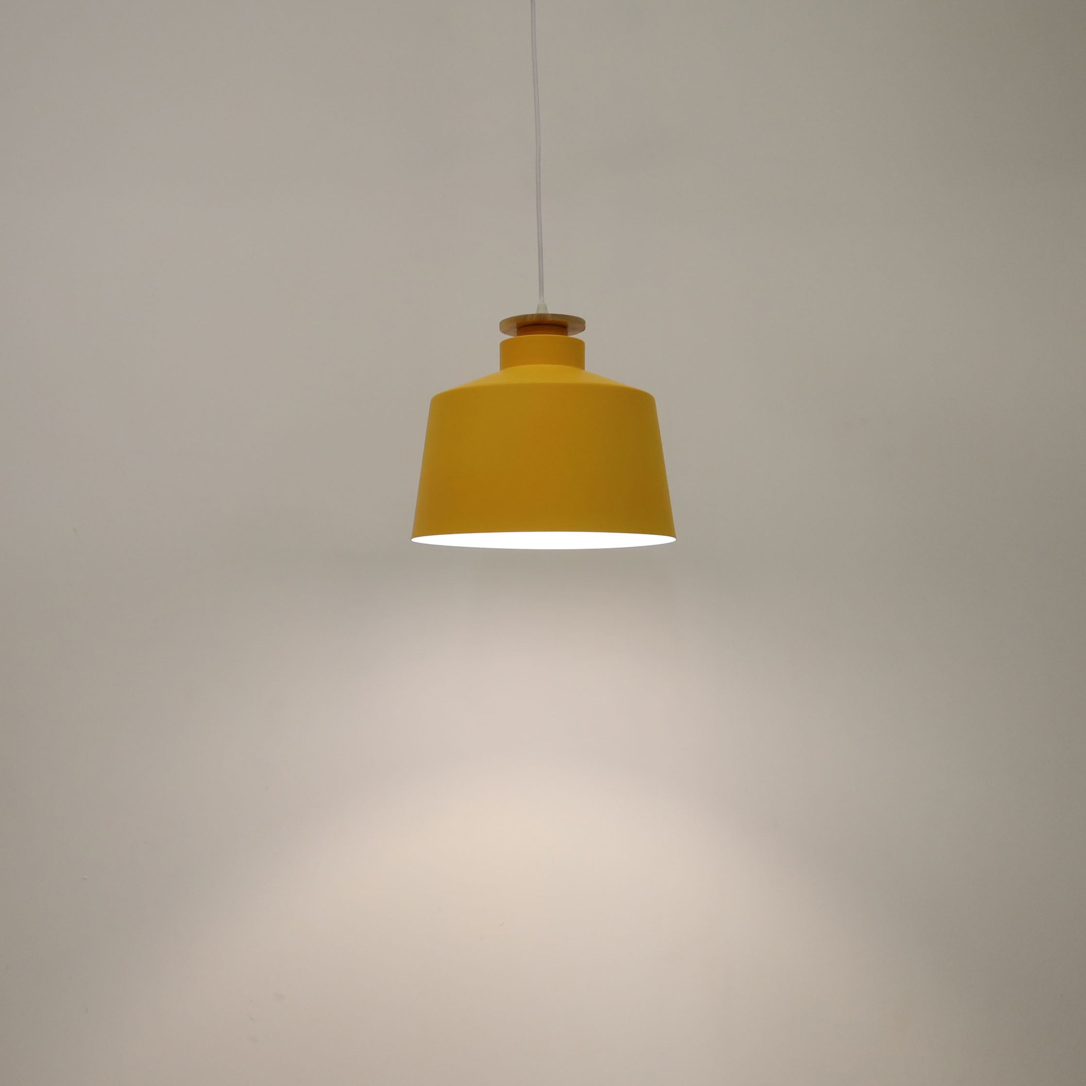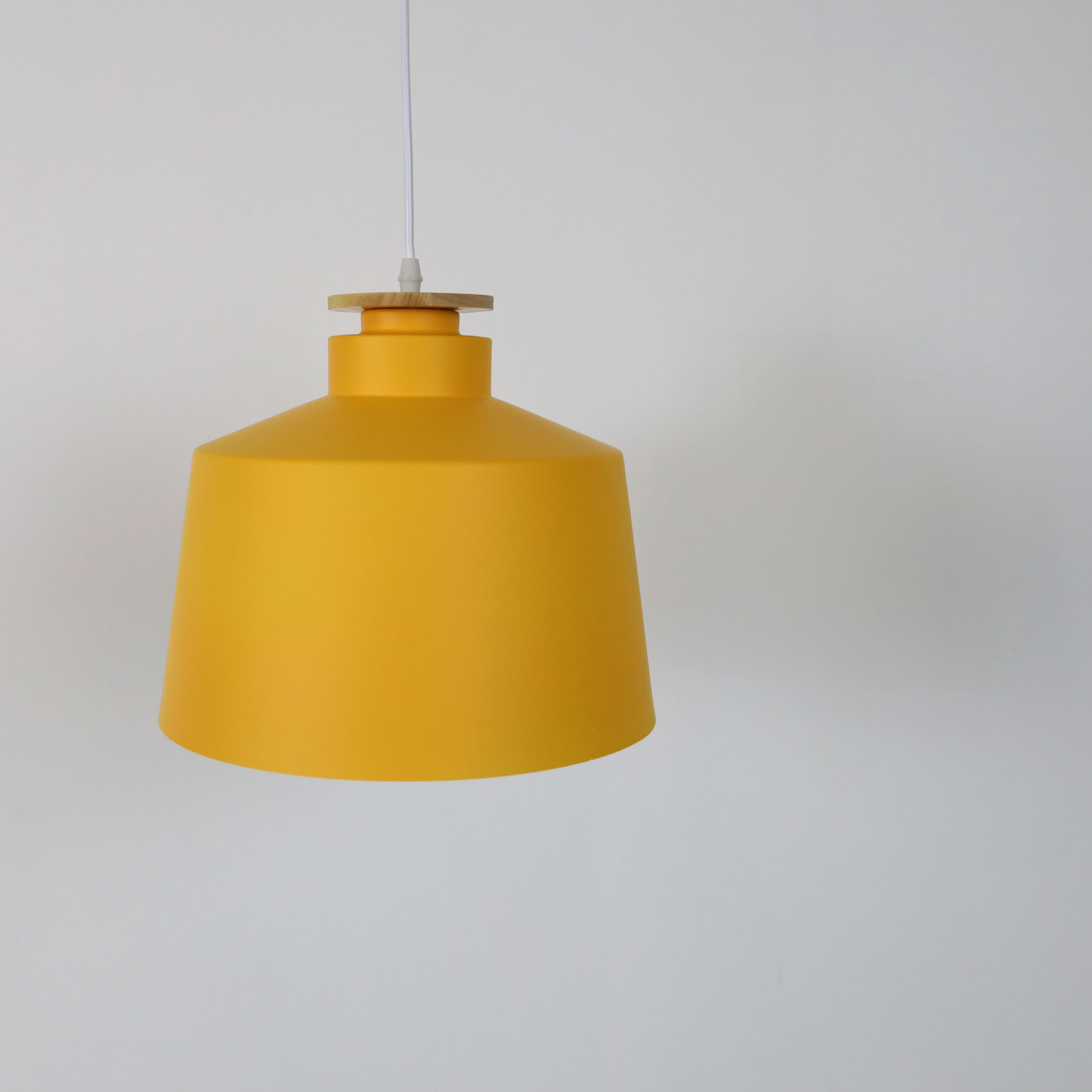Modern pendant light in minimal aesthetic. Vivid yellow color. Featuring a metallic lampshade with a wooden merge element. Featuring an adjustable cable height.
