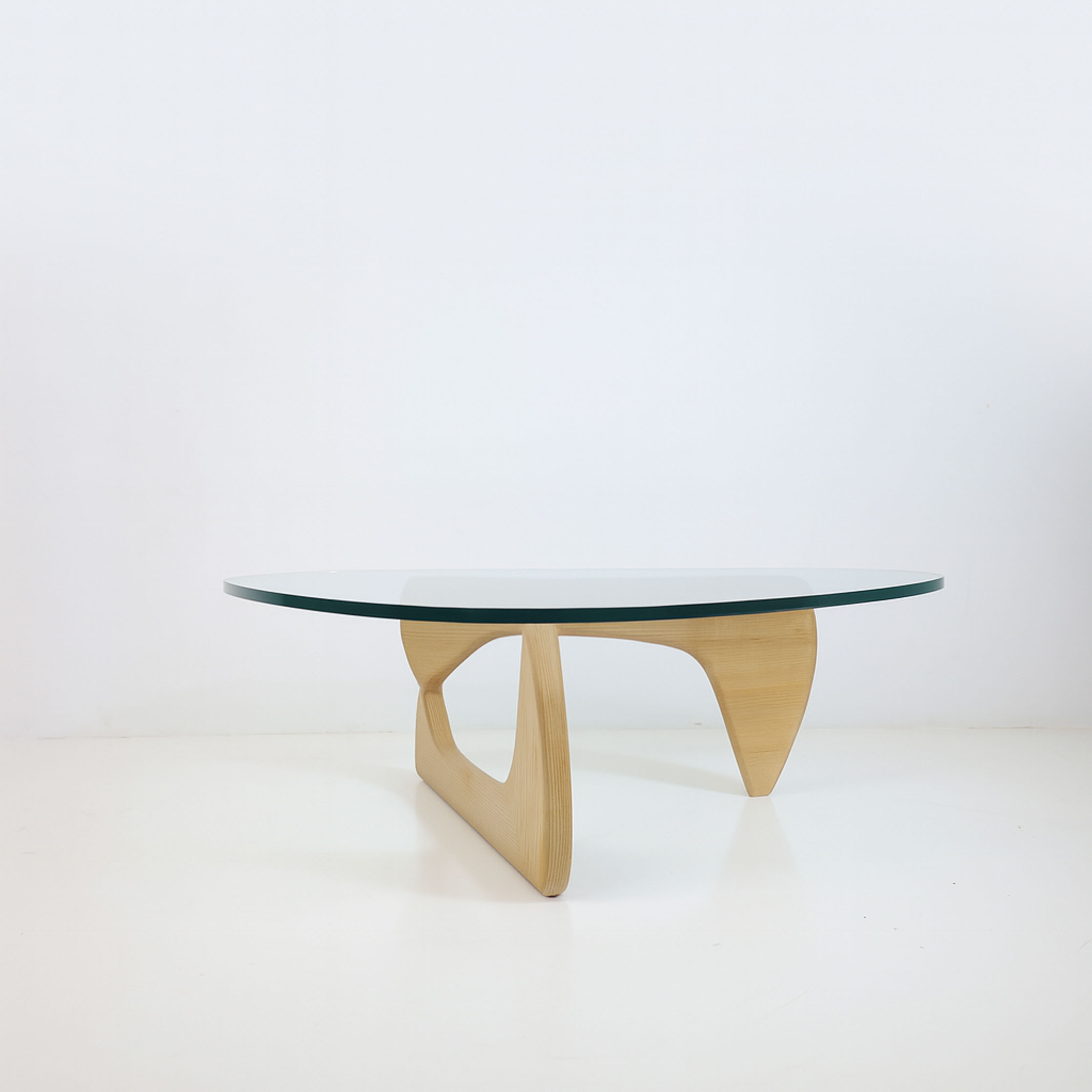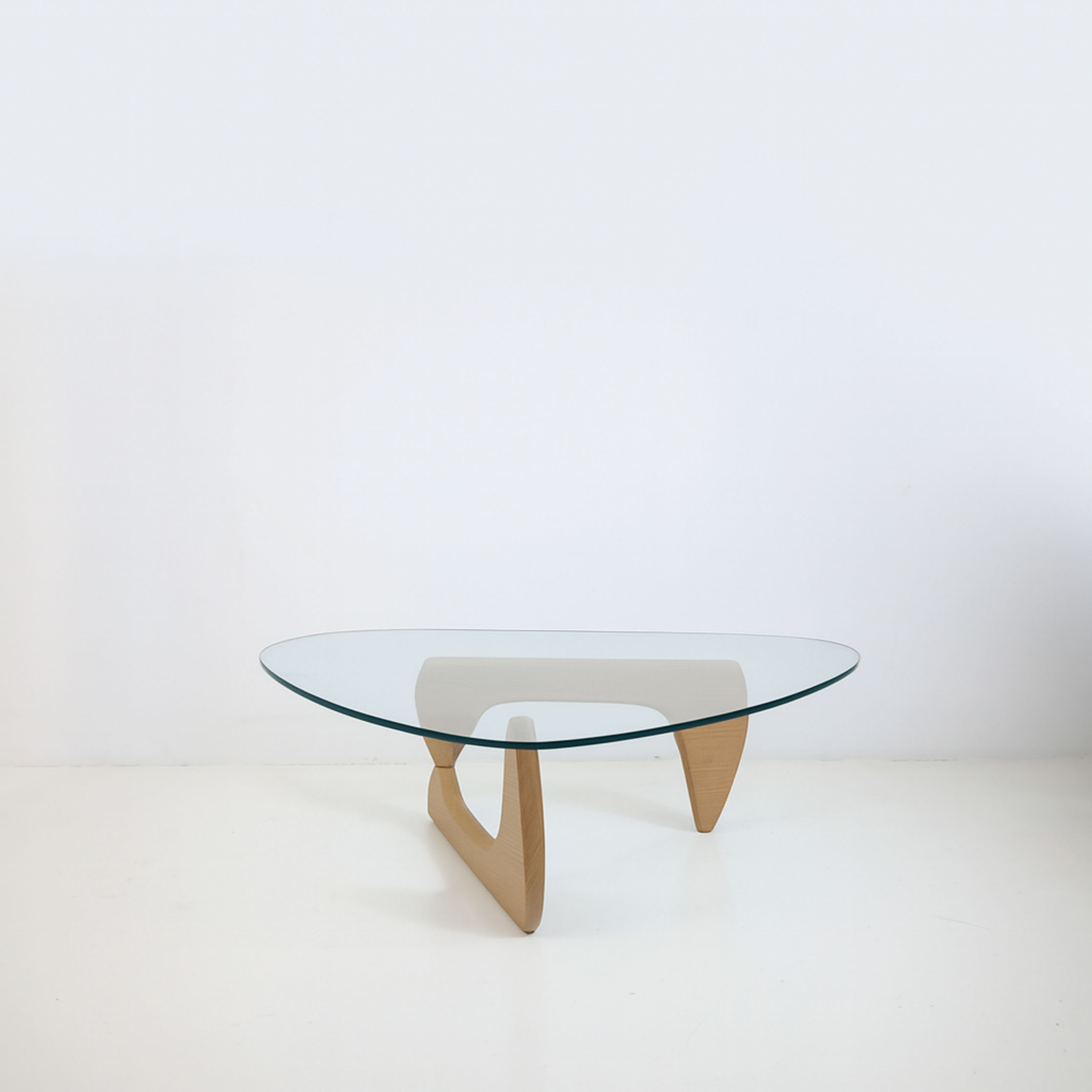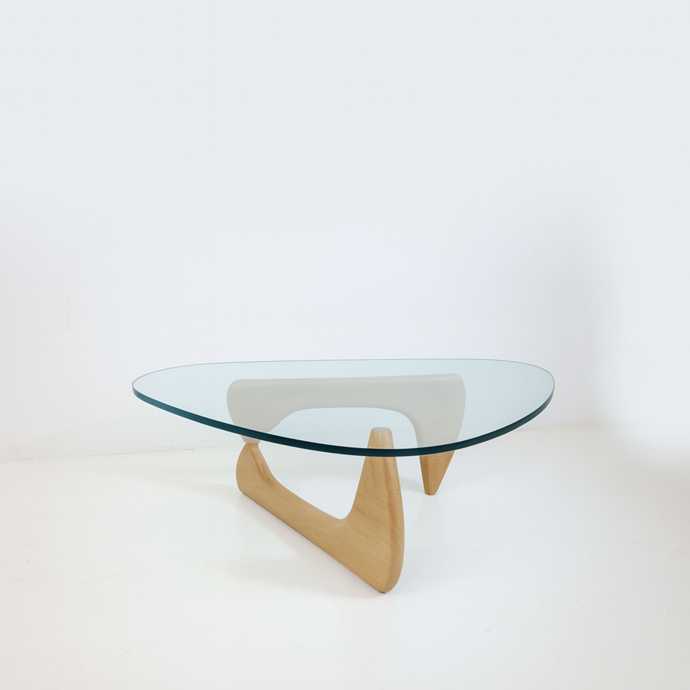 The iconic design of the coffee table unites form and function in a harmonious way. In the design of Isamu Noguchi’s coffee table. The brilliantly simple design consists of two identical solid oak wooden elements supporting the rounded tabletop made of thick, durable beveled crystal glass. In excellent condition.