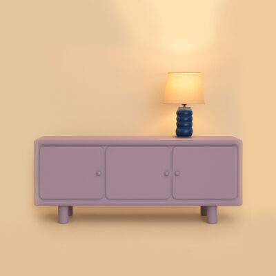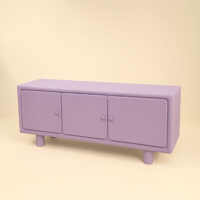 €640.00€590.00A three-door sideboard with a soft lilac, matte textured finish. Its rounded edges and cylindrical legs create a clean, minimal shape with a sculptural feel. Simple yet distinctive, it adds a warm and contemporary touch to any interior.