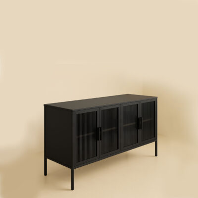 €460.00€390.00A sleek, contemporary sideboard with ribbed glass doors and a matte black metal frame. Designed for modern interiors, it offers discreet storage with a refined, architectural look.