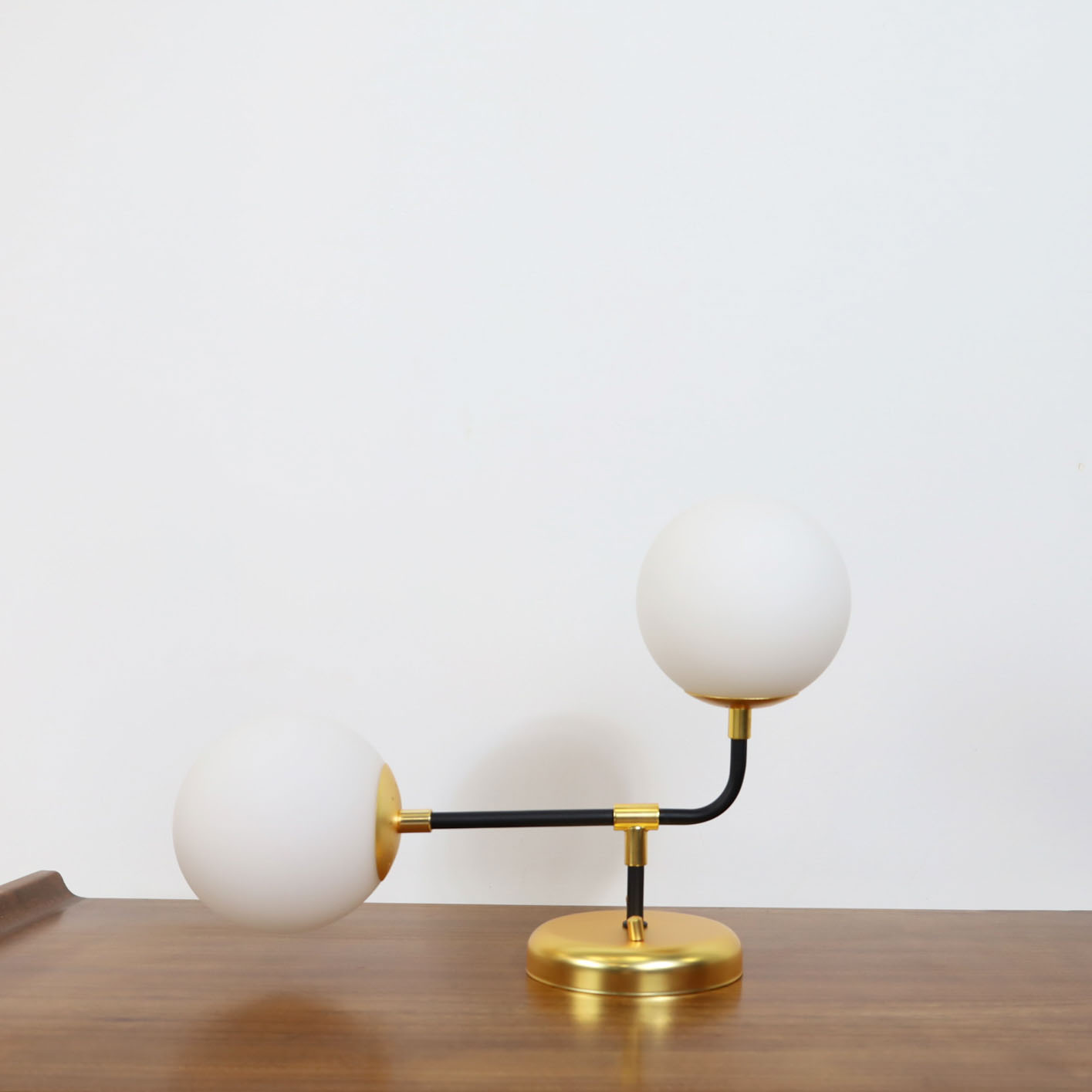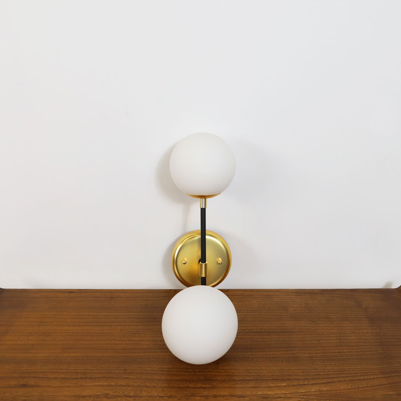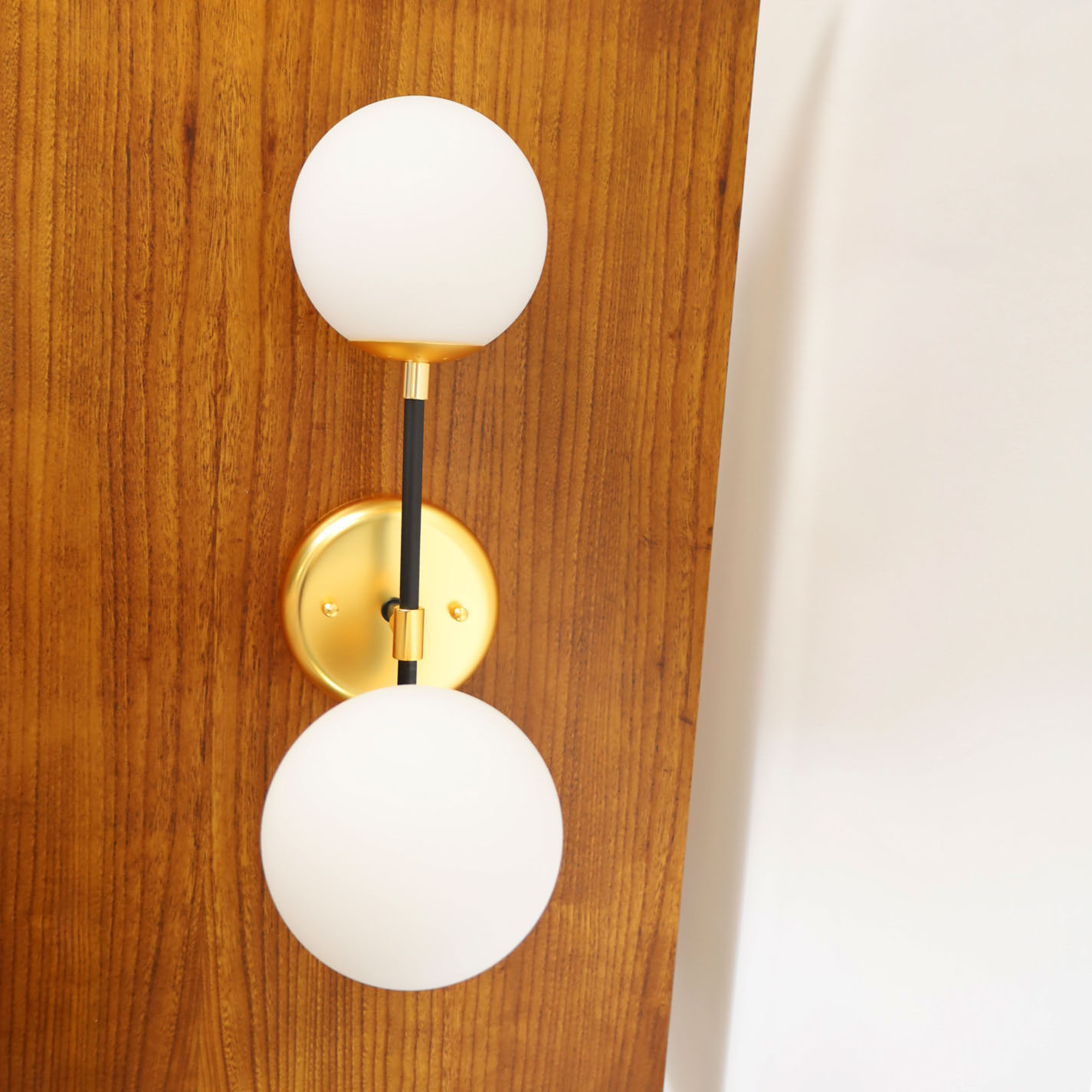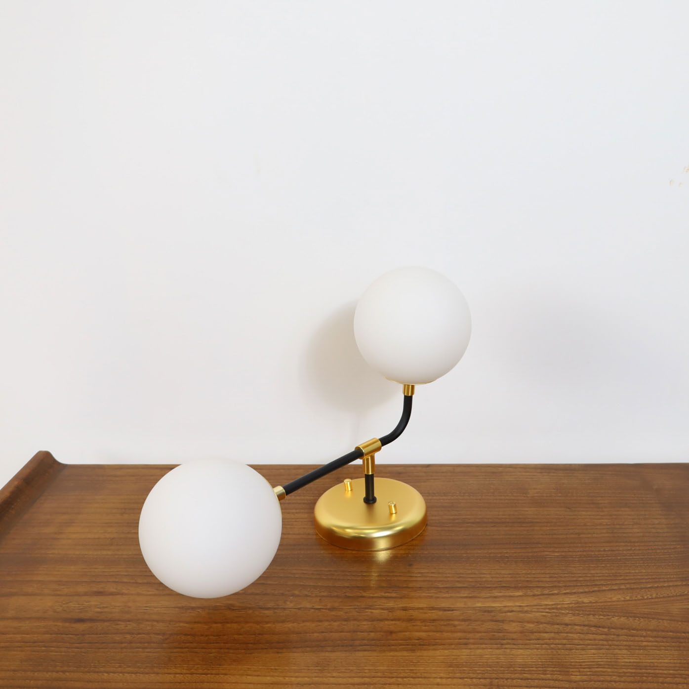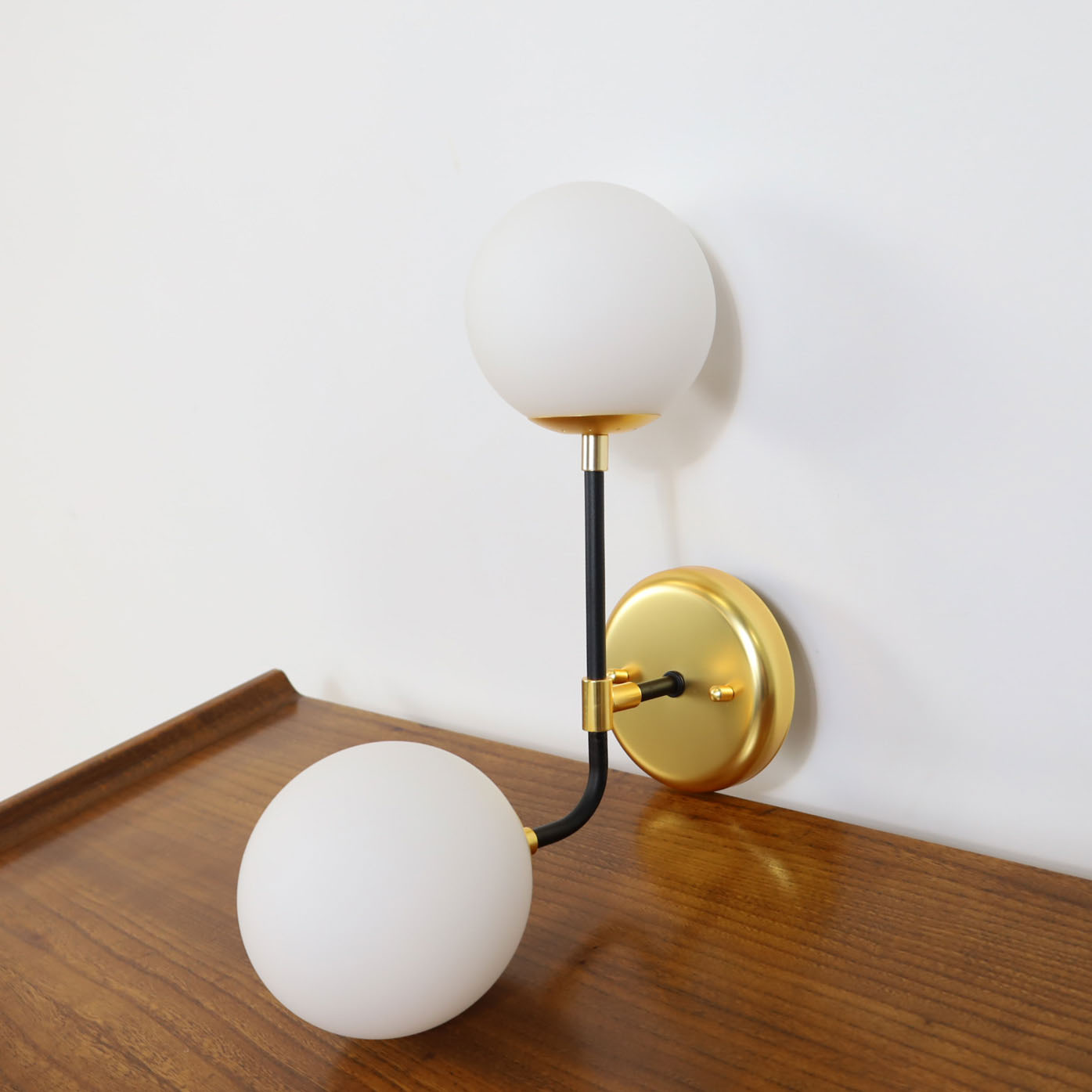 €195.00€155.00Mid century double wall scone, in metal base featuring two globes glass lights. Fully remanufactured, with LED technology and European Plug. In excellent condition — This vintage item has no defects.