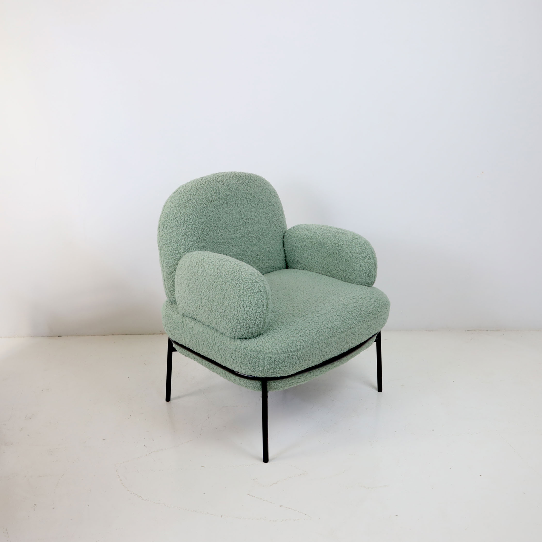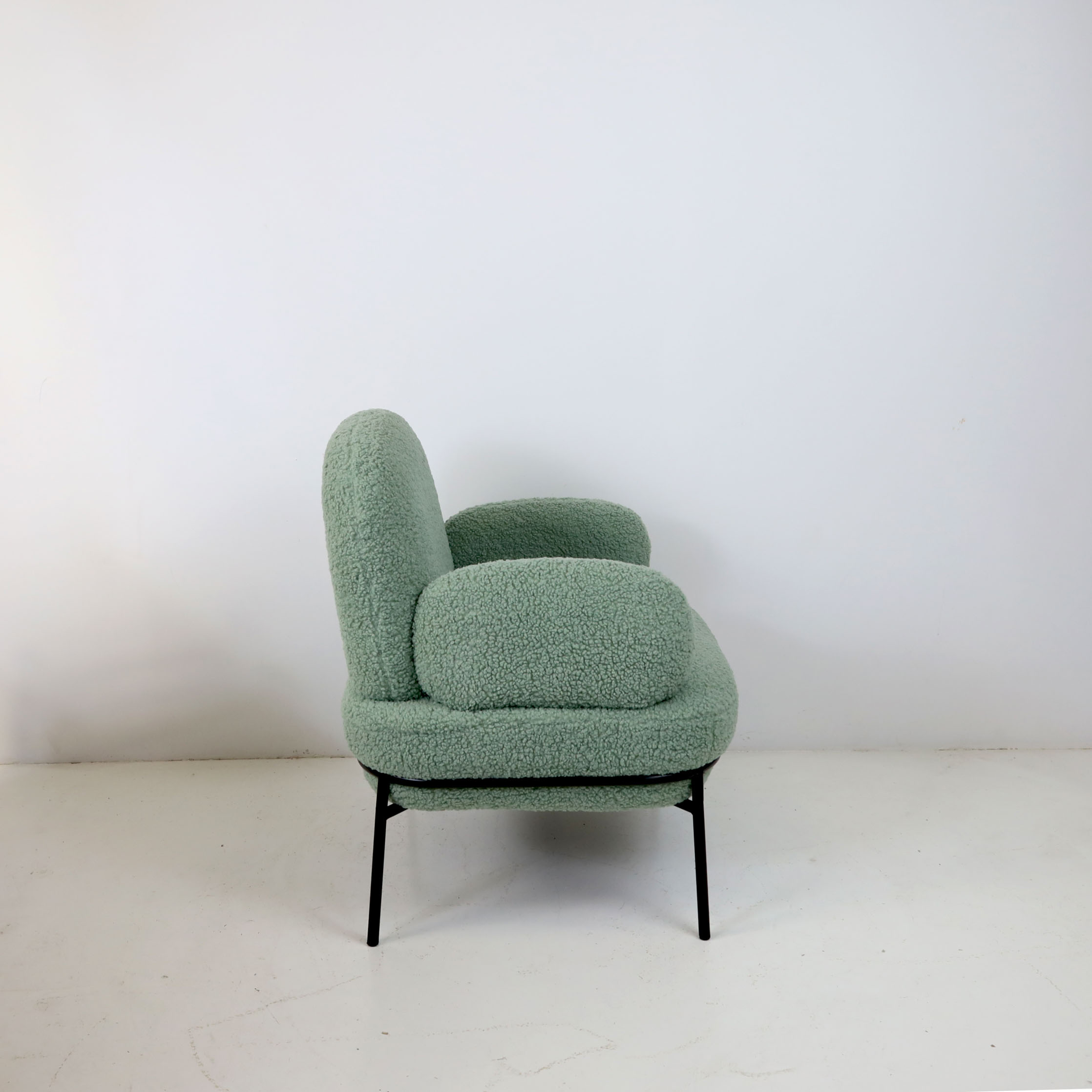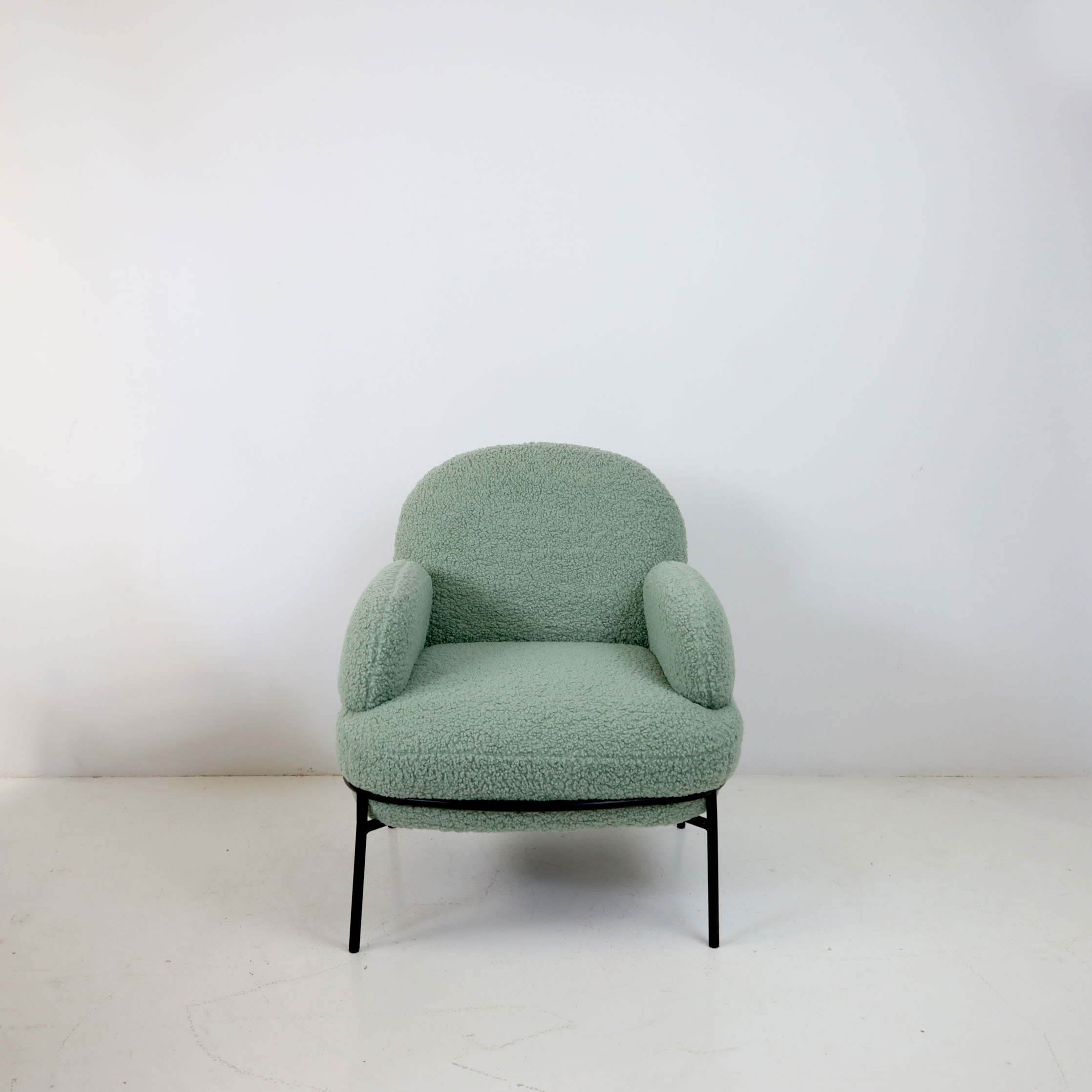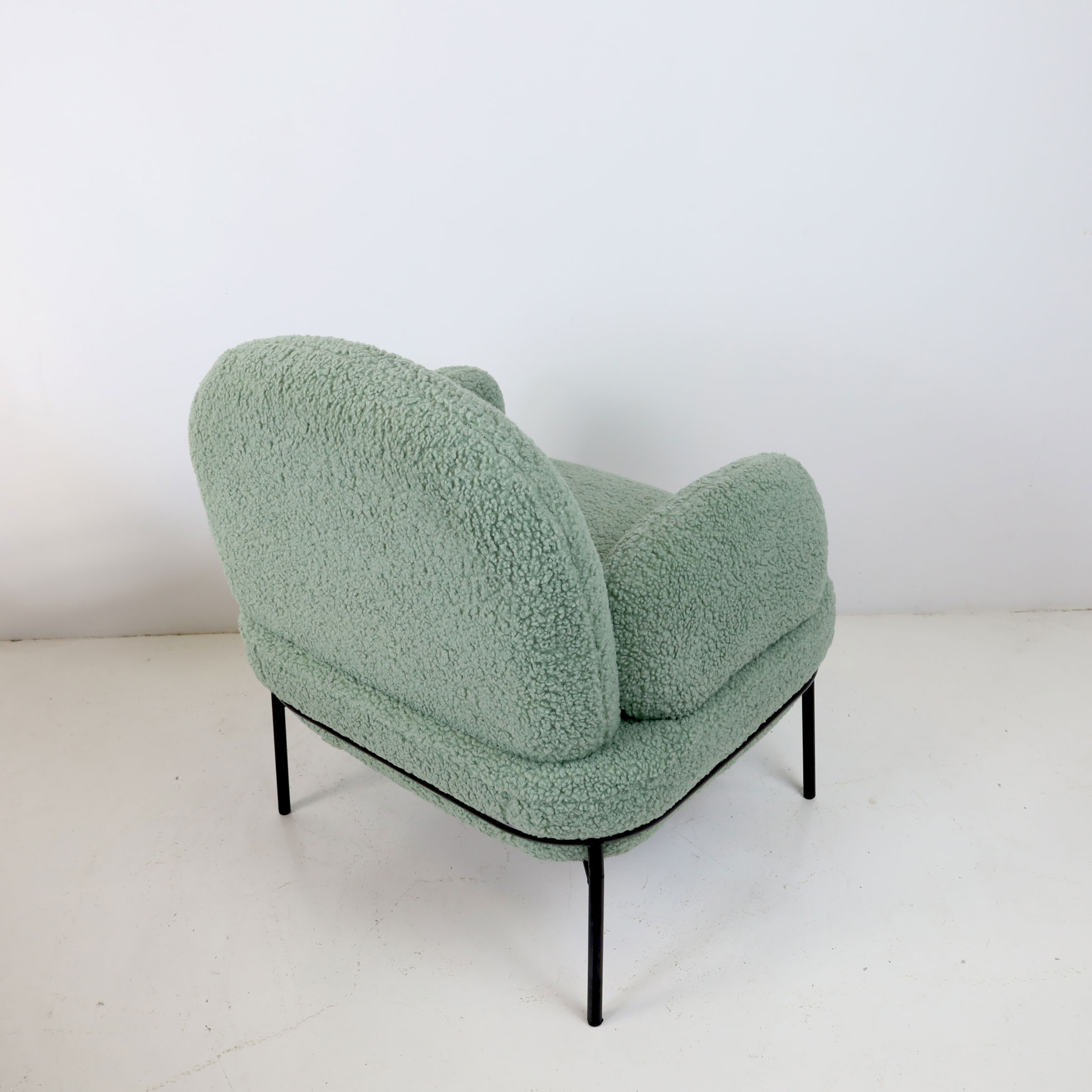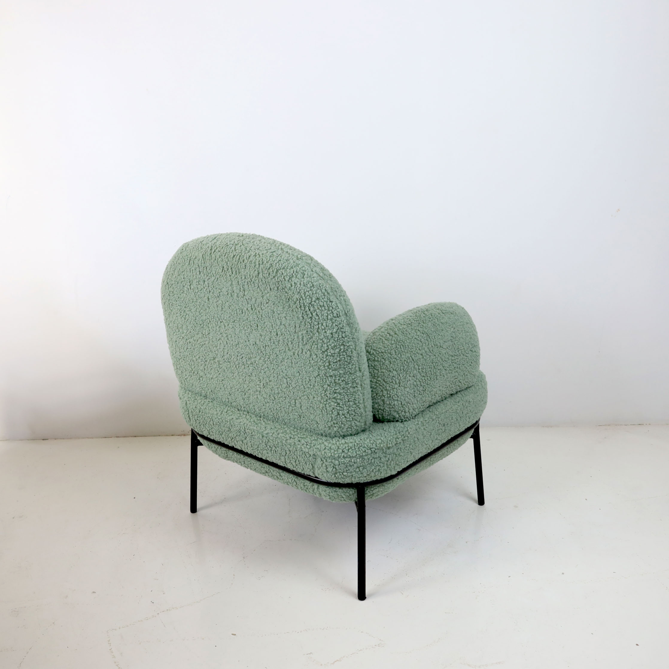 Modern lounge chair set upon a metallic base. Featuring a pale petrol boucle fabric. An ideal accent for any modern living room or bedroom, this chair is thoughtfully designed to occupy minimal floor space while providing maximum relaxation.
