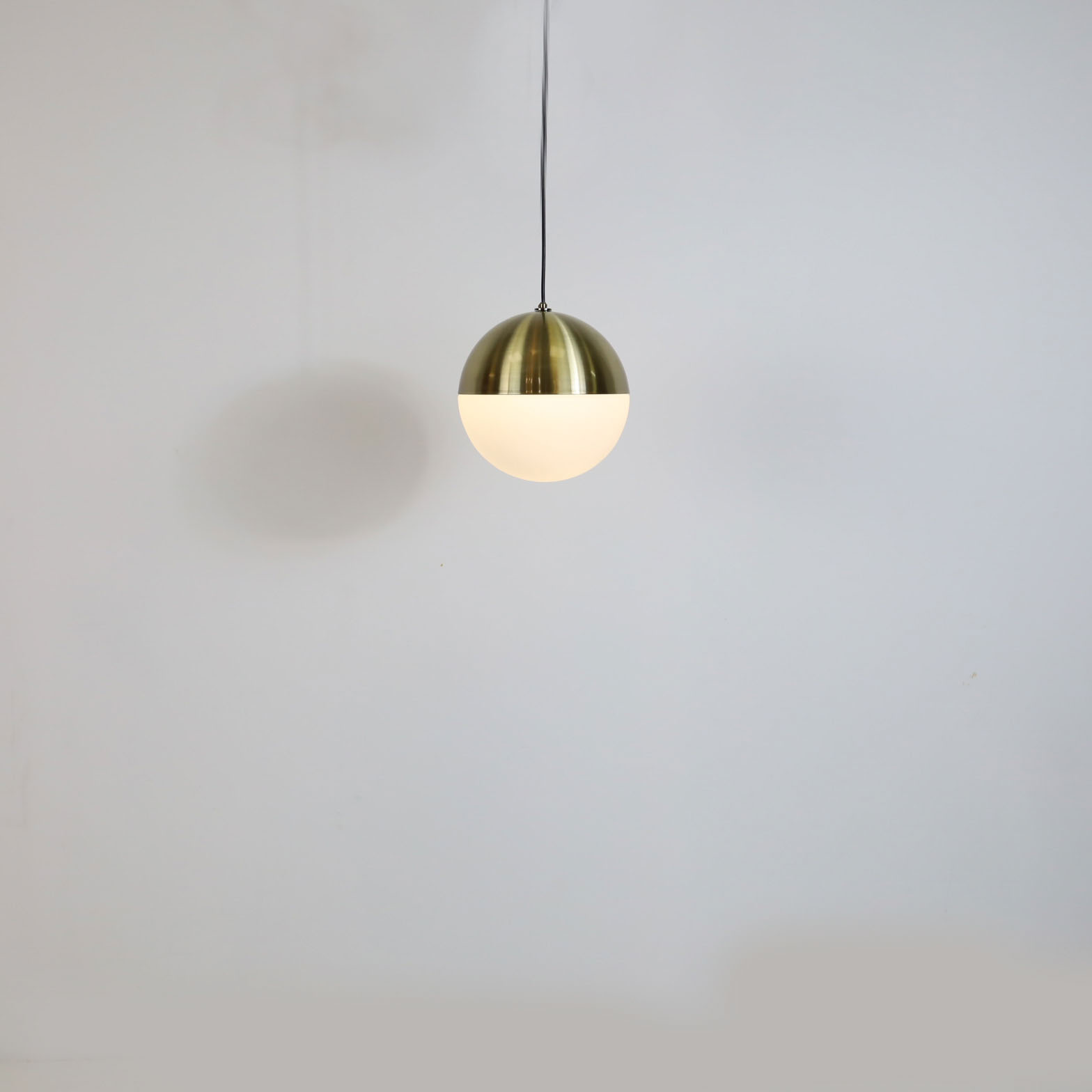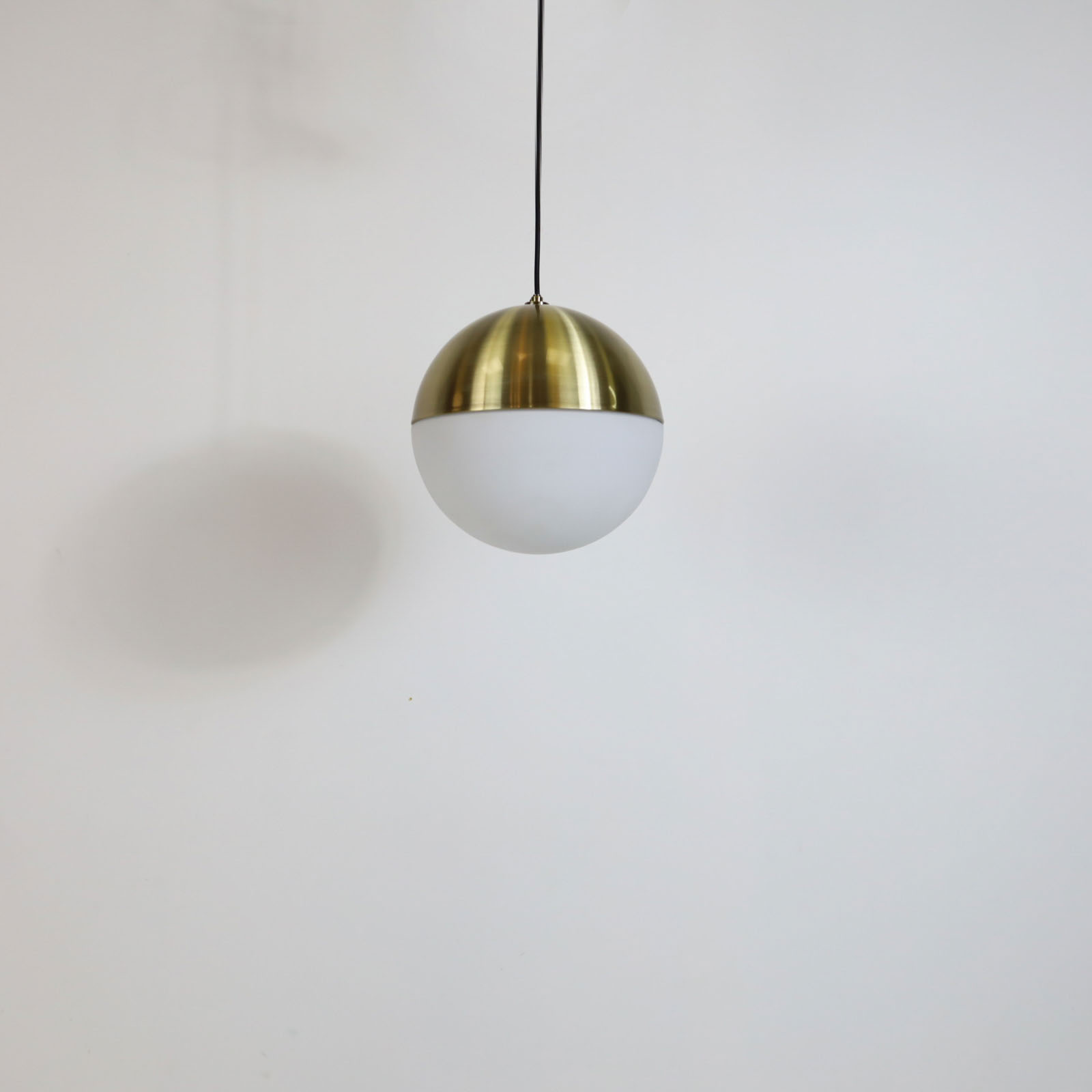 Modern pendant light. Featuring an opaline lampshade and a metallic light bronze upper part. In excellent condition.