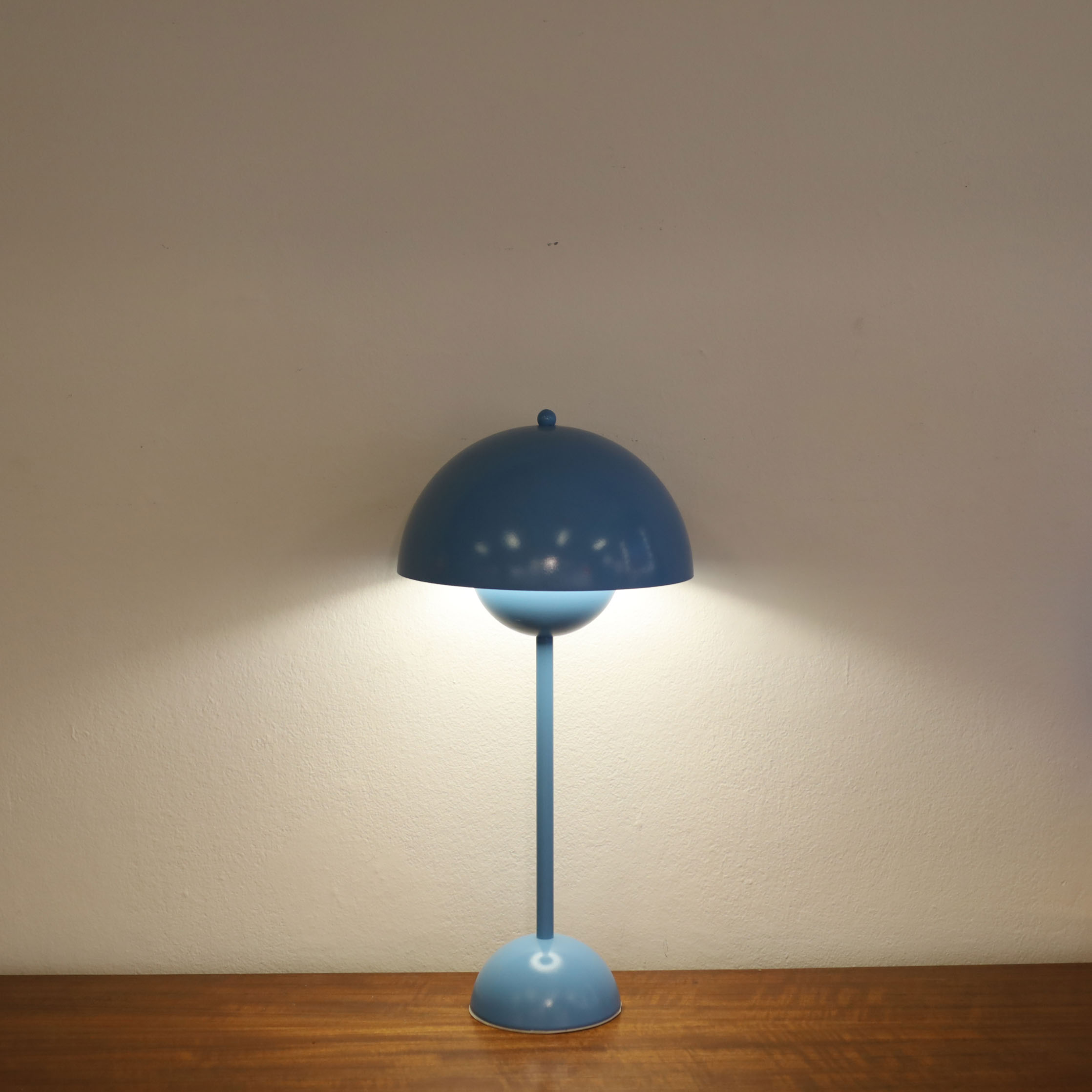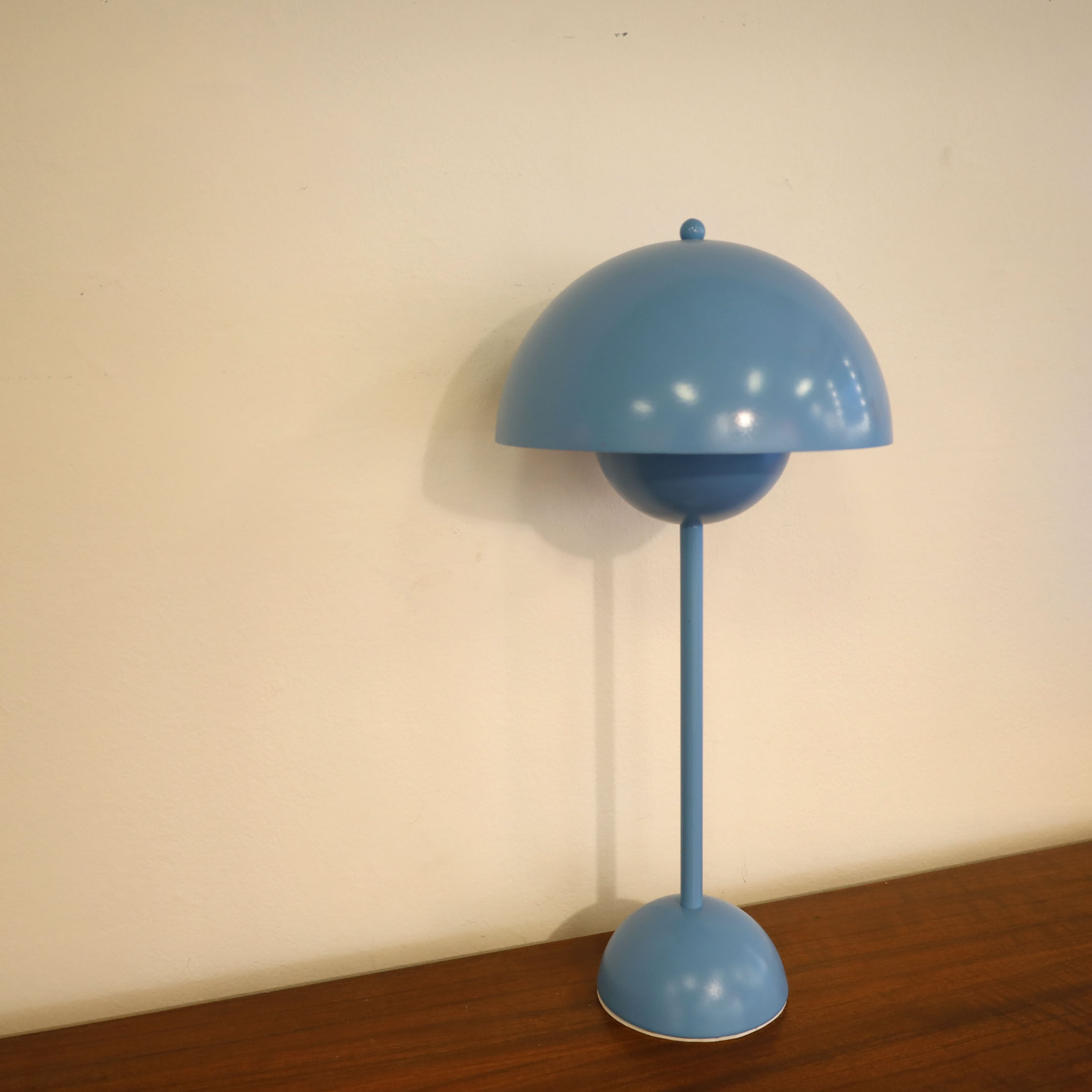 €580.00€420.00Mid Century table lamp in white colour of opaline glass featuring blue flowers. Fully remanufactured, with a new lampshade (based on the original form), LED technology, and European Plug. Set upon an inox disk base. This table lamp has the ability to light up individually or in combination. In excellent condition — This vintage item has no defects.