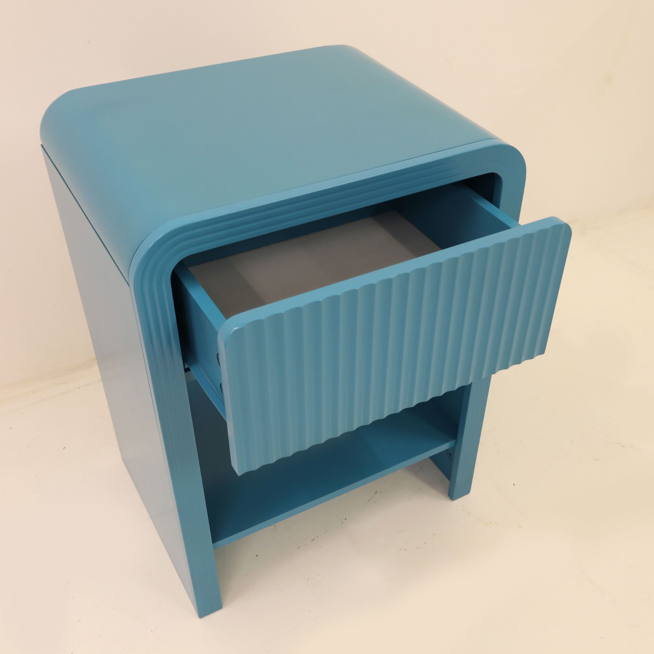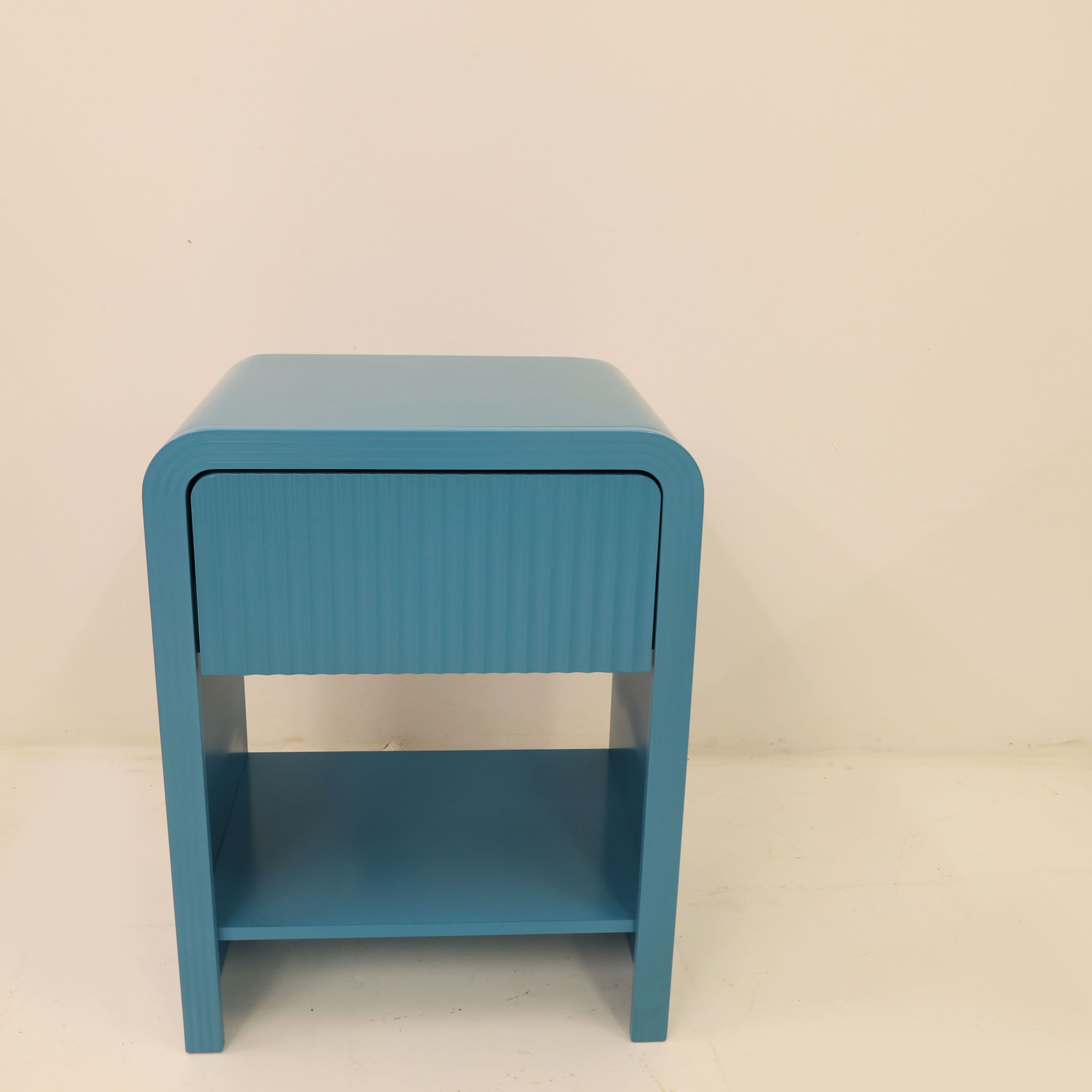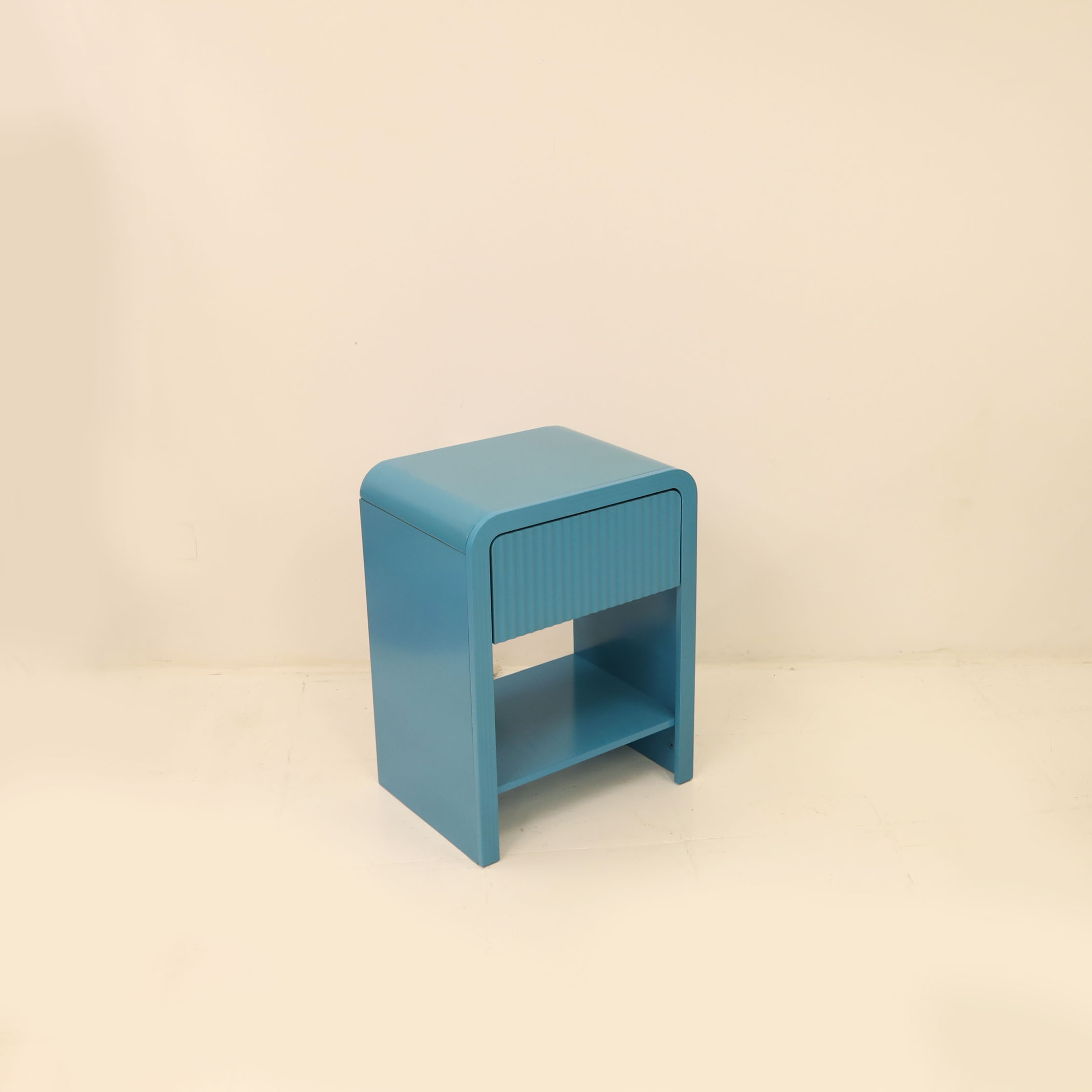 Sleek and modern bedside table crafted from high-quality fiber MDF. Featuring a unique curved-edge design and a bold dark celeste, it adds a pop of personality to any space. The piece includes a convenient hidden compartment, perfect for books, decor, or daily essentials. An ideal choice for lovers of minimal design with a playful twist.