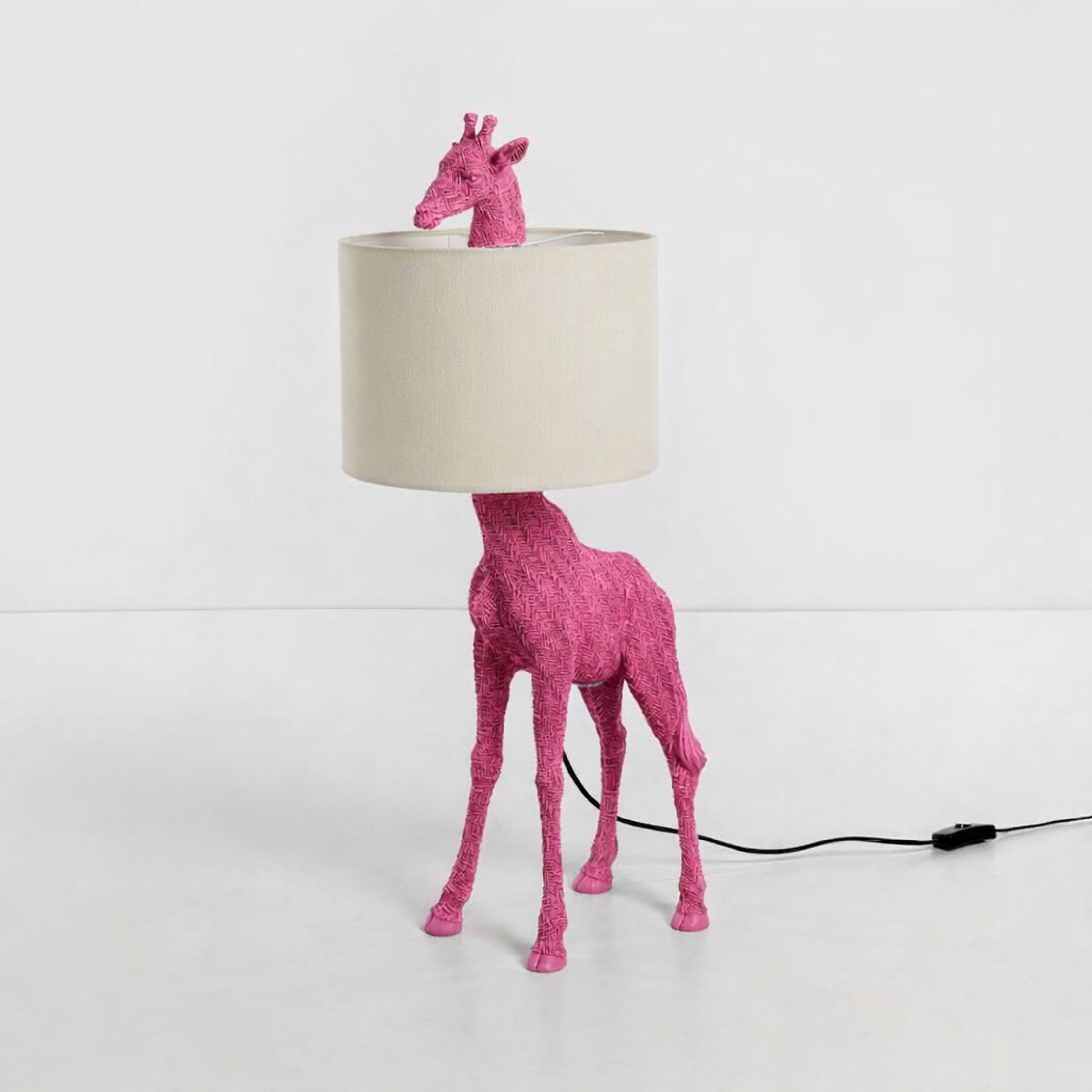 A playful and sculptural table lamp featuring a giraffe form in a bold pink textured finish. Topped with a soft fabric shade that diffuses a warm ambient glow. Perfect for statement interiors or creative spaces.