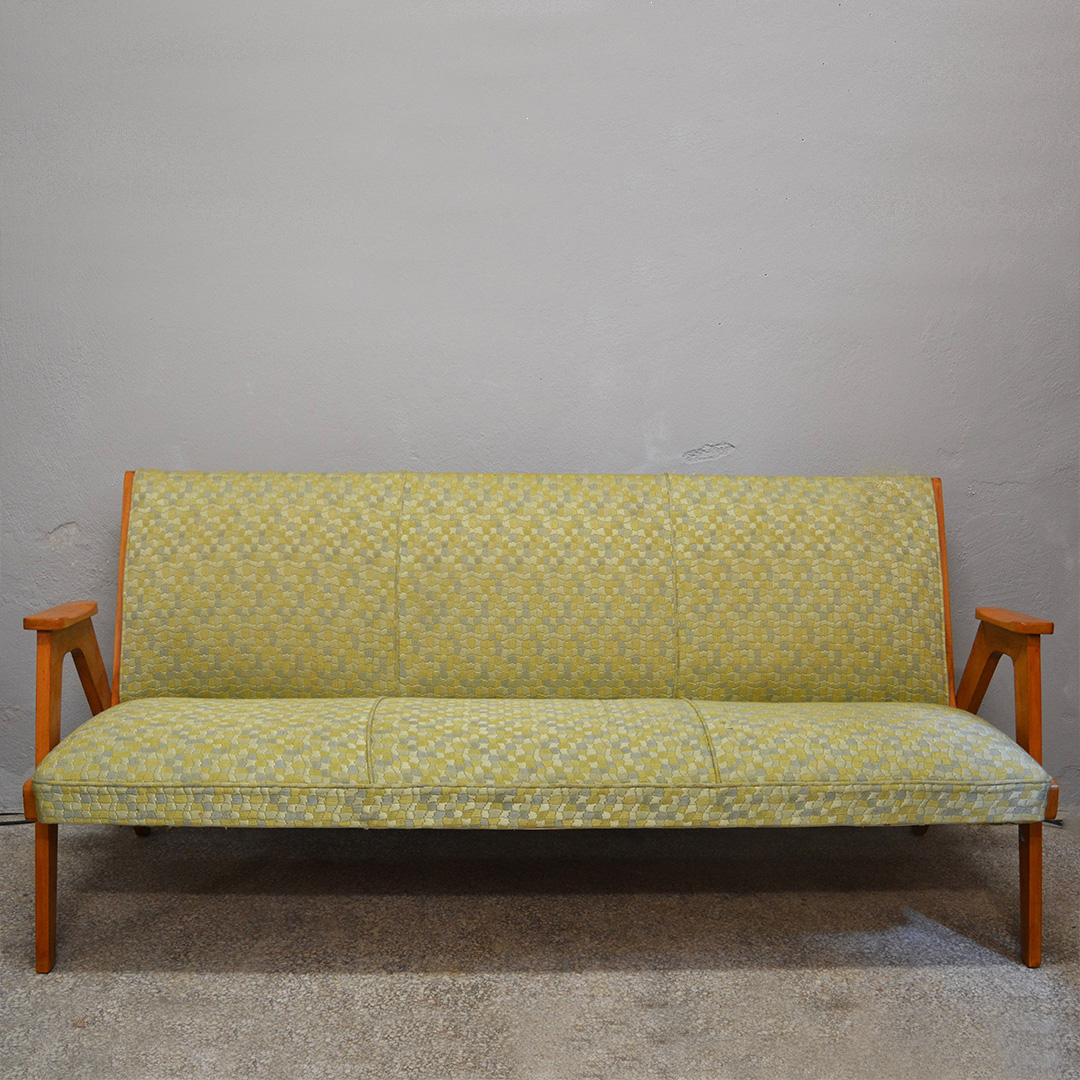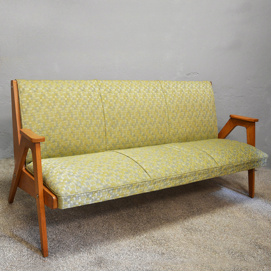 Mid-Century “Scandinavian ” Sofa, in original refreshed and professionally cleaned upholstery. Scandinavian Modern style. This vintage item is in very good condition because it has been refreshed through refinishing with Danish oil.