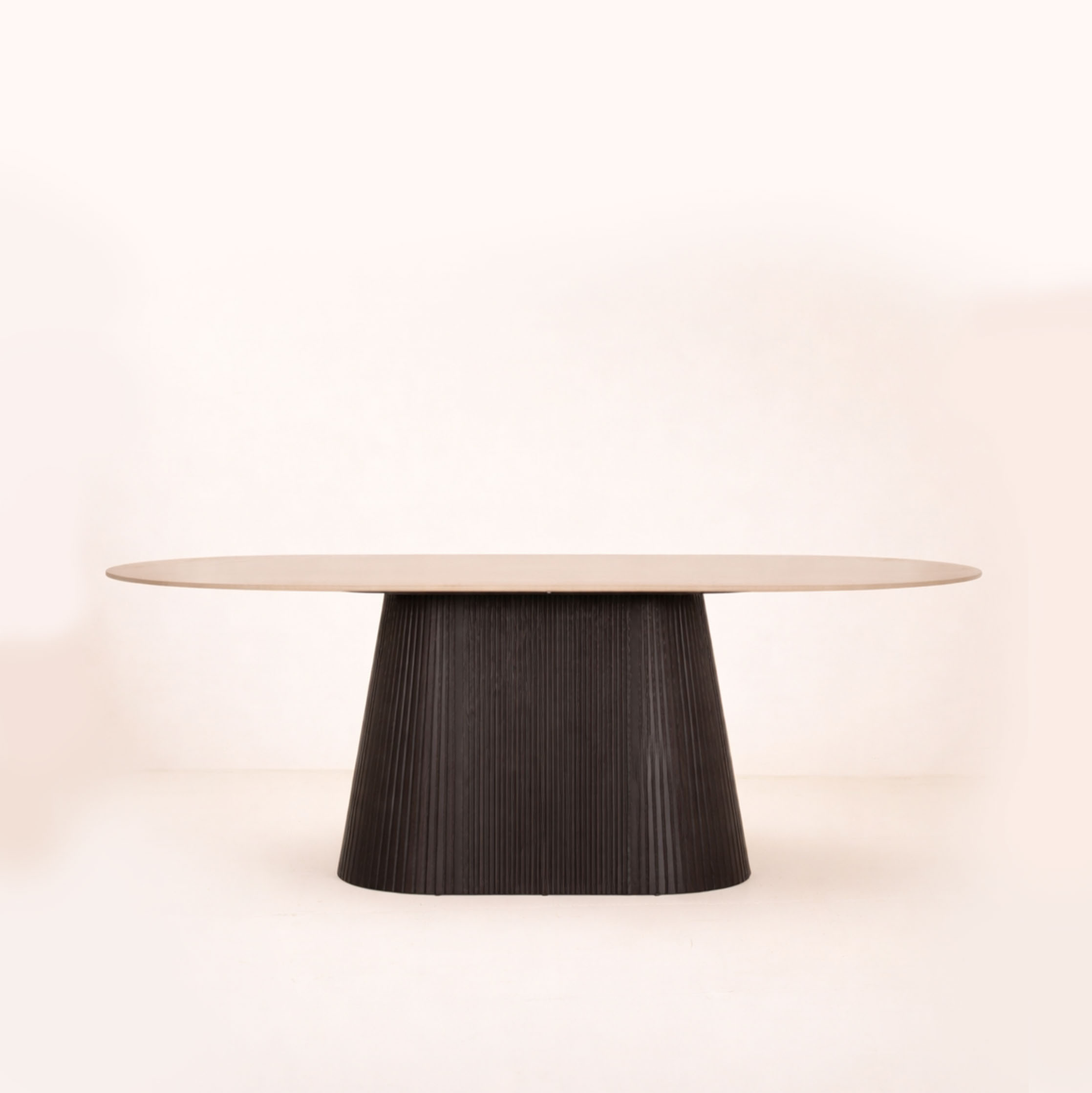 A sculptural oval dining table with a calm architectural presence. Its ceramic tabletop in travertine stone finish offers a refined, natural look, while the base is crafted entirely from MDF in a dark brown tone, featuring subtle vertical fluted detailing. Balanced and understated, designed to integrate effortlessly into contemporary and minimal interiors.