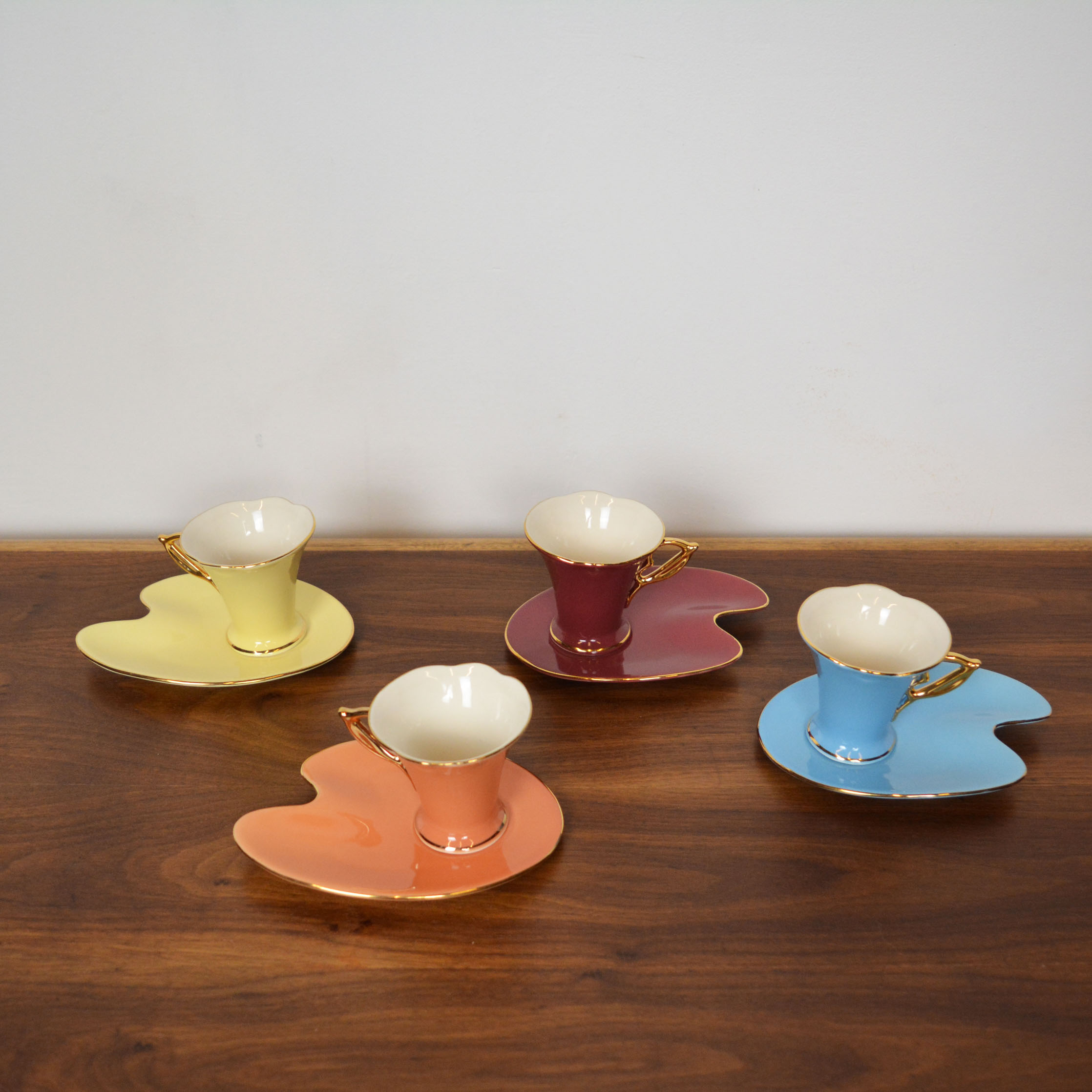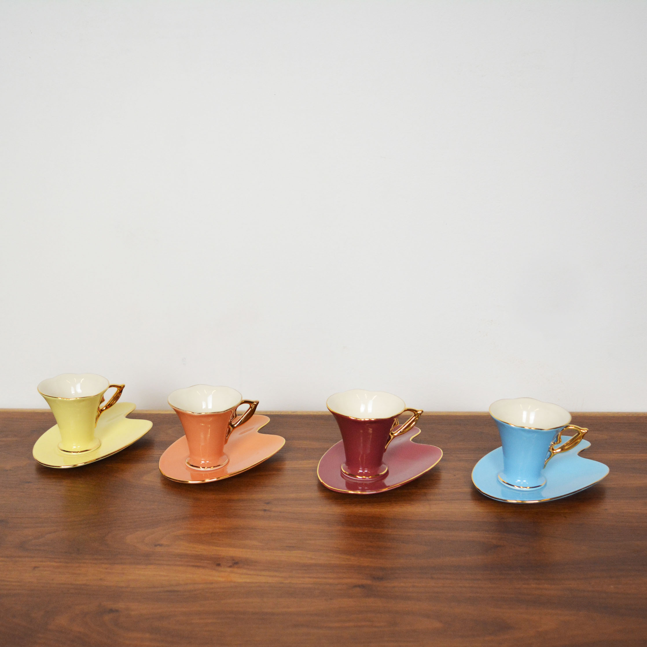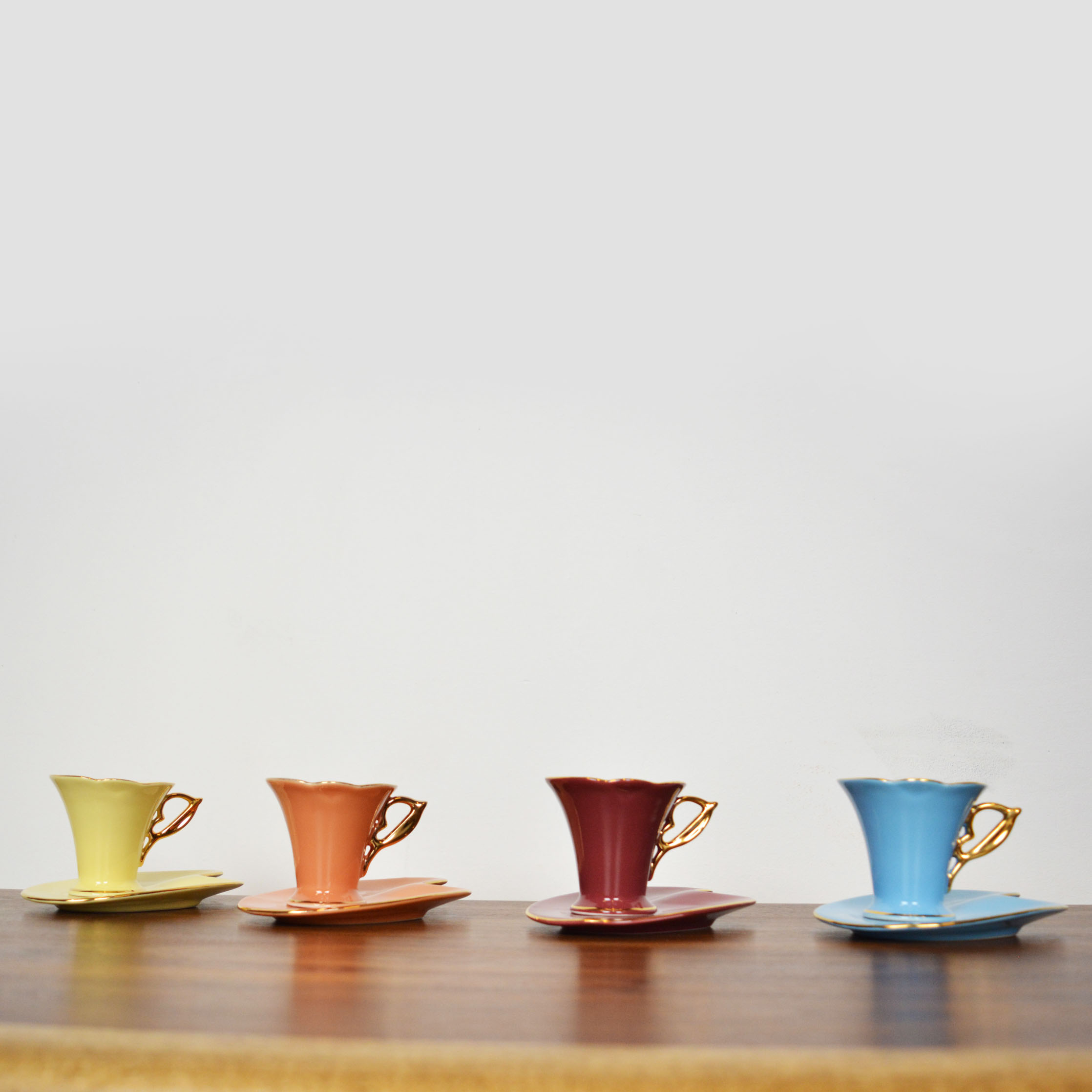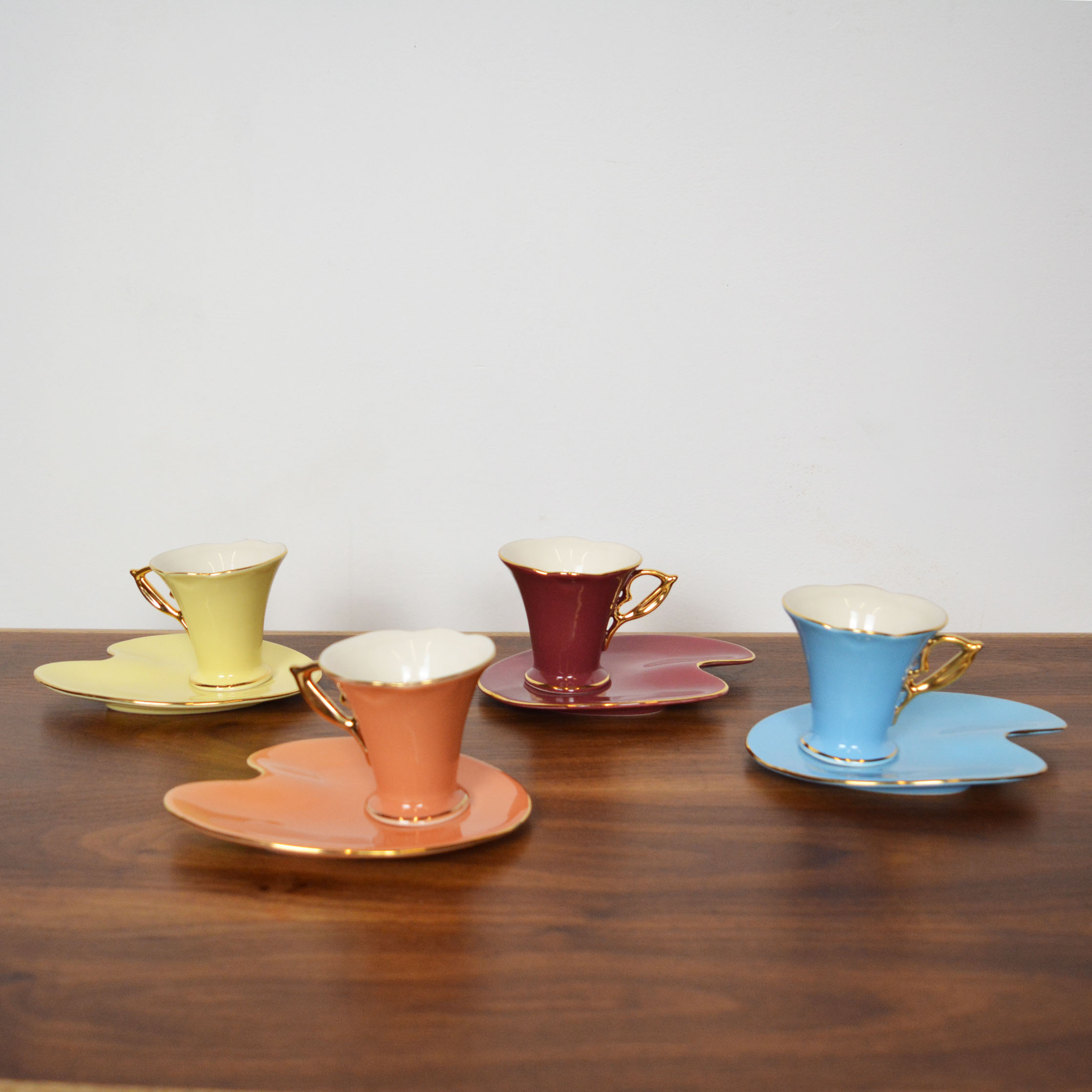 Set of four porcelain coffee cups with plates. In excellent vintage condition.