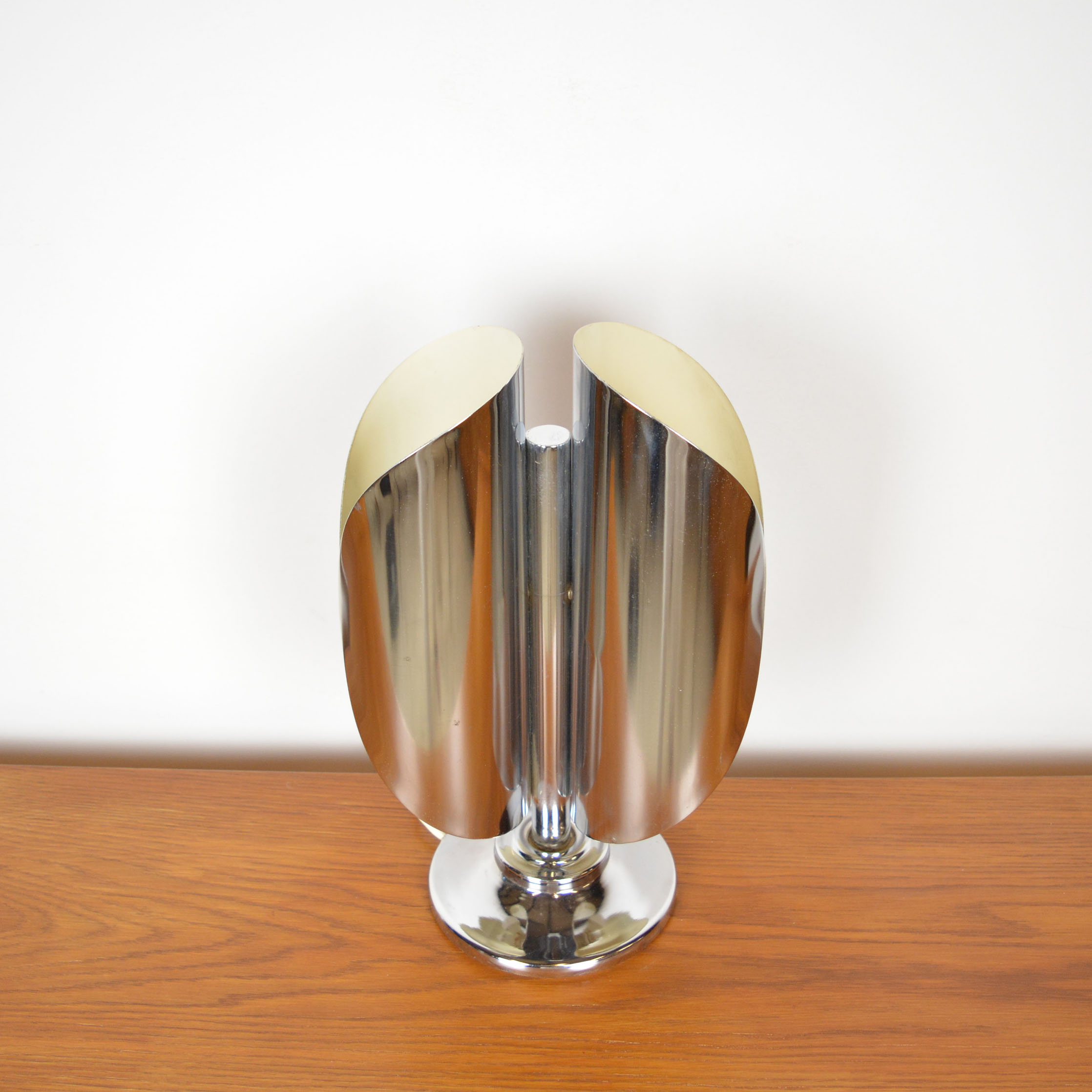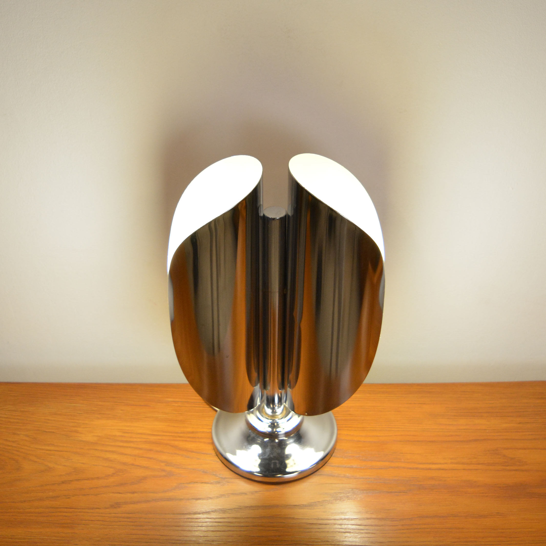 Space Age table lamp with 2 sockets. Italy 1960s, made of chromed metal and stainless steel. Fully remanufactured, LED technology, and European Plug. In excellent vintage condition.