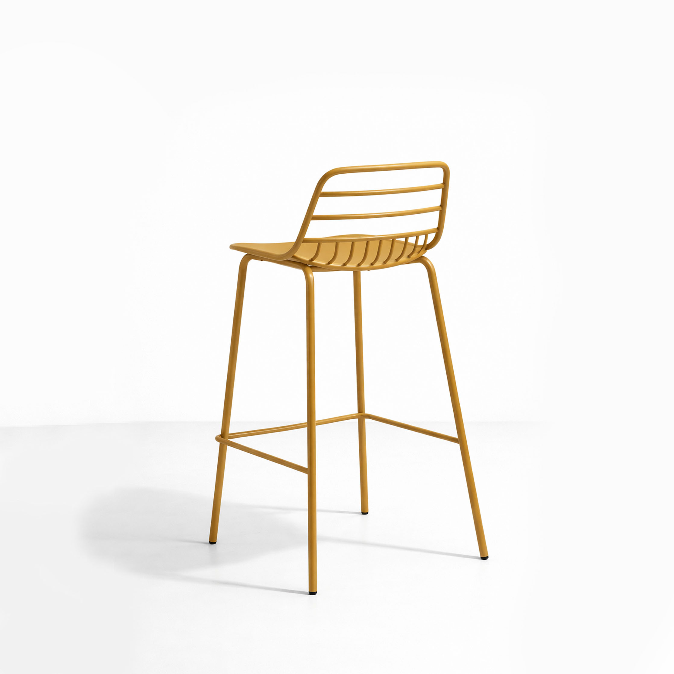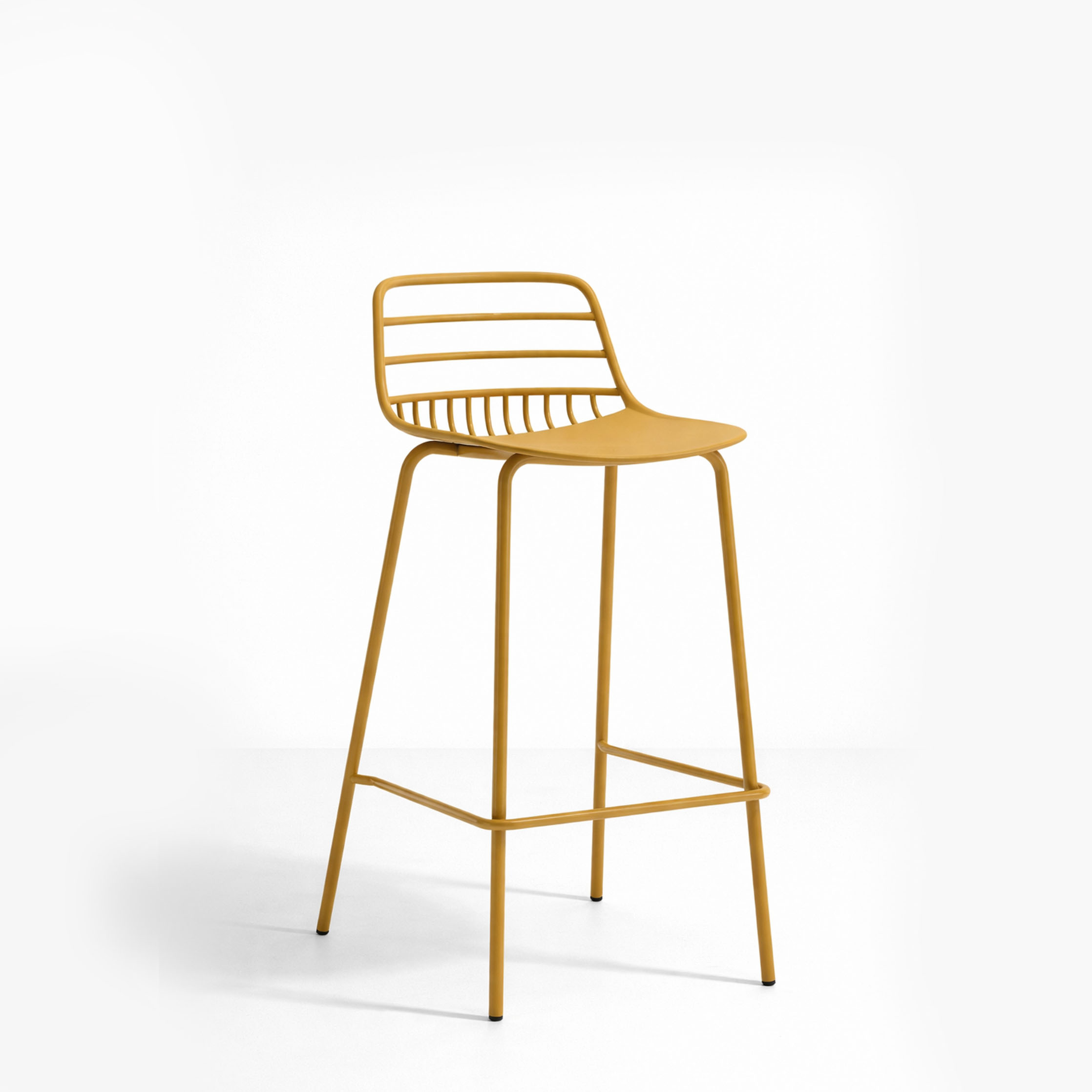 A clean-lined bar chair with a graphic slatted backrest and soft curves. Its lightweight metal frame and matte finish create a balanced mix of structure and comfort, making it ideal for modern interiors or kitchens.