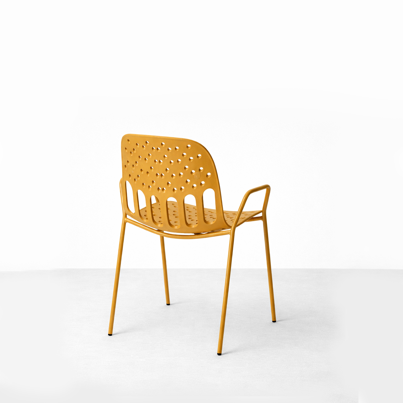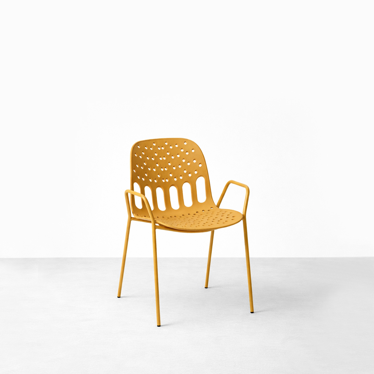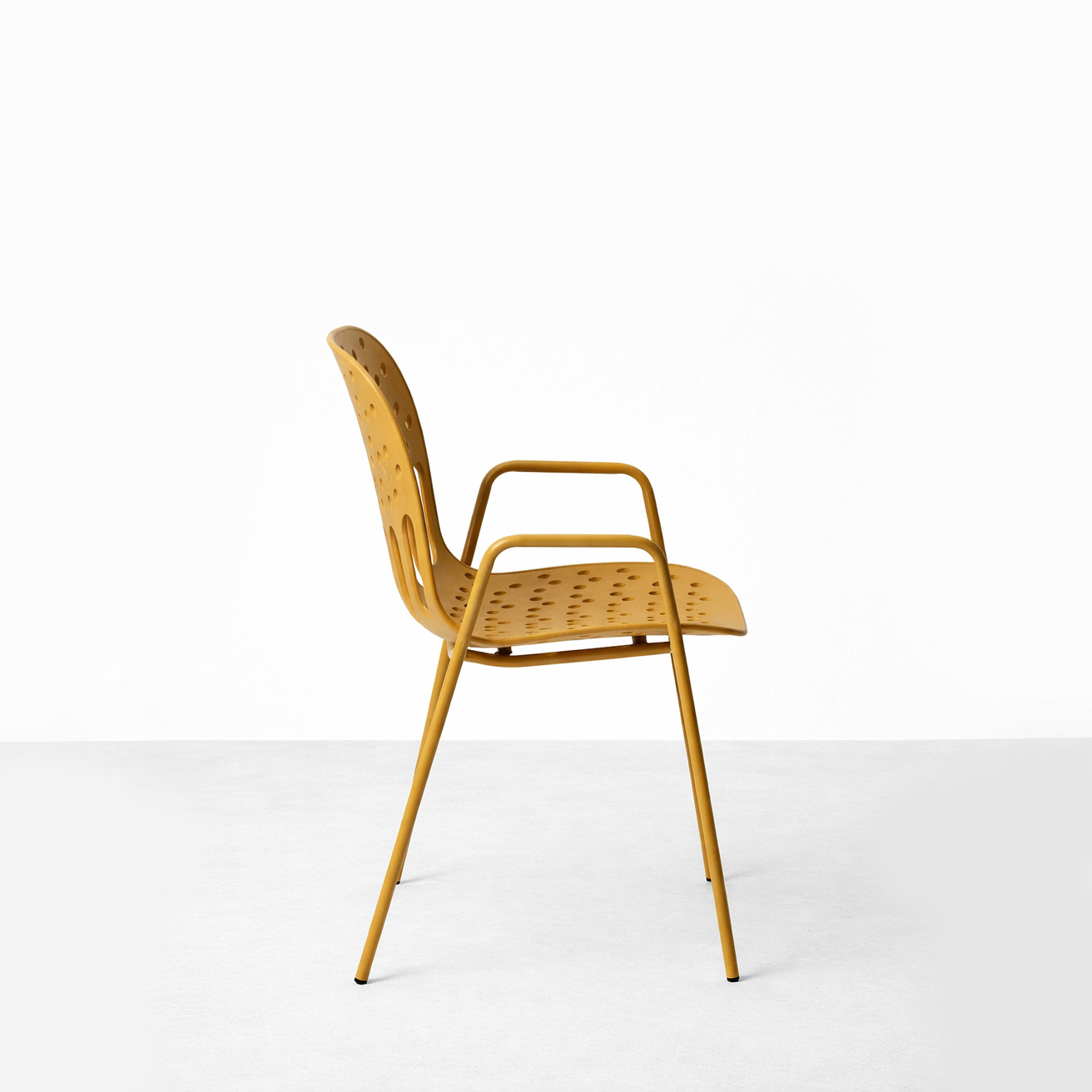 A clean, graphic chair with a playful perforated backrest and soft rounded lines. The lightweight silhouette balances minimal structure with a bold presence, making it ideal for both indoor and outdoor settings. Crafted from durable PP (polypropylene) with UV protection, it is designed to withstand sunlight while maintaining its color and integrity. Stackable, practical, and visually distinctive