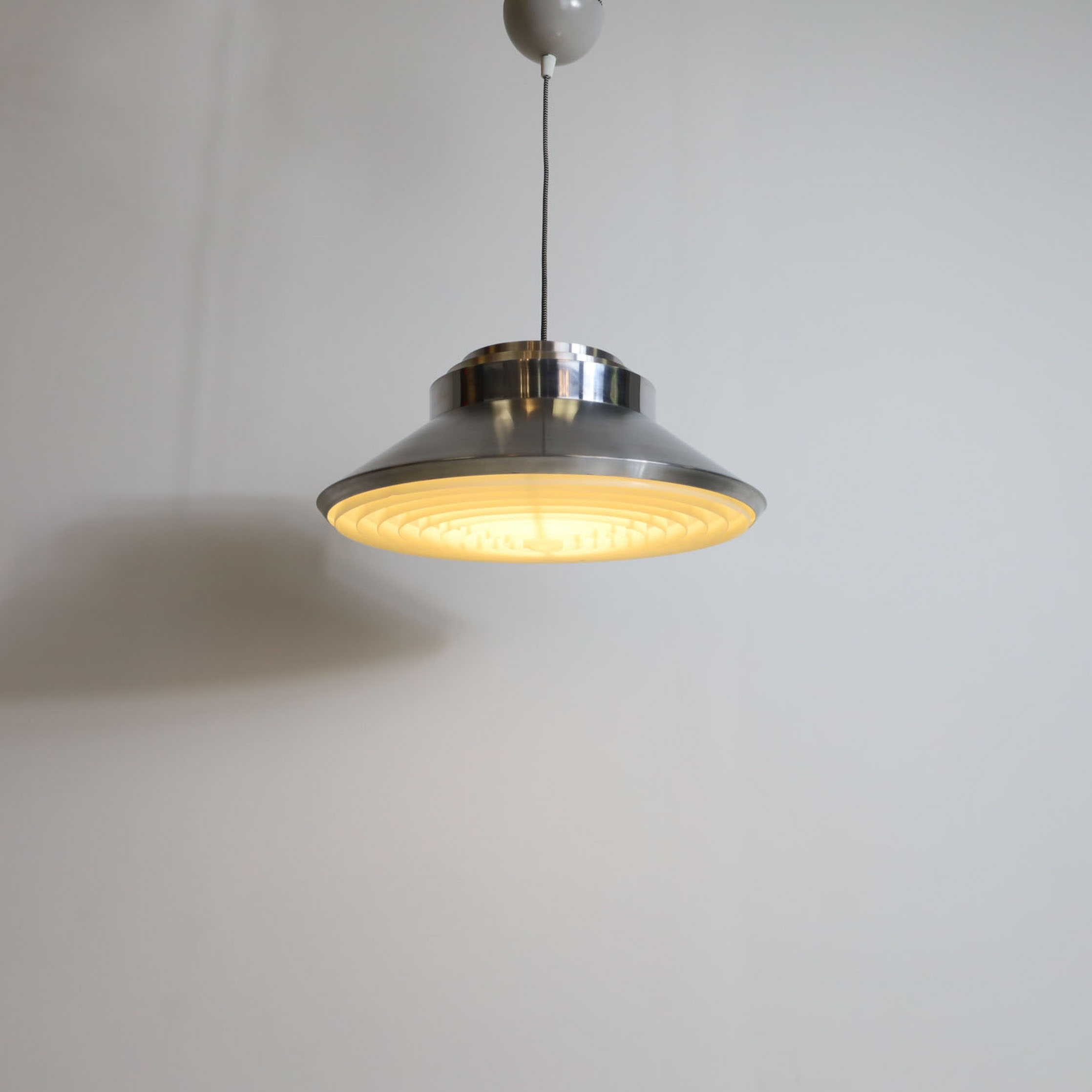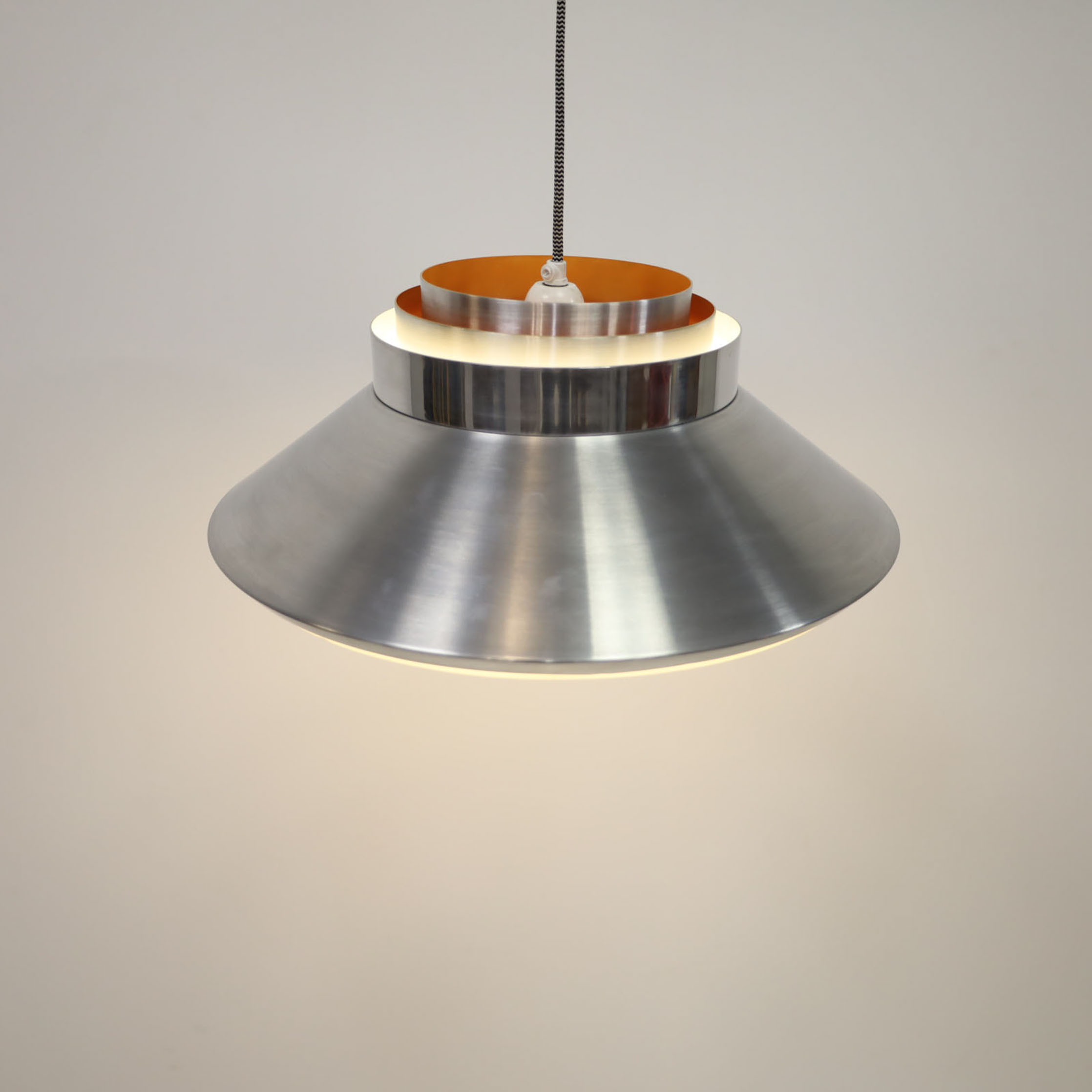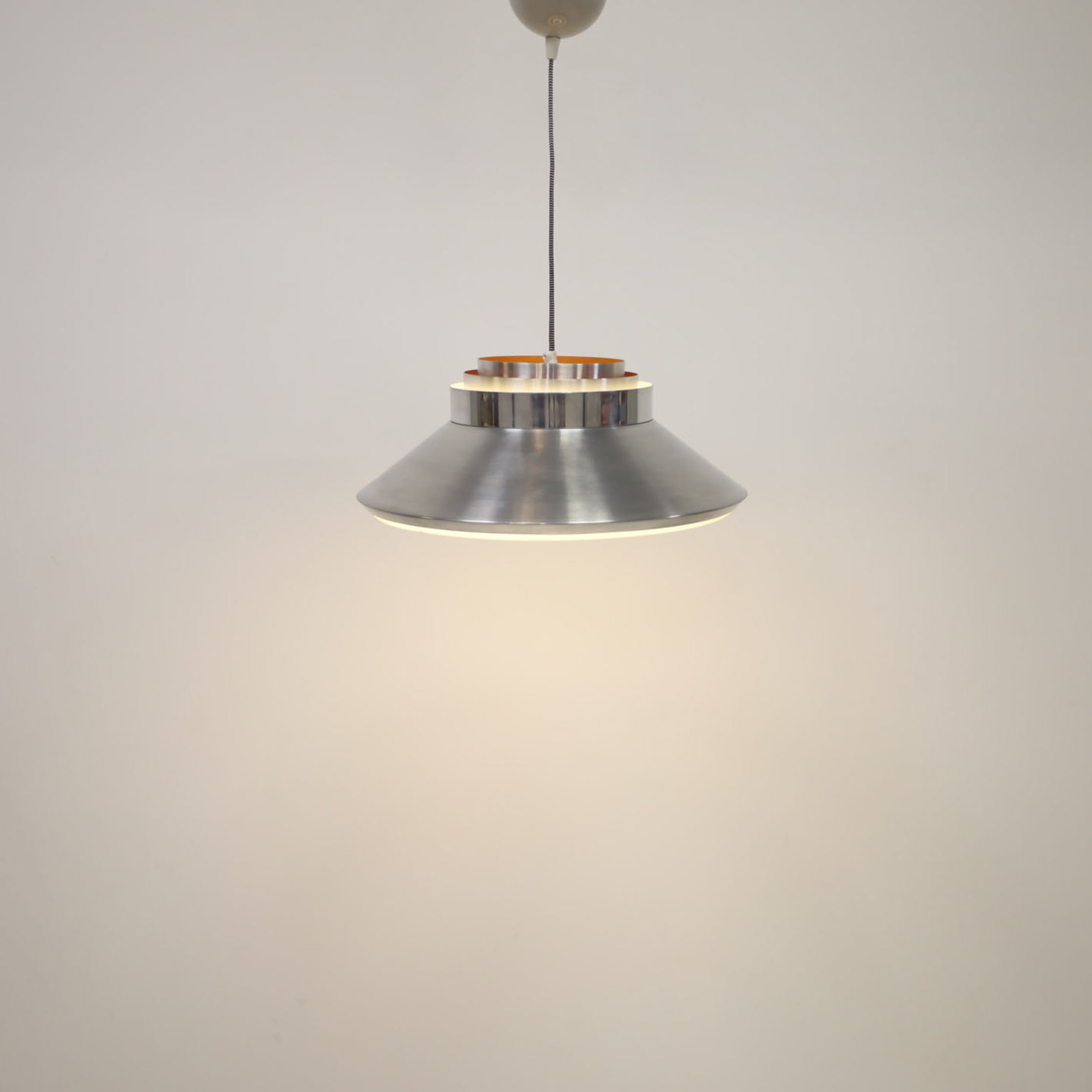 This pendant light is designed for the Swedish lighting company –Granhaga by Carl Thore (Sigurd Lindkvist). Featuring an aluminum structure and at the bottom the original diffuser grid (removable) which allows the light to spread smoother. The optical effect when the pendant is turned on is caused by the inner orange color of the two top rings spreading an orange glow around the top of the light.