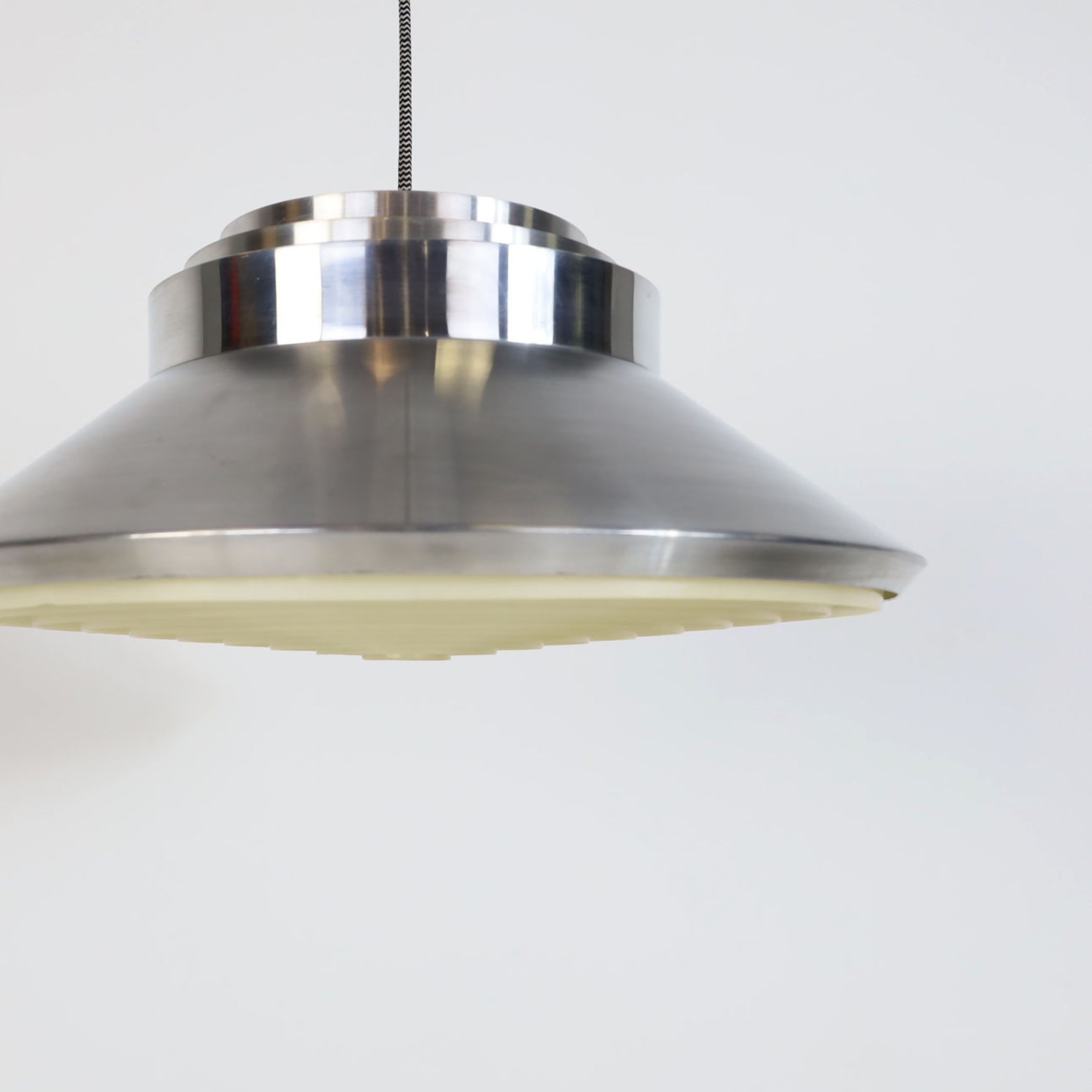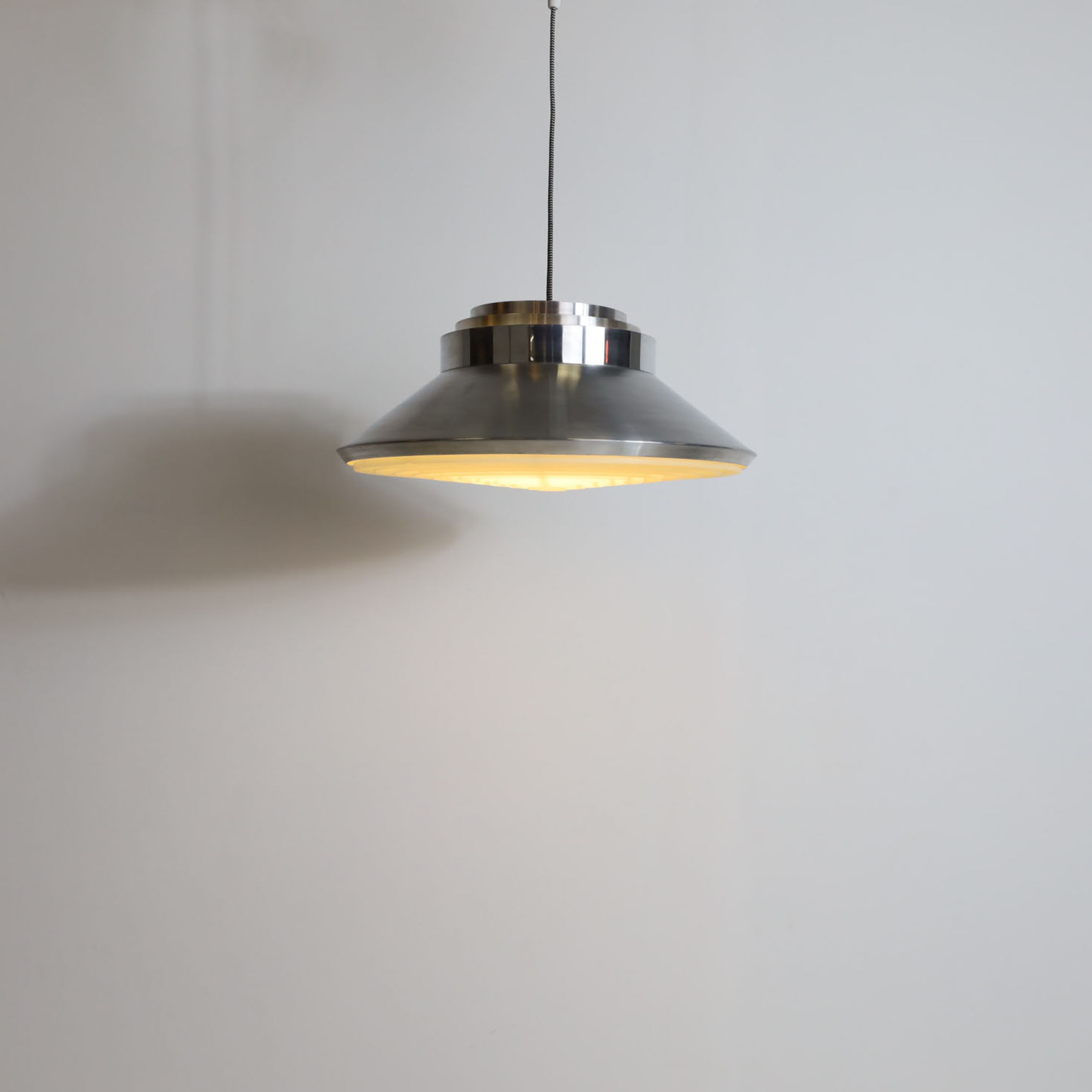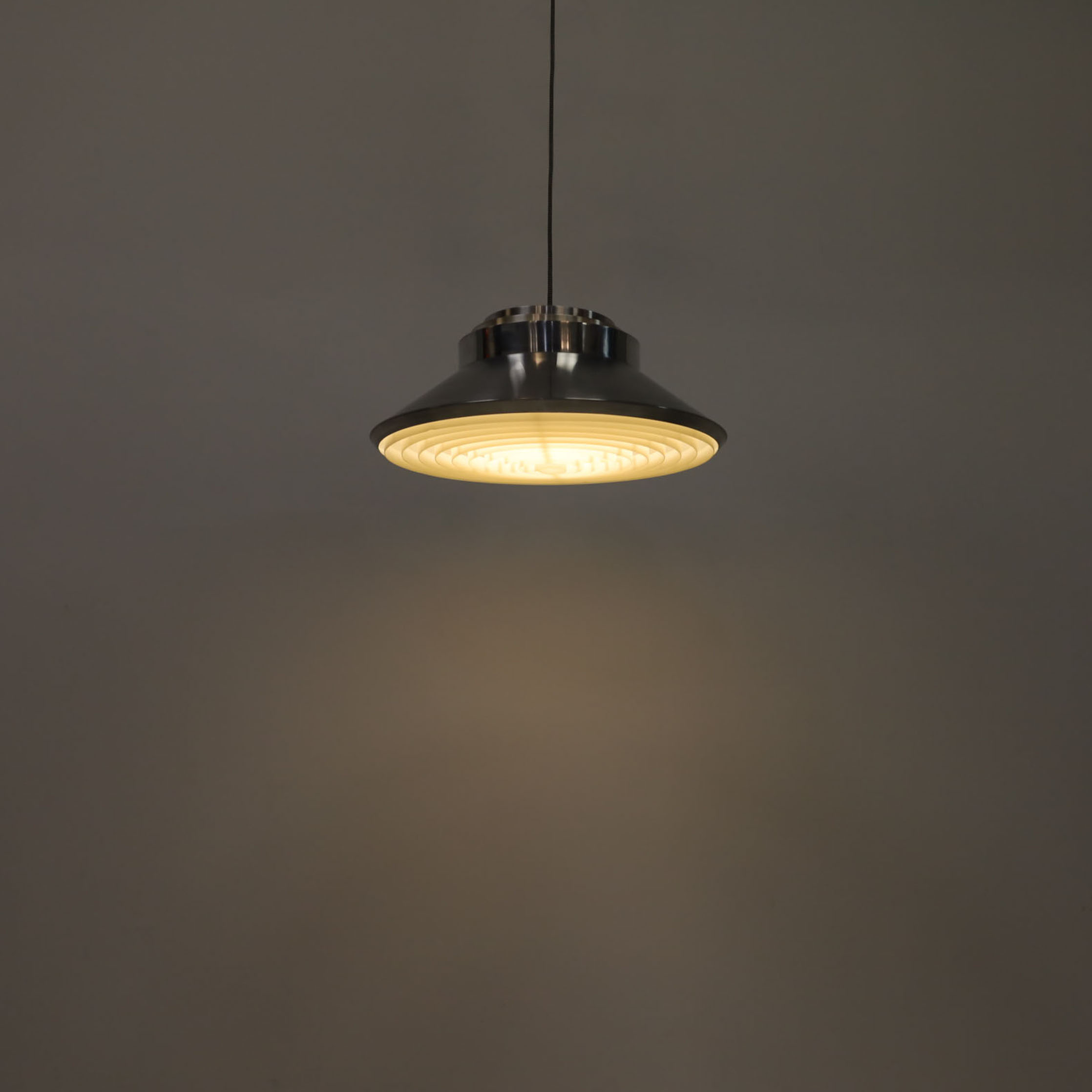 This pendant light is designed for the Swedish lighting company –Granhaga by Carl Thore (Sigurd Lindkvist). Featuring an aluminum structure and at the bottom the original diffuser grid (removable) which allows the light to spread smoother. The optical effect when the pendant is turned on is caused by the inner orange color of the two top rings spreading an orange glow around the top of the light.