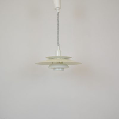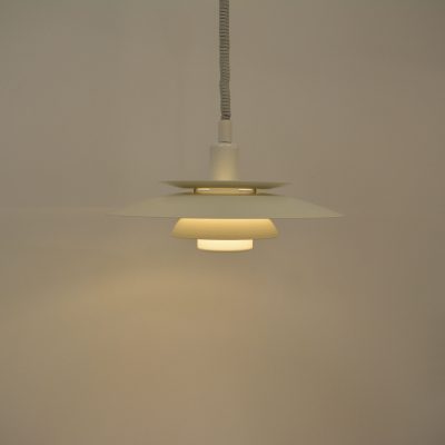 €520.00€390.00Danish pendant lamp, manufactured in Denmark by Simon P. Henningsen for Lyskær Belysning on four separate layers on a reflective multi-shade system with white scales on the underside so that the light distribution is soft and even. Features an easy-to-pull down and backward spiral cable which allows you to vary the intensity of the light at any time with simplicity. Fully remanufactured with LED technology, European Plug —In excellent vintage condition.