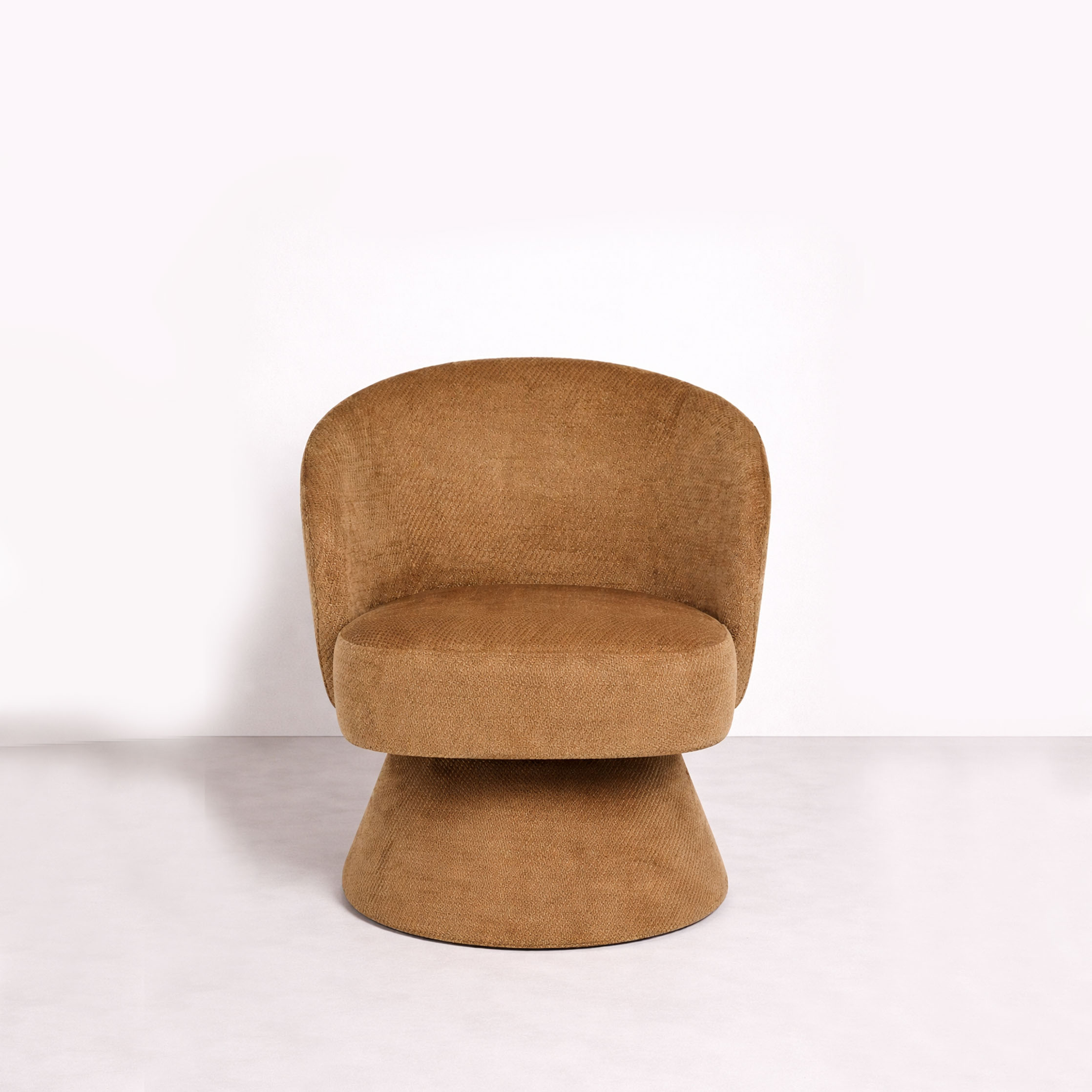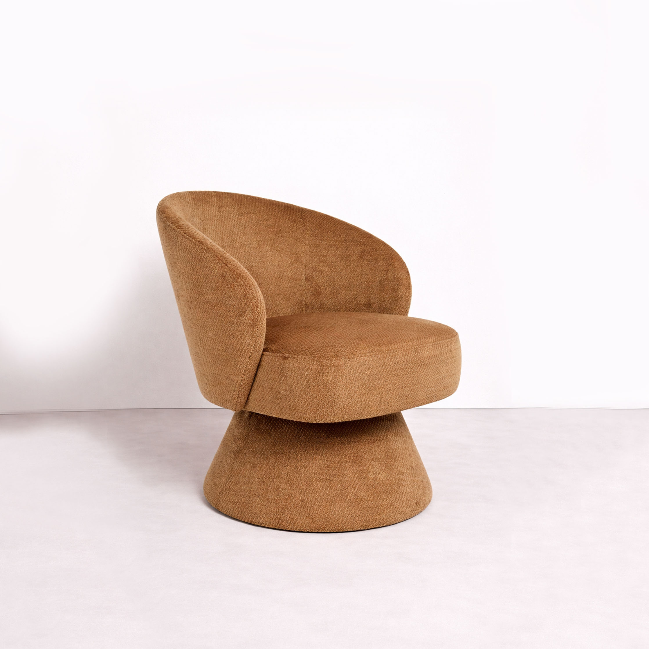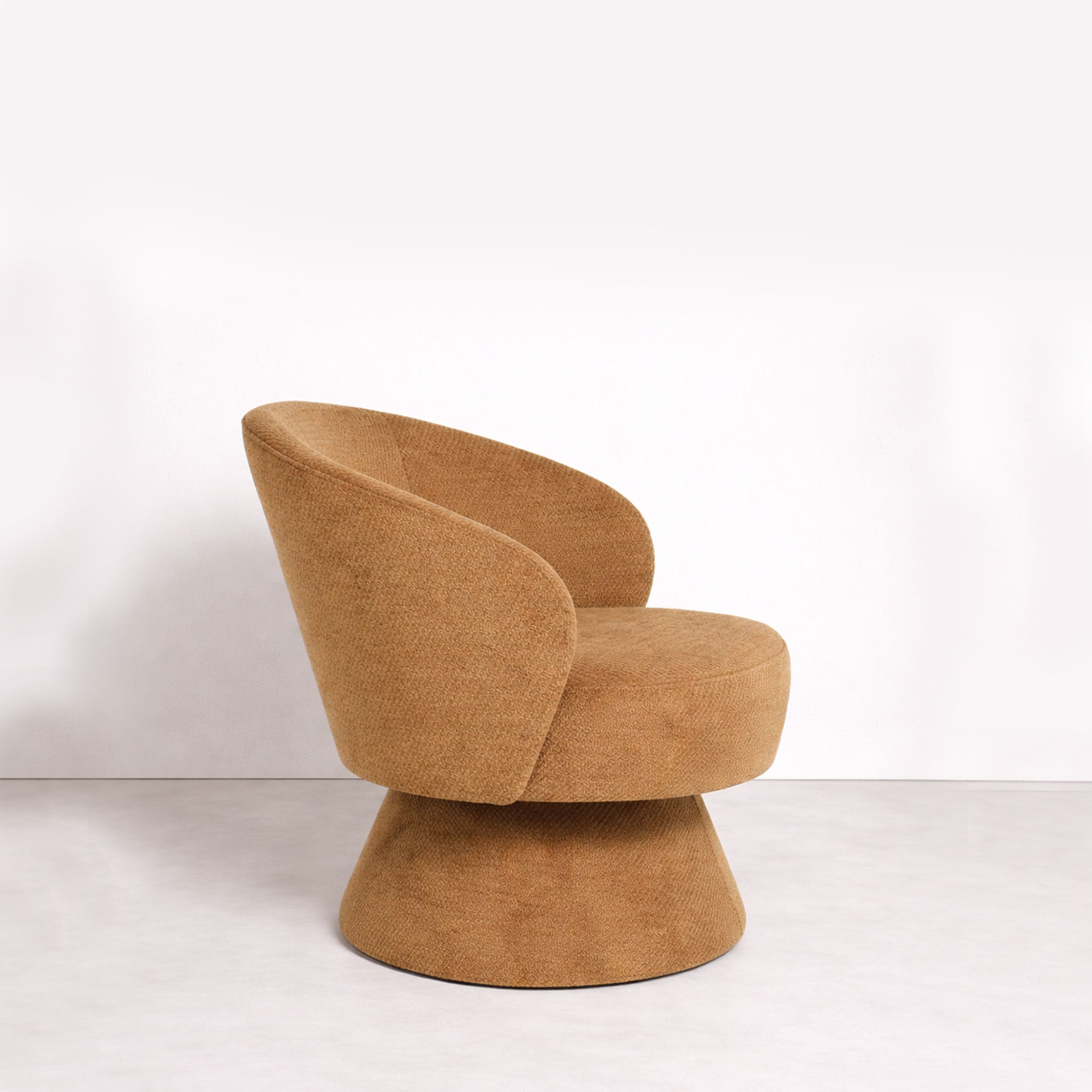 A sculptural swivel lounge chair with soft, continuous curves and a grounded pedestal base. Upholstered in textured camel fabric, it offers comfort, movement, and a strong visual presence in any modern interior.