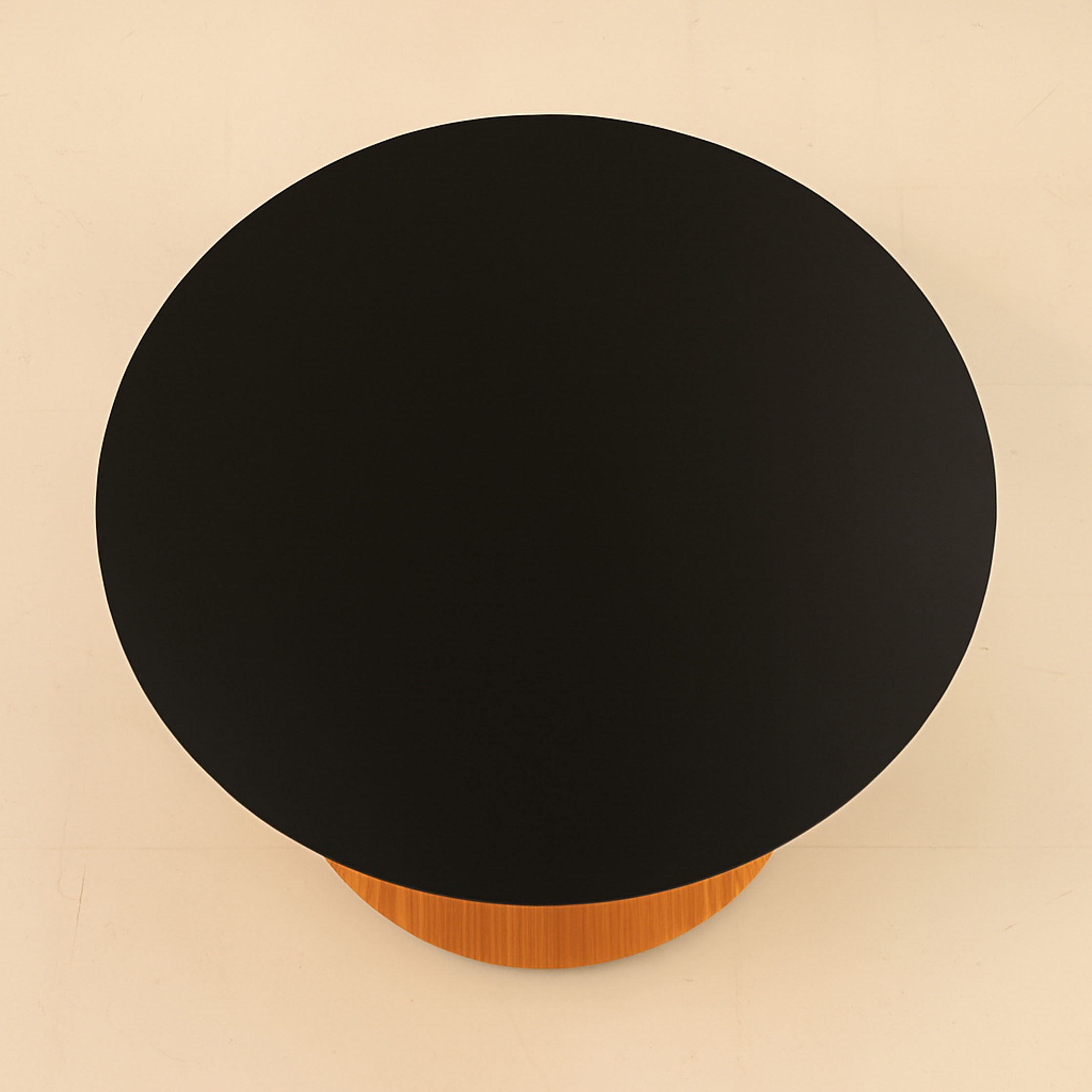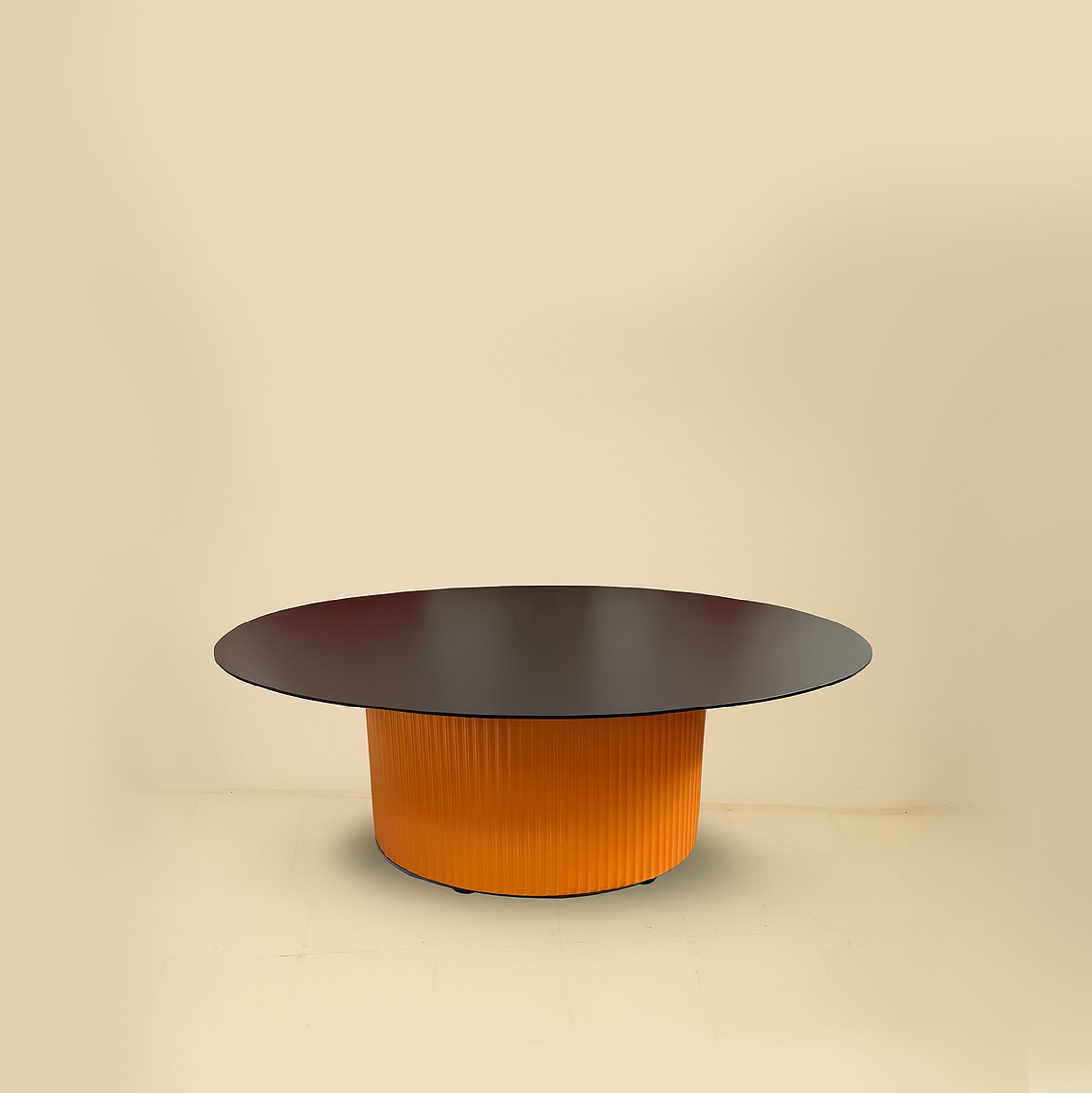 A round coffee table defined by its matte black top and ribbed cylindrical base in bright orange. The pleated surface adds movement and texture, while the bold contrast of colors brings a sculptural and contemporary character to any modern living space.