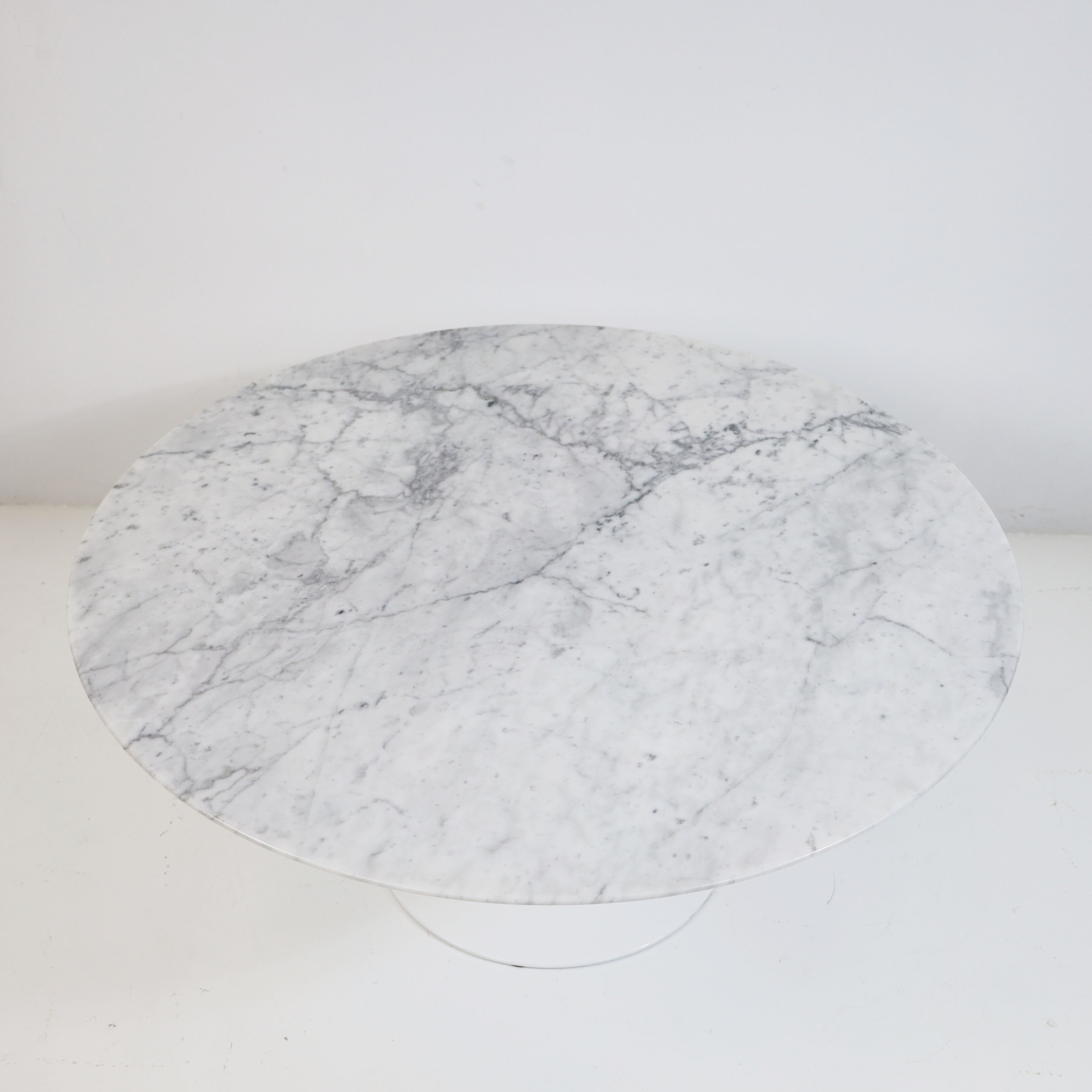 A timeless design piece. Featuring a pedestal base aluminum casting and a round bevel-edged top in white carrara. Made in Italy