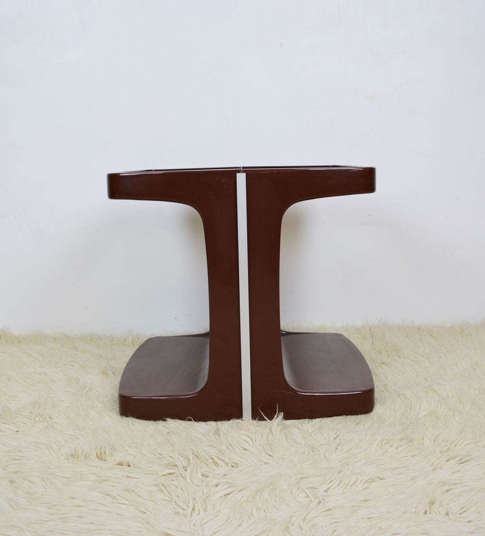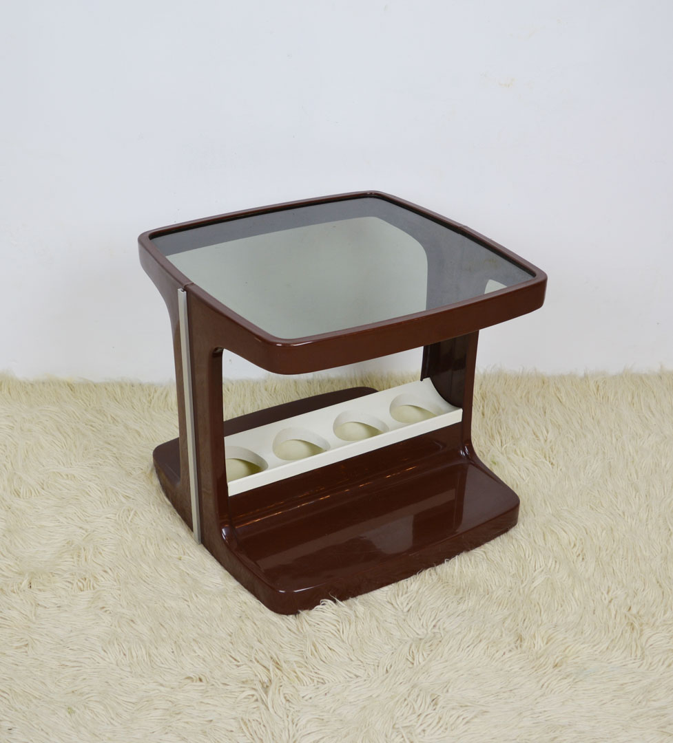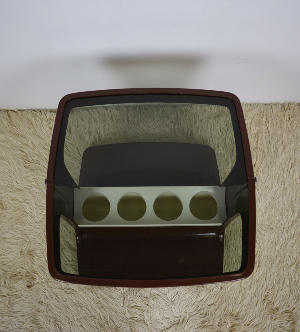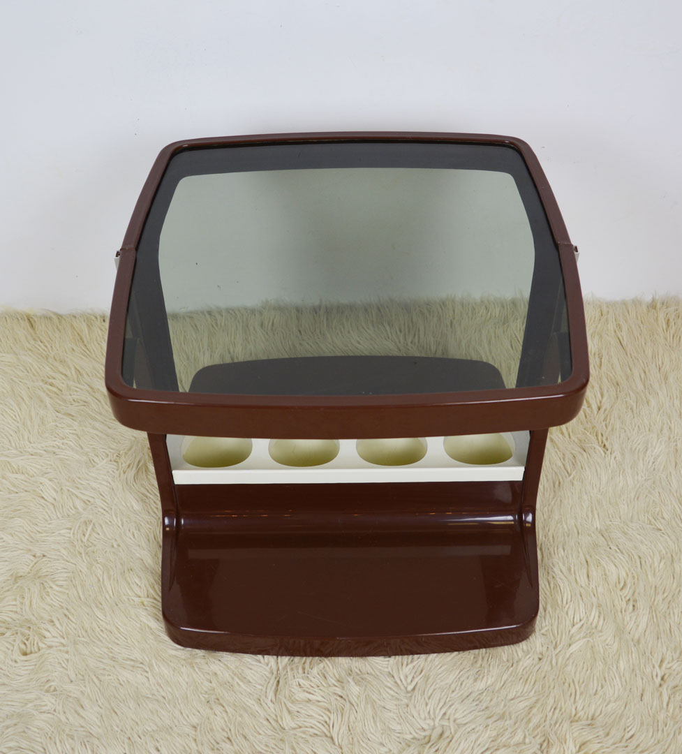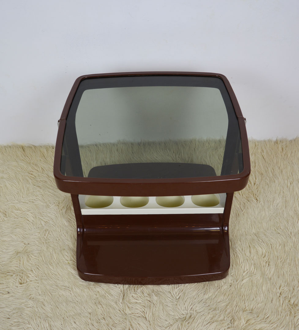 Mid-Century side plastic table which can be used as a bar also. It features a fume top glass and a bottle rack with four cases. In chocolate brown colour.
