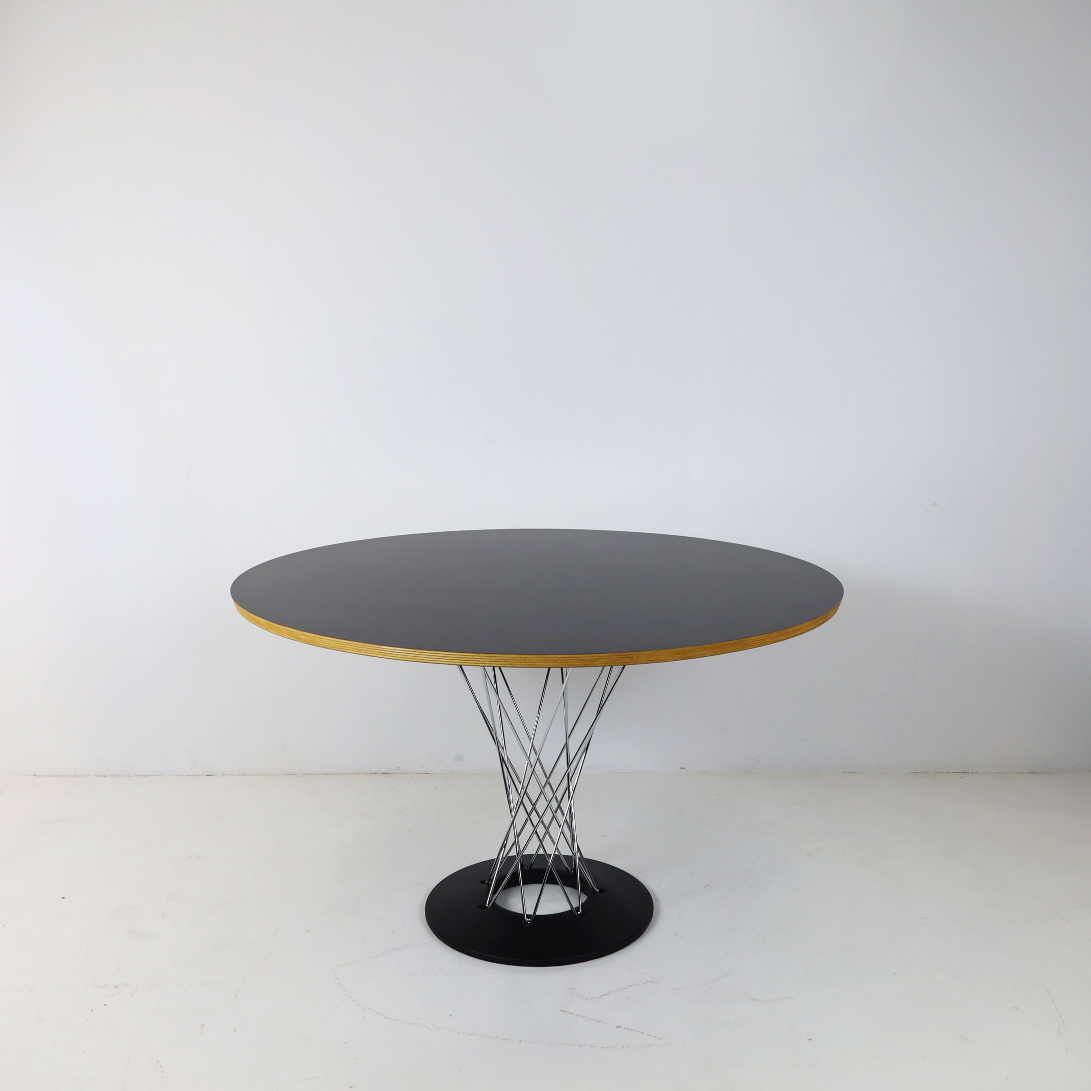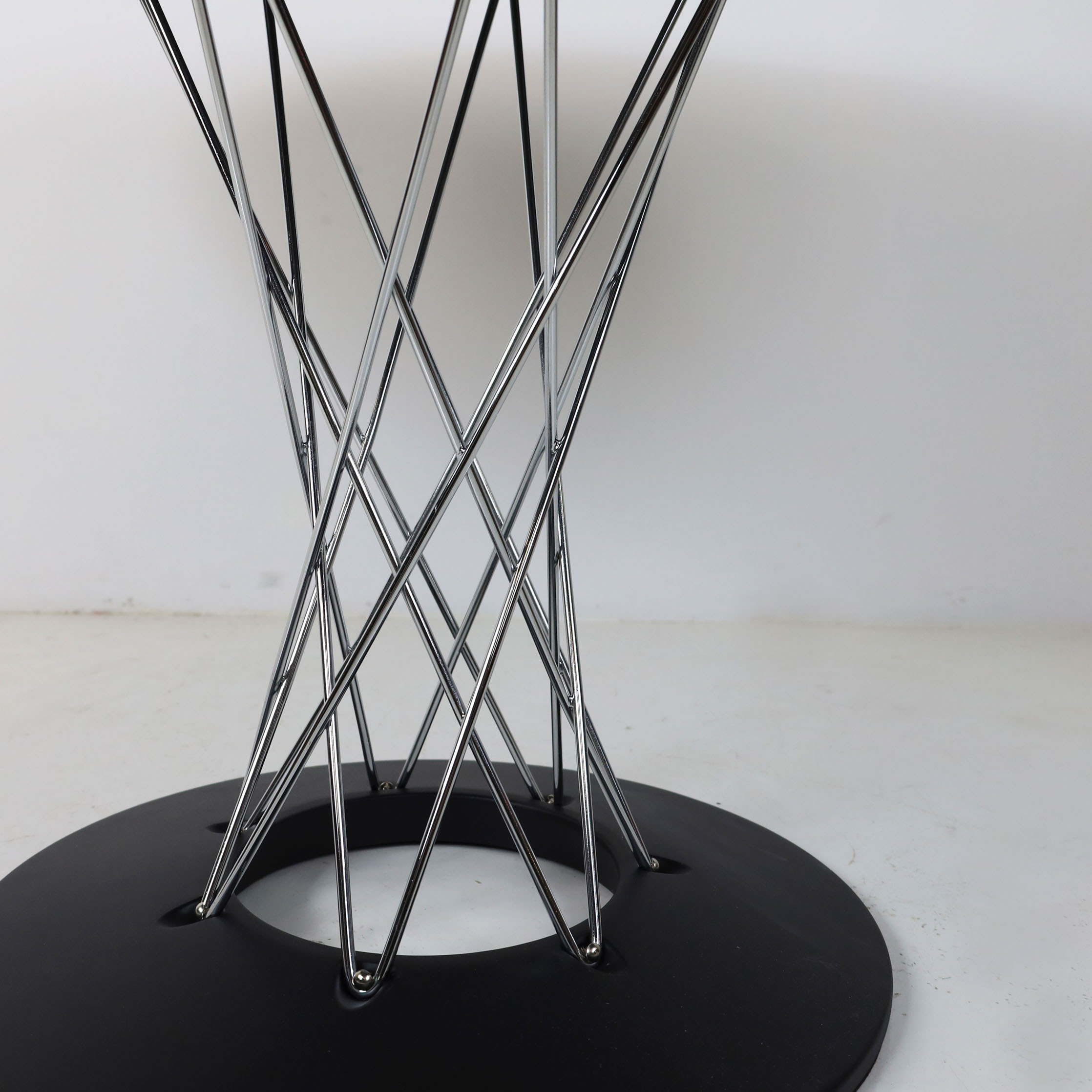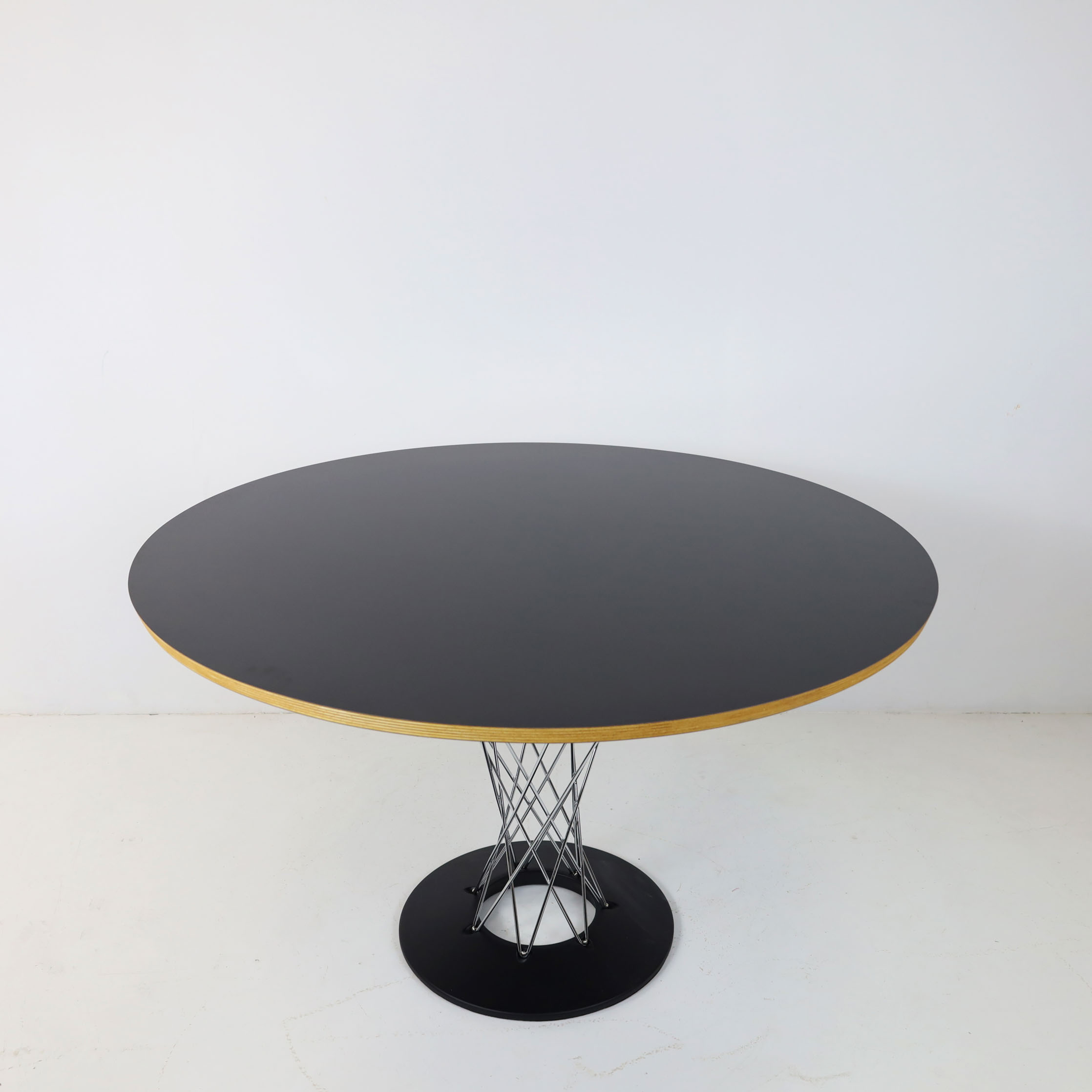 Modern sleek round dining table featuring a striking design. The table boasts a base crafted from black powder-coated steel, complemented by a column of chrome-plated steel wires. Its robust construction is crowned with a thick, round top made of durable black laminate, offering both classic style and enduring strength.